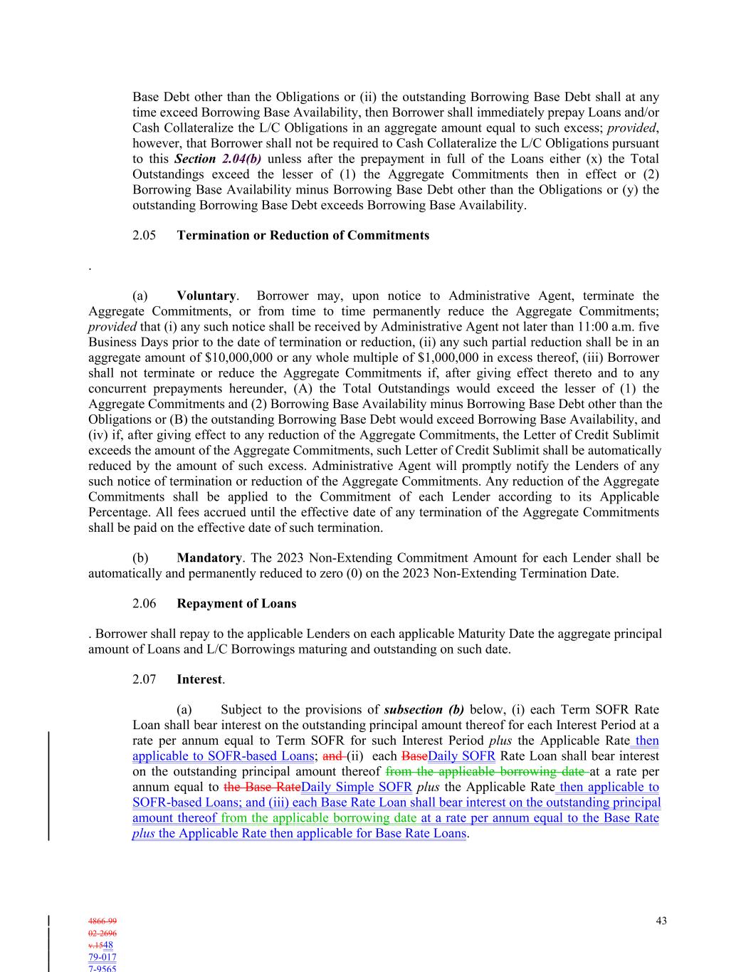 4866-99 02-2696 v.1548 79-017 7-9565 43 Base Debt other than the Obligations or (ii) the outstanding Borrowing Base Debt shall at any time exceed Borrowing Base Availability, then Borrower shall immediately prepay Loans and/or Cash Collateralize the L/C Obligations in an aggregate amount equal to such excess; provided, however, that Borrower shall not be required to Cash Collateralize the L/C Obligations pursuant to this Section 2.04(b) unless after the prepayment in full of the Loans either (x) the Total Outstandings exceed the lesser of (1) the Aggregate Commitments then in effect or (2) Borrowing Base Availability minus Borrowing Base Debt other than the Obligations or (y) the outstanding Borrowing Base Debt exceeds Borrowing Base Availability. 2.05 Termination or Reduction of Commitments . (a) Voluntary. Borrower may, upon notice to Administrative Agent, terminate the Aggregate Commitments, or from time to time permanently reduce the Aggregate Commitments; provided that (i) any such notice shall be received by Administrative Agent not later than 11:00 a.m. five Business Days prior to the date of termination or reduction, (ii) any such partial reduction shall be in an aggregate amount of $10,000,000 or any whole multiple of $1,000,000 in excess thereof, (iii) Borrower shall not terminate or reduce the Aggregate Commitments if, after giving effect thereto and to any concurrent prepayments hereunder, (A) the Total Outstandings would exceed the lesser of (1) the Aggregate Commitments and (2) Borrowing Base Availability minus Borrowing Base Debt other than the Obligations or (B) the outstanding Borrowing Base Debt would exceed Borrowing Base Availability, and (iv) if, after giving effect to any reduction of the Aggregate Commitments, the Letter of Credit Sublimit exceeds the amount of the Aggregate Commitments, such Letter of Credit Sublimit shall be automatically reduced by the amount of such excess. Administrative Agent will promptly notify the Lenders of any such notice of termination or reduction of the Aggregate Commitments. Any reduction of the Aggregate Commitments shall be applied to the Commitment of each Lender according to its Applicable Percentage. All fees accrued until the effective date of any termination of the Aggregate Commitments shall be paid on the effective date of such termination. (b) Mandatory. The 2023 Non-Extending Commitment Amount for each Lender shall be automatically and permanently reduced to zero (0) on the 2023 Non-Extending Termination Date. 2.06 Repayment of Loans . Borrower shall repay to the applicable Lenders on each applicable Maturity Date the aggregate principal amount of Loans and L/C Borrowings maturing and outstanding on such date. 2.07 Interest. (a) Subject to the provisions of subsection (b) below, (i) each Term SOFR Rate Loan shall bear interest on the outstanding principal amount thereof for each Interest Period at a rate per annum equal to Term SOFR for such Interest Period plus the Applicable Rate then applicable to SOFR-based Loans; and (ii) each BaseDaily SOFR Rate Loan shall bear interest on the outstanding principal amount thereof from the applicable borrowing date at a rate per annum equal to the Base RateDaily Simple SOFR plus the Applicable Rate then applicable to SOFR-based Loans; and (iii) each Base Rate Loan shall bear interest on the outstanding principal amount thereof from the applicable borrowing date at a rate per annum equal to the Base Rate plus the Applicable Rate then applicable for Base Rate Loans.