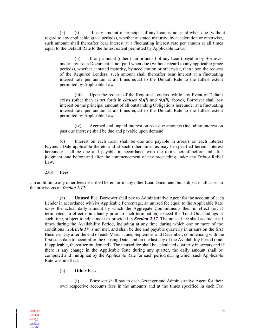 4866-99 02-2696 v.1548 79-017 7-9565 44 (b) (i) If any amount of principal of any Loan is not paid when due (without regard to any applicable grace periods), whether at stated maturity, by acceleration or otherwise, such amount shall thereafter bear interest at a fluctuating interest rate per annum at all times equal to the Default Rate to the fullest extent permitted by Applicable Laws. (ii) If any amount (other than principal of any Loan) payable by Borrower under any Loan Document is not paid when due (without regard to any applicable grace periods), whether at stated maturity, by acceleration or otherwise, then upon the request of the Required Lenders, such amount shall thereafter bear interest at a fluctuating interest rate per annum at all times equal to the Default Rate to the fullest extent permitted by Applicable Laws. (iii) Upon the request of the Required Lenders, while any Event of Default exists (other than as set forth in clauses (b)(i) and (b)(ii) above), Borrower shall pay interest on the principal amount of all outstanding Obligations hereunder at a fluctuating interest rate per annum at all times equal to the Default Rate to the fullest extent permitted by Applicable Laws. (iv) Accrued and unpaid interest on past due amounts (including interest on past due interest) shall be due and payable upon demand. (c) Interest on each Loan shall be due and payable in arrears on each Interest Payment Date applicable thereto and at such other times as may be specified herein. Interest hereunder shall be due and payable in accordance with the terms hereof before and after judgment, and before and after the commencement of any proceeding under any Debtor Relief Law. 2.08 Fees . In addition to any other fees described herein or in any other Loan Document, but subject in all cases to the provisions of Section 2.17: (a) Unused Fee. Borrower shall pay to Administrative Agent for the account of each Lender in accordance with its Applicable Percentage, an unused fee equal to the Applicable Rate times the actual daily amount by which the Aggregate Commitments then in effect (or, if terminated, in effect immediately prior to such termination) exceed the Total Outstandings at such time, subject to adjustment as provided in Section 2.17. The unused fee shall accrue at all times during the Availability Period, including at any time during which one or more of the conditions in Article IV is not met, and shall be due and payable quarterly in arrears on the first Business Day after the end of each March, June, September and December, commencing with the first such date to occur after the Closing Date, and on the last day of the Availability Period (and, if applicable, thereafter on demand). The unused fee shall be calculated quarterly in arrears and if there is any change in the Applicable Rate during any quarter, the daily amount shall be computed and multiplied by the Applicable Rate for each period during which such Applicable Rate was in effect. (b) Other Fees. (i) Borrower shall pay to each Arranger and Administrative Agent for their own respective accounts fees in the amounts and at the times specified in each Fee