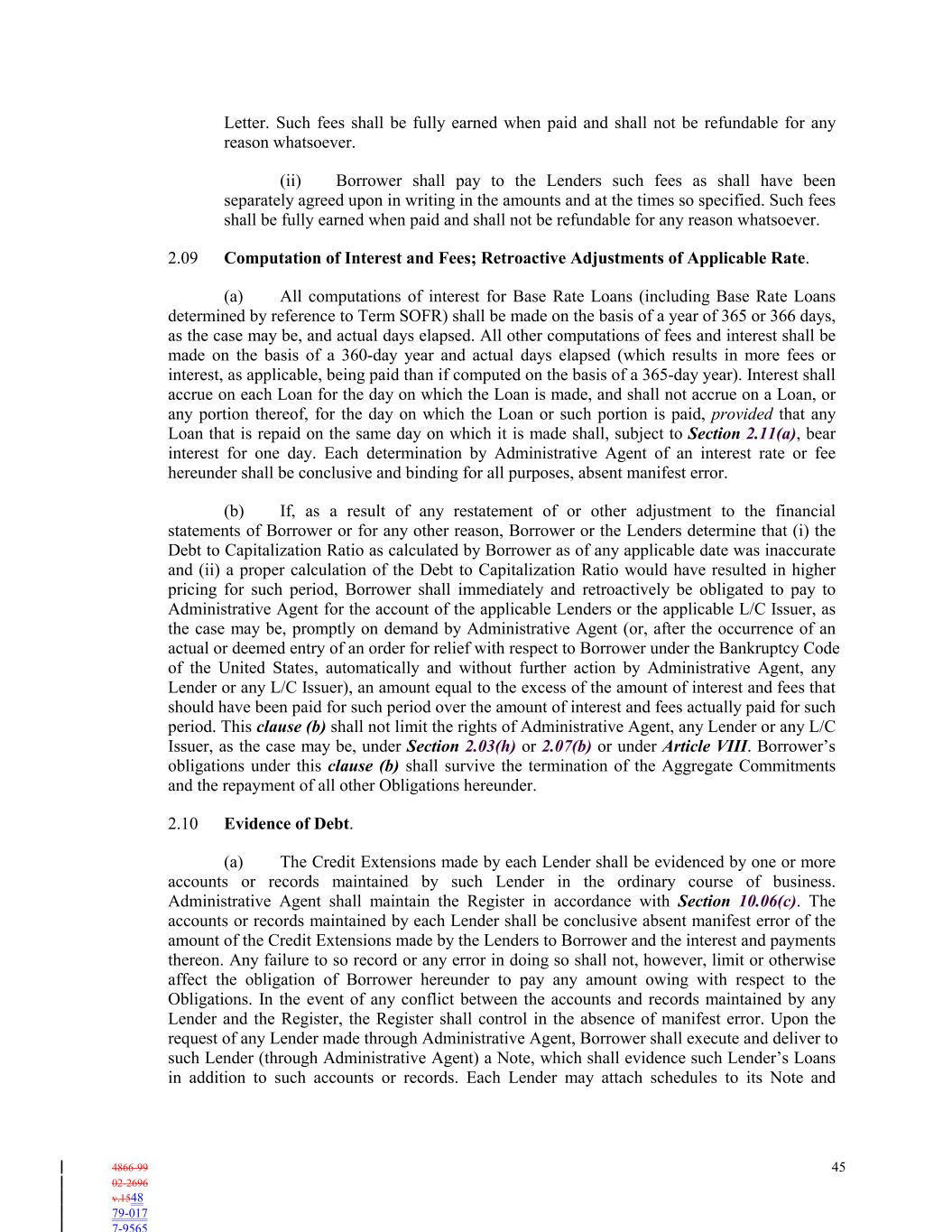 4866-99 02-2696 v.1548 79-017 7-9565 45 Letter. Such fees shall be fully earned when paid and shall not be refundable for any reason whatsoever. (ii) Borrower shall pay to the Lenders such fees as shall have been separately agreed upon in writing in the amounts and at the times so specified. Such fees shall be fully earned when paid and shall not be refundable for any reason whatsoever. 2.09 Computation of Interest and Fees; Retroactive Adjustments of Applicable Rate. (a) All computations of interest for Base Rate Loans (including Base Rate Loans determined by reference to Term SOFR) shall be made on the basis of a year of 365 or 366 days, as the case may be, and actual days elapsed. All other computations of fees and interest shall be made on the basis of a 360-day year and actual days elapsed (which results in more fees or interest, as applicable, being paid than if computed on the basis of a 365-day year). Interest shall accrue on each Loan for the day on which the Loan is made, and shall not accrue on a Loan, or any portion thereof, for the day on which the Loan or such portion is paid, provided that any Loan that is repaid on the same day on which it is made shall, subject to Section 2.11(a), bear interest for one day. Each determination by Administrative Agent of an interest rate or fee hereunder shall be conclusive and binding for all purposes, absent manifest error. (b) If, as a result of any restatement of or other adjustment to the financial statements of Borrower or for any other reason, Borrower or the Lenders determine that (i) the Debt to Capitalization Ratio as calculated by Borrower as of any applicable date was inaccurate and (ii) a proper calculation of the Debt to Capitalization Ratio would have resulted in higher pricing for such period, Borrower shall immediately and retroactively be obligated to pay to Administrative Agent for the account of the applicable Lenders or the applicable L/C Issuer, as the case may be, promptly on demand by Administrative Agent (or, after the occurrence of an actual or deemed entry of an order for relief with respect to Borrower under the Bankruptcy Code of the United States, automatically and without further action by Administrative Agent, any Lender or any L/C Issuer), an amount equal to the excess of the amount of interest and fees that should have been paid for such period over the amount of interest and fees actually paid for such period. This clause (b) shall not limit the rights of Administrative Agent, any Lender or any L/C Issuer, as the case may be, under Section 2.03(h) or 2.07(b) or under Article VIII. Borrower’s obligations under this clause (b) shall survive the termination of the Aggregate Commitments and the repayment of all other Obligations hereunder. 2.10 Evidence of Debt. (a) The Credit Extensions made by each Lender shall be evidenced by one or more accounts or records maintained by such Lender in the ordinary course of business. Administrative Agent shall maintain the Register in accordance with Section 10.06(c). The accounts or records maintained by each Lender shall be conclusive absent manifest error of the amount of the Credit Extensions made by the Lenders to Borrower and the interest and payments thereon. Any failure to so record or any error in doing so shall not, however, limit or otherwise affect the obligation of Borrower hereunder to pay any amount owing with respect to the Obligations. In the event of any conflict between the accounts and records maintained by any Lender and the Register, the Register shall control in the absence of manifest error. Upon the request of any Lender made through Administrative Agent, Borrower shall execute and deliver to such Lender (through Administrative Agent) a Note, which shall evidence such Lender’s Loans in addition to such accounts or records. Each Lender may attach schedules to its Note and