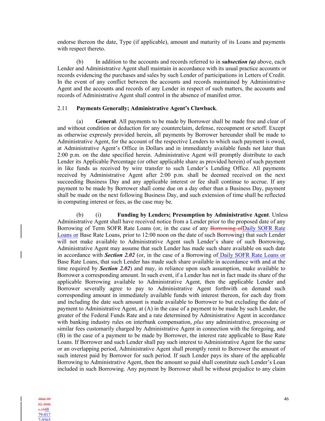 4866-99 02-2696 v.1548 79-017 7-9565 46 endorse thereon the date, Type (if applicable), amount and maturity of its Loans and payments with respect thereto. (b) In addition to the accounts and records referred to in subsection (a) above, each Lender and Administrative Agent shall maintain in accordance with its usual practice accounts or records evidencing the purchases and sales by such Lender of participations in Letters of Credit. In the event of any conflict between the accounts and records maintained by Administrative Agent and the accounts and records of any Lender in respect of such matters, the accounts and records of Administrative Agent shall control in the absence of manifest error. 2.11 Payments Generally; Administrative Agent’s Clawback. (a) General. All payments to be made by Borrower shall be made free and clear of and without condition or deduction for any counterclaim, defense, recoupment or setoff. Except as otherwise expressly provided herein, all payments by Borrower hereunder shall be made to Administrative Agent, for the account of the respective Lenders to which such payment is owed, at Administrative Agent’s Office in Dollars and in immediately available funds not later than 2:00 p.m. on the date specified herein. Administrative Agent will promptly distribute to each Lender its Applicable Percentage (or other applicable share as provided herein) of such payment in like funds as received by wire transfer to such Lender’s Lending Office. All payments received by Administrative Agent after 2:00 p.m. shall be deemed received on the next succeeding Business Day and any applicable interest or fee shall continue to accrue. If any payment to be made by Borrower shall come due on a day other than a Business Day, payment shall be made on the next following Business Day, and such extension of time shall be reflected in computing interest or fees, as the case may be. (b) (i) Funding by Lenders; Presumption by Administrative Agent. Unless Administrative Agent shall have received notice from a Lender prior to the proposed date of any Borrowing of Term SOFR Rate Loans (or, in the case of any Borrowing ofDaily SOFR Rate Loans or Base Rate Loans, prior to 12:00 noon on the date of such Borrowing) that such Lender will not make available to Administrative Agent such Lender’s share of such Borrowing, Administrative Agent may assume that such Lender has made such share available on such date in accordance with Section 2.02 (or, in the case of a Borrowing of Daily SOFR Rate Loans or Base Rate Loans, that such Lender has made such share available in accordance with and at the time required by Section 2.02) and may, in reliance upon such assumption, make available to Borrower a corresponding amount. In such event, if a Lender has not in fact made its share of the applicable Borrowing available to Administrative Agent, then the applicable Lender and Borrower severally agree to pay to Administrative Agent forthwith on demand such corresponding amount in immediately available funds with interest thereon, for each day from and including the date such amount is made available to Borrower to but excluding the date of payment to Administrative Agent, at (A) in the case of a payment to be made by such Lender, the greater of the Federal Funds Rate and a rate determined by Administrative Agent in accordance with banking industry rules on interbank compensation, plus any administrative, processing or similar fees customarily charged by Administrative Agent in connection with the foregoing, and (B) in the case of a payment to be made by Borrower, the interest rate applicable to Base Rate Loans. If Borrower and such Lender shall pay such interest to Administrative Agent for the same or an overlapping period, Administrative Agent shall promptly remit to Borrower the amount of such interest paid by Borrower for such period. If such Lender pays its share of the applicable Borrowing to Administrative Agent, then the amount so paid shall constitute such Lender’s Loan included in such Borrowing. Any payment by Borrower shall be without prejudice to any claim