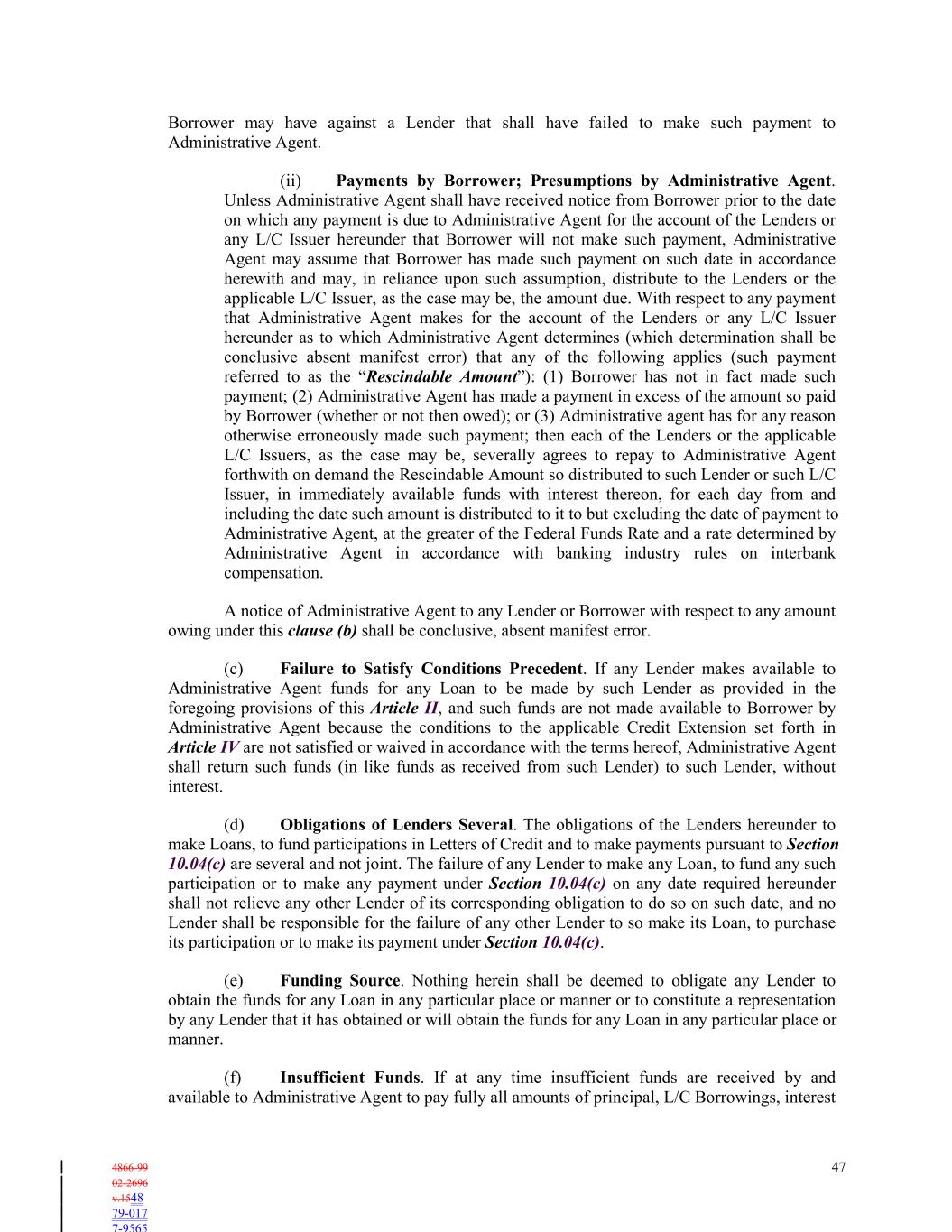 4866-99 02-2696 v.1548 79-017 7-9565 47 Borrower may have against a Lender that shall have failed to make such payment to Administrative Agent. (ii) Payments by Borrower; Presumptions by Administrative Agent. Unless Administrative Agent shall have received notice from Borrower prior to the date on which any payment is due to Administrative Agent for the account of the Lenders or any L/C Issuer hereunder that Borrower will not make such payment, Administrative Agent may assume that Borrower has made such payment on such date in accordance herewith and may, in reliance upon such assumption, distribute to the Lenders or the applicable L/C Issuer, as the case may be, the amount due. With respect to any payment that Administrative Agent makes for the account of the Lenders or any L/C Issuer hereunder as to which Administrative Agent determines (which determination shall be conclusive absent manifest error) that any of the following applies (such payment referred to as the “Rescindable Amount”): (1) Borrower has not in fact made such payment; (2) Administrative Agent has made a payment in excess of the amount so paid by Borrower (whether or not then owed); or (3) Administrative agent has for any reason otherwise erroneously made such payment; then each of the Lenders or the applicable L/C Issuers, as the case may be, severally agrees to repay to Administrative Agent forthwith on demand the Rescindable Amount so distributed to such Lender or such L/C Issuer, in immediately available funds with interest thereon, for each day from and including the date such amount is distributed to it to but excluding the date of payment to Administrative Agent, at the greater of the Federal Funds Rate and a rate determined by Administrative Agent in accordance with banking industry rules on interbank compensation. A notice of Administrative Agent to any Lender or Borrower with respect to any amount owing under this clause (b) shall be conclusive, absent manifest error. (c) Failure to Satisfy Conditions Precedent. If any Lender makes available to Administrative Agent funds for any Loan to be made by such Lender as provided in the foregoing provisions of this Article II, and such funds are not made available to Borrower by Administrative Agent because the conditions to the applicable Credit Extension set forth in Article IV are not satisfied or waived in accordance with the terms hereof, Administrative Agent shall return such funds (in like funds as received from such Lender) to such Lender, without interest. (d) Obligations of Lenders Several. The obligations of the Lenders hereunder to make Loans, to fund participations in Letters of Credit and to make payments pursuant to Section 10.04(c) are several and not joint. The failure of any Lender to make any Loan, to fund any such participation or to make any payment under Section 10.04(c) on any date required hereunder shall not relieve any other Lender of its corresponding obligation to do so on such date, and no Lender shall be responsible for the failure of any other Lender to so make its Loan, to purchase its participation or to make its payment under Section 10.04(c). (e) Funding Source. Nothing herein shall be deemed to obligate any Lender to obtain the funds for any Loan in any particular place or manner or to constitute a representation by any Lender that it has obtained or will obtain the funds for any Loan in any particular place or manner. (f) Insufficient Funds. If at any time insufficient funds are received by and available to Administrative Agent to pay fully all amounts of principal, L/C Borrowings, interest