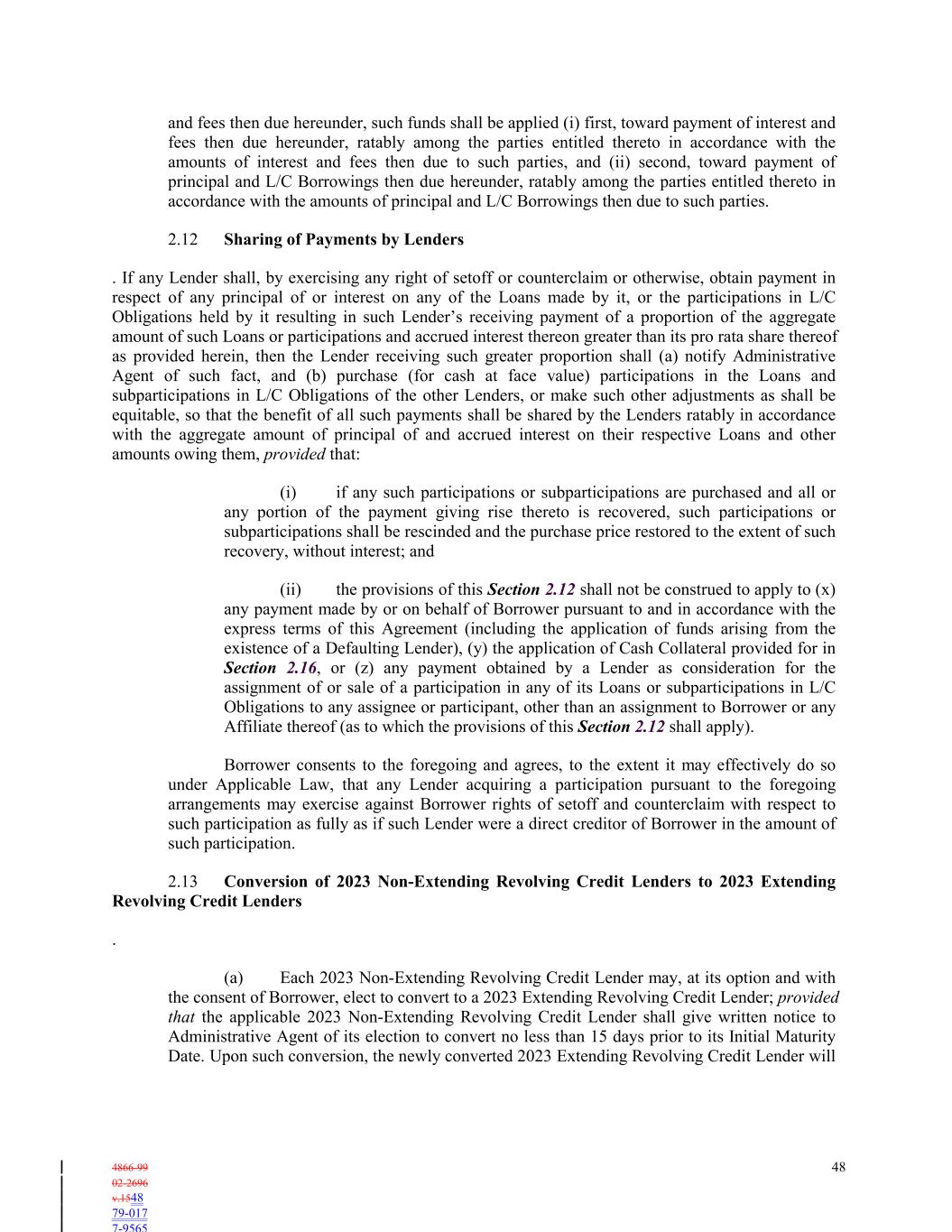 4866-99 02-2696 v.1548 79-017 7-9565 48 and fees then due hereunder, such funds shall be applied (i) first, toward payment of interest and fees then due hereunder, ratably among the parties entitled thereto in accordance with the amounts of interest and fees then due to such parties, and (ii) second, toward payment of principal and L/C Borrowings then due hereunder, ratably among the parties entitled thereto in accordance with the amounts of principal and L/C Borrowings then due to such parties. 2.12 Sharing of Payments by Lenders . If any Lender shall, by exercising any right of setoff or counterclaim or otherwise, obtain payment in respect of any principal of or interest on any of the Loans made by it, or the participations in L/C Obligations held by it resulting in such Lender’s receiving payment of a proportion of the aggregate amount of such Loans or participations and accrued interest thereon greater than its pro rata share thereof as provided herein, then the Lender receiving such greater proportion shall (a) notify Administrative Agent of such fact, and (b) purchase (for cash at face value) participations in the Loans and subparticipations in L/C Obligations of the other Lenders, or make such other adjustments as shall be equitable, so that the benefit of all such payments shall be shared by the Lenders ratably in accordance with the aggregate amount of principal of and accrued interest on their respective Loans and other amounts owing them, provided that: (i) if any such participations or subparticipations are purchased and all or any portion of the payment giving rise thereto is recovered, such participations or subparticipations shall be rescinded and the purchase price restored to the extent of such recovery, without interest; and (ii) the provisions of this Section 2.12 shall not be construed to apply to (x) any payment made by or on behalf of Borrower pursuant to and in accordance with the express terms of this Agreement (including the application of funds arising from the existence of a Defaulting Lender), (y) the application of Cash Collateral provided for in Section 2.16, or (z) any payment obtained by a Lender as consideration for the assignment of or sale of a participation in any of its Loans or subparticipations in L/C Obligations to any assignee or participant, other than an assignment to Borrower or any Affiliate thereof (as to which the provisions of this Section 2.12 shall apply). Borrower consents to the foregoing and agrees, to the extent it may effectively do so under Applicable Law, that any Lender acquiring a participation pursuant to the foregoing arrangements may exercise against Borrower rights of setoff and counterclaim with respect to such participation as fully as if such Lender were a direct creditor of Borrower in the amount of such participation. 2.13 Conversion of 2023 Non-Extending Revolving Credit Lenders to 2023 Extending Revolving Credit Lenders . (a) Each 2023 Non-Extending Revolving Credit Lender may, at its option and with the consent of Borrower, elect to convert to a 2023 Extending Revolving Credit Lender; provided that the applicable 2023 Non-Extending Revolving Credit Lender shall give written notice to Administrative Agent of its election to convert no less than 15 days prior to its Initial Maturity Date. Upon such conversion, the newly converted 2023 Extending Revolving Credit Lender will