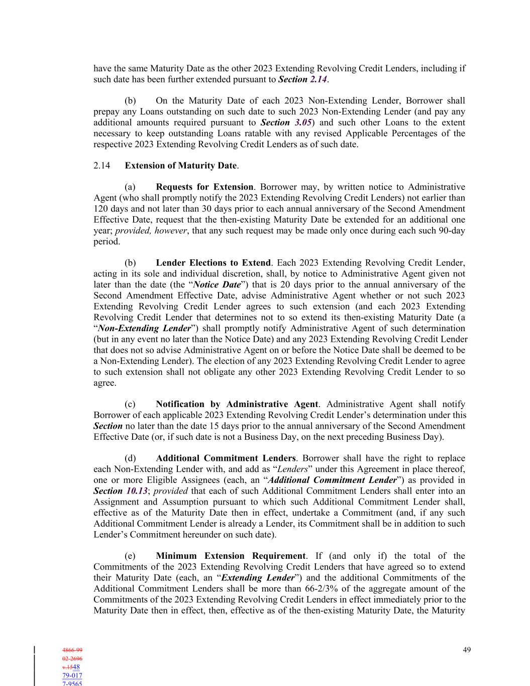 4866-99 02-2696 v.1548 79-017 7-9565 49 have the same Maturity Date as the other 2023 Extending Revolving Credit Lenders, including if such date has been further extended pursuant to Section 2.14. (b) On the Maturity Date of each 2023 Non-Extending Lender, Borrower shall prepay any Loans outstanding on such date to such 2023 Non-Extending Lender (and pay any additional amounts required pursuant to Section 3.05) and such other Loans to the extent necessary to keep outstanding Loans ratable with any revised Applicable Percentages of the respective 2023 Extending Revolving Credit Lenders as of such date. 2.14 Extension of Maturity Date. (a) Requests for Extension. Borrower may, by written notice to Administrative Agent (who shall promptly notify the 2023 Extending Revolving Credit Lenders) not earlier than 120 days and not later than 30 days prior to each annual anniversary of the Second Amendment Effective Date, request that the then-existing Maturity Date be extended for an additional one year; provided, however, that any such request may be made only once during each such 90-day period. (b) Lender Elections to Extend. Each 2023 Extending Revolving Credit Lender, acting in its sole and individual discretion, shall, by notice to Administrative Agent given not later than the date (the “Notice Date”) that is 20 days prior to the annual anniversary of the Second Amendment Effective Date, advise Administrative Agent whether or not such 2023 Extending Revolving Credit Lender agrees to such extension (and each 2023 Extending Revolving Credit Lender that determines not to so extend its then-existing Maturity Date (a “Non-Extending Lender”) shall promptly notify Administrative Agent of such determination (but in any event no later than the Notice Date) and any 2023 Extending Revolving Credit Lender that does not so advise Administrative Agent on or before the Notice Date shall be deemed to be a Non-Extending Lender). The election of any 2023 Extending Revolving Credit Lender to agree to such extension shall not obligate any other 2023 Extending Revolving Credit Lender to so agree. (c) Notification by Administrative Agent. Administrative Agent shall notify Borrower of each applicable 2023 Extending Revolving Credit Lender’s determination under this Section no later than the date 15 days prior to the annual anniversary of the Second Amendment Effective Date (or, if such date is not a Business Day, on the next preceding Business Day). (d) Additional Commitment Lenders. Borrower shall have the right to replace each Non-Extending Lender with, and add as “Lenders” under this Agreement in place thereof, one or more Eligible Assignees (each, an “Additional Commitment Lender”) as provided in Section 10.13; provided that each of such Additional Commitment Lenders shall enter into an Assignment and Assumption pursuant to which such Additional Commitment Lender shall, effective as of the Maturity Date then in effect, undertake a Commitment (and, if any such Additional Commitment Lender is already a Lender, its Commitment shall be in addition to such Lender’s Commitment hereunder on such date). (e) Minimum Extension Requirement. If (and only if) the total of the Commitments of the 2023 Extending Revolving Credit Lenders that have agreed so to extend their Maturity Date (each, an “Extending Lender”) and the additional Commitments of the Additional Commitment Lenders shall be more than 66-2/3% of the aggregate amount of the Commitments of the 2023 Extending Revolving Credit Lenders in effect immediately prior to the Maturity Date then in effect, then, effective as of the then-existing Maturity Date, the Maturity