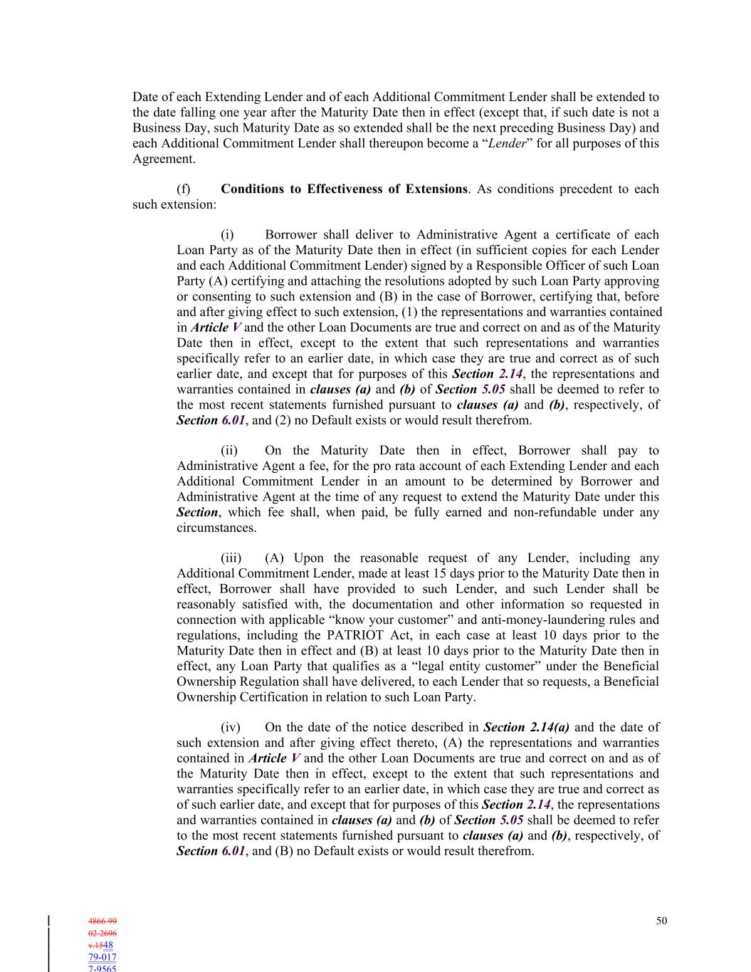4866-99 02-2696 v.1548 79-017 7-9565 50 Date of each Extending Lender and of each Additional Commitment Lender shall be extended to the date falling one year after the Maturity Date then in effect (except that, if such date is not a Business Day, such Maturity Date as so extended shall be the next preceding Business Day) and each Additional Commitment Lender shall thereupon become a “Lender” for all purposes of this Agreement. (f) Conditions to Effectiveness of Extensions. As conditions precedent to each such extension: (i) Borrower shall deliver to Administrative Agent a certificate of each Loan Party as of the Maturity Date then in effect (in sufficient copies for each Lender and each Additional Commitment Lender) signed by a Responsible Officer of such Loan Party (A) certifying and attaching the resolutions adopted by such Loan Party approving or consenting to such extension and (B) in the case of Borrower, certifying that, before and after giving effect to such extension, (1) the representations and warranties contained in Article V and the other Loan Documents are true and correct on and as of the Maturity Date then in effect, except to the extent that such representations and warranties specifically refer to an earlier date, in which case they are true and correct as of such earlier date, and except that for purposes of this Section 2.14, the representations and warranties contained in clauses (a) and (b) of Section 5.05 shall be deemed to refer to the most recent statements furnished pursuant to clauses (a) and (b), respectively, of Section 6.01, and (2) no Default exists or would result therefrom. (ii) On the Maturity Date then in effect, Borrower shall pay to Administrative Agent a fee, for the pro rata account of each Extending Lender and each Additional Commitment Lender in an amount to be determined by Borrower and Administrative Agent at the time of any request to extend the Maturity Date under this Section, which fee shall, when paid, be fully earned and non-refundable under any circumstances. (iii) (A) Upon the reasonable request of any Lender, including any Additional Commitment Lender, made at least 15 days prior to the Maturity Date then in effect, Borrower shall have provided to such Lender, and such Lender shall be reasonably satisfied with, the documentation and other information so requested in connection with applicable “know your customer” and anti-money-laundering rules and regulations, including the PATRIOT Act, in each case at least 10 days prior to the Maturity Date then in effect and (B) at least 10 days prior to the Maturity Date then in effect, any Loan Party that qualifies as a “legal entity customer” under the Beneficial Ownership Regulation shall have delivered, to each Lender that so requests, a Beneficial Ownership Certification in relation to such Loan Party. (iv) On the date of the notice described in Section 2.14(a) and the date of such extension and after giving effect thereto, (A) the representations and warranties contained in Article V and the other Loan Documents are true and correct on and as of the Maturity Date then in effect, except to the extent that such representations and warranties specifically refer to an earlier date, in which case they are true and correct as of such earlier date, and except that for purposes of this Section 2.14, the representations and warranties contained in clauses (a) and (b) of Section 5.05 shall be deemed to refer to the most recent statements furnished pursuant to clauses (a) and (b), respectively, of Section 6.01, and (B) no Default exists or would result therefrom.