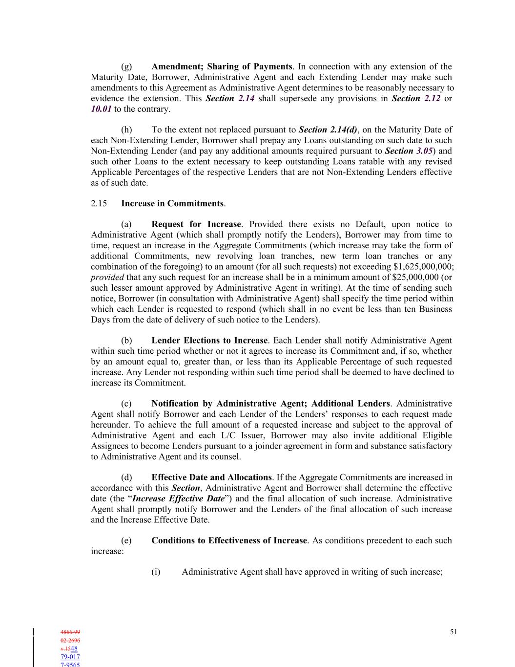 4866-99 02-2696 v.1548 79-017 7-9565 51 (g) Amendment; Sharing of Payments. In connection with any extension of the Maturity Date, Borrower, Administrative Agent and each Extending Lender may make such amendments to this Agreement as Administrative Agent determines to be reasonably necessary to evidence the extension. This Section 2.14 shall supersede any provisions in Section 2.12 or 10.01 to the contrary. (h) To the extent not replaced pursuant to Section 2.14(d), on the Maturity Date of each Non-Extending Lender, Borrower shall prepay any Loans outstanding on such date to such Non-Extending Lender (and pay any additional amounts required pursuant to Section 3.05) and such other Loans to the extent necessary to keep outstanding Loans ratable with any revised Applicable Percentages of the respective Lenders that are not Non-Extending Lenders effective as of such date. 2.15 Increase in Commitments. (a) Request for Increase. Provided there exists no Default, upon notice to Administrative Agent (which shall promptly notify the Lenders), Borrower may from time to time, request an increase in the Aggregate Commitments (which increase may take the form of additional Commitments, new revolving loan tranches, new term loan tranches or any combination of the foregoing) to an amount (for all such requests) not exceeding $1,625,000,000; provided that any such request for an increase shall be in a minimum amount of $25,000,000 (or such lesser amount approved by Administrative Agent in writing). At the time of sending such notice, Borrower (in consultation with Administrative Agent) shall specify the time period within which each Lender is requested to respond (which shall in no event be less than ten Business Days from the date of delivery of such notice to the Lenders). (b) Lender Elections to Increase. Each Lender shall notify Administrative Agent within such time period whether or not it agrees to increase its Commitment and, if so, whether by an amount equal to, greater than, or less than its Applicable Percentage of such requested increase. Any Lender not responding within such time period shall be deemed to have declined to increase its Commitment. (c) Notification by Administrative Agent; Additional Lenders. Administrative Agent shall notify Borrower and each Lender of the Lenders’ responses to each request made hereunder. To achieve the full amount of a requested increase and subject to the approval of Administrative Agent and each L/C Issuer, Borrower may also invite additional Eligible Assignees to become Lenders pursuant to a joinder agreement in form and substance satisfactory to Administrative Agent and its counsel. (d) Effective Date and Allocations. If the Aggregate Commitments are increased in accordance with this Section, Administrative Agent and Borrower shall determine the effective date (the “Increase Effective Date”) and the final allocation of such increase. Administrative Agent shall promptly notify Borrower and the Lenders of the final allocation of such increase and the Increase Effective Date. (e) Conditions to Effectiveness of Increase. As conditions precedent to each such increase: (i) Administrative Agent shall have approved in writing of such increase;