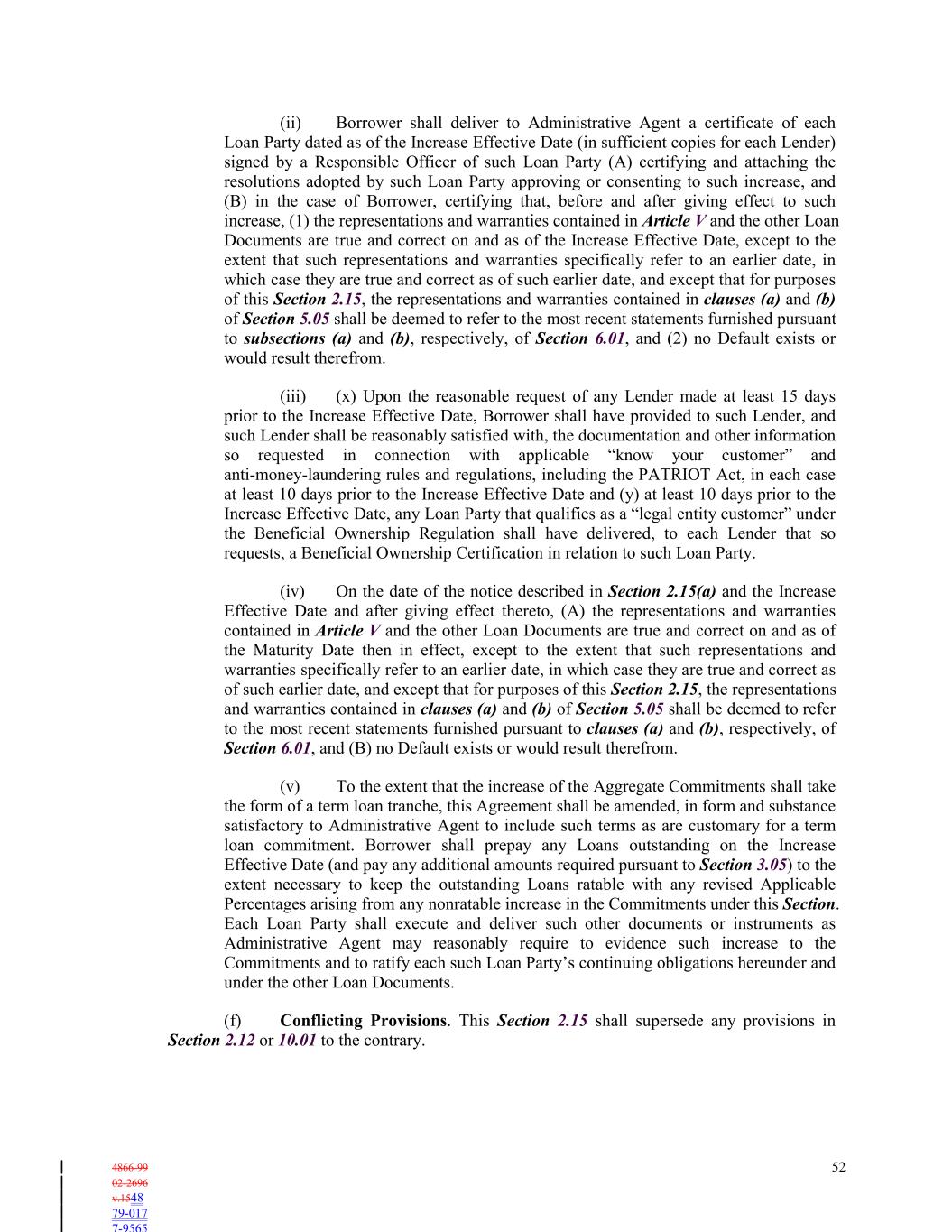 4866-99 02-2696 v.1548 79-017 7-9565 52 (ii) Borrower shall deliver to Administrative Agent a certificate of each Loan Party dated as of the Increase Effective Date (in sufficient copies for each Lender) signed by a Responsible Officer of such Loan Party (A) certifying and attaching the resolutions adopted by such Loan Party approving or consenting to such increase, and (B) in the case of Borrower, certifying that, before and after giving effect to such increase, (1) the representations and warranties contained in Article V and the other Loan Documents are true and correct on and as of the Increase Effective Date, except to the extent that such representations and warranties specifically refer to an earlier date, in which case they are true and correct as of such earlier date, and except that for purposes of this Section 2.15, the representations and warranties contained in clauses (a) and (b) of Section 5.05 shall be deemed to refer to the most recent statements furnished pursuant to subsections (a) and (b), respectively, of Section 6.01, and (2) no Default exists or would result therefrom. (iii) (x) Upon the reasonable request of any Lender made at least 15 days prior to the Increase Effective Date, Borrower shall have provided to such Lender, and such Lender shall be reasonably satisfied with, the documentation and other information so requested in connection with applicable “know your customer” and anti-money-laundering rules and regulations, including the PATRIOT Act, in each case at least 10 days prior to the Increase Effective Date and (y) at least 10 days prior to the Increase Effective Date, any Loan Party that qualifies as a “legal entity customer” under the Beneficial Ownership Regulation shall have delivered, to each Lender that so requests, a Beneficial Ownership Certification in relation to such Loan Party. (iv) On the date of the notice described in Section 2.15(a) and the Increase Effective Date and after giving effect thereto, (A) the representations and warranties contained in Article V and the other Loan Documents are true and correct on and as of the Maturity Date then in effect, except to the extent that such representations and warranties specifically refer to an earlier date, in which case they are true and correct as of such earlier date, and except that for purposes of this Section 2.15, the representations and warranties contained in clauses (a) and (b) of Section 5.05 shall be deemed to refer to the most recent statements furnished pursuant to clauses (a) and (b), respectively, of Section 6.01, and (B) no Default exists or would result therefrom. (v) To the extent that the increase of the Aggregate Commitments shall take the form of a term loan tranche, this Agreement shall be amended, in form and substance satisfactory to Administrative Agent to include such terms as are customary for a term loan commitment. Borrower shall prepay any Loans outstanding on the Increase Effective Date (and pay any additional amounts required pursuant to Section 3.05) to the extent necessary to keep the outstanding Loans ratable with any revised Applicable Percentages arising from any nonratable increase in the Commitments under this Section. Each Loan Party shall execute and deliver such other documents or instruments as Administrative Agent may reasonably require to evidence such increase to the Commitments and to ratify each such Loan Party’s continuing obligations hereunder and under the other Loan Documents. (f) Conflicting Provisions. This Section 2.15 shall supersede any provisions in Section 2.12 or 10.01 to the contrary.