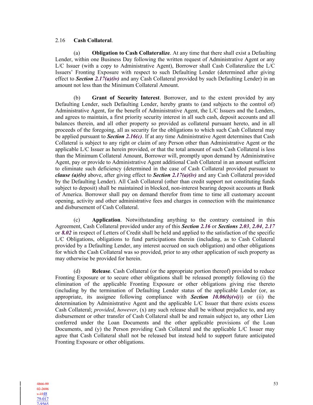 4866-99 02-2696 v.1548 79-017 7-9565 53 2.16 Cash Collateral. (a) Obligation to Cash Collateralize. At any time that there shall exist a Defaulting Lender, within one Business Day following the written request of Administrative Agent or any L/C Issuer (with a copy to Administrative Agent), Borrower shall Cash Collateralize the L/C Issuers’ Fronting Exposure with respect to such Defaulting Lender (determined after giving effect to Section 2.17(a)(iv) and any Cash Collateral provided by such Defaulting Lender) in an amount not less than the Minimum Collateral Amount. (b) Grant of Security Interest. Borrower, and to the extent provided by any Defaulting Lender, such Defaulting Lender, hereby grants to (and subjects to the control of) Administrative Agent, for the benefit of Administrative Agent, the L/C Issuers and the Lenders, and agrees to maintain, a first priority security interest in all such cash, deposit accounts and all balances therein, and all other property so provided as collateral pursuant hereto, and in all proceeds of the foregoing, all as security for the obligations to which such Cash Collateral may be applied pursuant to Section 2.16(c). If at any time Administrative Agent determines that Cash Collateral is subject to any right or claim of any Person other than Administrative Agent or the applicable L/C Issuer as herein provided, or that the total amount of such Cash Collateral is less than the Minimum Collateral Amount, Borrower will, promptly upon demand by Administrative Agent, pay or provide to Administrative Agent additional Cash Collateral in an amount sufficient to eliminate such deficiency (determined in the case of Cash Collateral provided pursuant to clause (a)(iv) above, after giving effect to Section 2.17(a)(iv) and any Cash Collateral provided by the Defaulting Lender). All Cash Collateral (other than credit support not constituting funds subject to deposit) shall be maintained in blocked, non-interest bearing deposit accounts at Bank of America. Borrower shall pay on demand therefor from time to time all customary account opening, activity and other administrative fees and charges in connection with the maintenance and disbursement of Cash Collateral. (c) Application. Notwithstanding anything to the contrary contained in this Agreement, Cash Collateral provided under any of this Section 2.16 or Sections 2.03, 2.04, 2.17 or 8.02 in respect of Letters of Credit shall be held and applied to the satisfaction of the specific L/C Obligations, obligations to fund participations therein (including, as to Cash Collateral provided by a Defaulting Lender, any interest accrued on such obligation) and other obligations for which the Cash Collateral was so provided, prior to any other application of such property as may otherwise be provided for herein. (d) Release. Cash Collateral (or the appropriate portion thereof) provided to reduce Fronting Exposure or to secure other obligations shall be released promptly following (i) the elimination of the applicable Fronting Exposure or other obligations giving rise thereto (including by the termination of Defaulting Lender status of the applicable Lender (or, as appropriate, its assignee following compliance with Section 10.06(b)(vi))) or (ii) the determination by Administrative Agent and the applicable L/C Issuer that there exists excess Cash Collateral; provided, however, (x) any such release shall be without prejudice to, and any disbursement or other transfer of Cash Collateral shall be and remain subject to, any other Lien conferred under the Loan Documents and the other applicable provisions of the Loan Documents, and (y) the Person providing Cash Collateral and the applicable L/C Issuer may agree that Cash Collateral shall not be released but instead held to support future anticipated Fronting Exposure or other obligations.