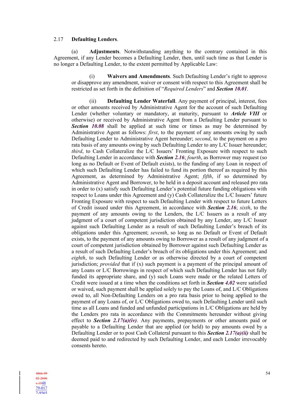4866-99 02-2696 v.1548 79-017 7-9565 54 2.17 Defaulting Lenders. (a) Adjustments. Notwithstanding anything to the contrary contained in this Agreement, if any Lender becomes a Defaulting Lender, then, until such time as that Lender is no longer a Defaulting Lender, to the extent permitted by Applicable Law: (i) Waivers and Amendments. Such Defaulting Lender’s right to approve or disapprove any amendment, waiver or consent with respect to this Agreement shall be restricted as set forth in the definition of “Required Lenders” and Section 10.01. (ii) Defaulting Lender Waterfall. Any payment of principal, interest, fees or other amounts received by Administrative Agent for the account of such Defaulting Lender (whether voluntary or mandatory, at maturity, pursuant to Article VIII or otherwise) or received by Administrative Agent from a Defaulting Lender pursuant to Section 10.08 shall be applied at such time or times as may be determined by Administrative Agent as follows: first, to the payment of any amounts owing by such Defaulting Lender to Administrative Agent hereunder; second, to the payment on a pro rata basis of any amounts owing by such Defaulting Lender to any L/C Issuer hereunder; third, to Cash Collateralize the L/C Issuers’ Fronting Exposure with respect to such Defaulting Lender in accordance with Section 2.16; fourth, as Borrower may request (so long as no Default or Event of Default exists), to the funding of any Loan in respect of which such Defaulting Lender has failed to fund its portion thereof as required by this Agreement, as determined by Administrative Agent; fifth, if so determined by Administrative Agent and Borrower, to be held in a deposit account and released pro rata in order to (x) satisfy such Defaulting Lender’s potential future funding obligations with respect to Loans under this Agreement and (y) Cash Collateralize the L/C Issuers’ future Fronting Exposure with respect to such Defaulting Lender with respect to future Letters of Credit issued under this Agreement, in accordance with Section 2.16; sixth, to the payment of any amounts owing to the Lenders, the L/C Issuers as a result of any judgment of a court of competent jurisdiction obtained by any Lender, any L/C Issuer against such Defaulting Lender as a result of such Defaulting Lender’s breach of its obligations under this Agreement; seventh, so long as no Default or Event of Default exists, to the payment of any amounts owing to Borrower as a result of any judgment of a court of competent jurisdiction obtained by Borrower against such Defaulting Lender as a result of such Defaulting Lender’s breach of its obligations under this Agreement; and eighth, to such Defaulting Lender or as otherwise directed by a court of competent jurisdiction; provided that if (x) such payment is a payment of the principal amount of any Loans or L/C Borrowings in respect of which such Defaulting Lender has not fully funded its appropriate share, and (y) such Loans were made or the related Letters of Credit were issued at a time when the conditions set forth in Section 4.02 were satisfied or waived, such payment shall be applied solely to pay the Loans of, and L/C Obligations owed to, all Non-Defaulting Lenders on a pro rata basis prior to being applied to the payment of any Loans of, or L/C Obligations owed to, such Defaulting Lender until such time as all Loans and funded and unfunded participations in L/C Obligations are held by the Lenders pro rata in accordance with the Commitments hereunder without giving effect to Section 2.17(a)(iv). Any payments, prepayments or other amounts paid or payable to a Defaulting Lender that are applied (or held) to pay amounts owed by a Defaulting Lender or to post Cash Collateral pursuant to this Section 2.17(a)(ii) shall be deemed paid to and redirected by such Defaulting Lender, and each Lender irrevocably consents hereto.