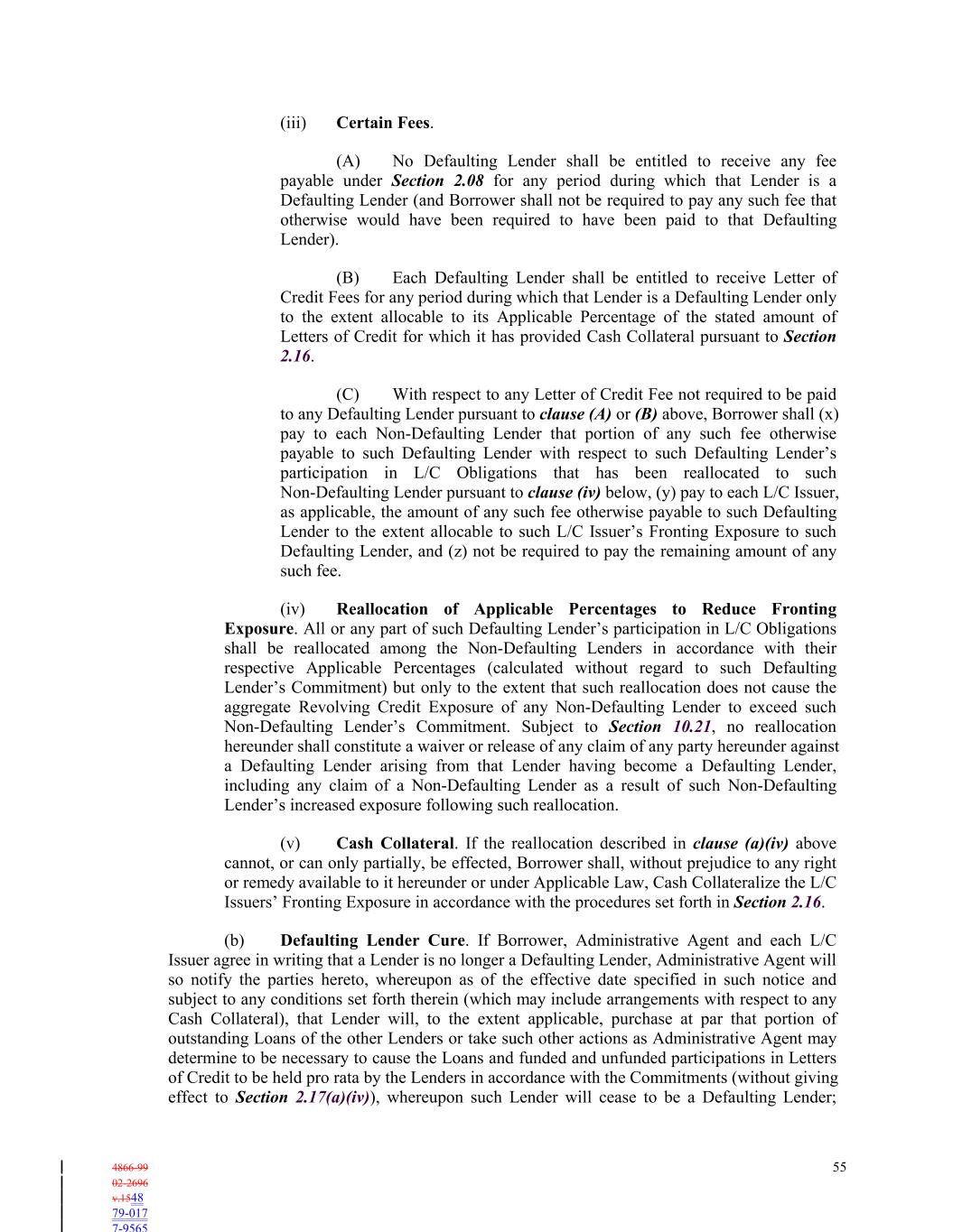 4866-99 02-2696 v.1548 79-017 7-9565 55 (iii) Certain Fees. (A) No Defaulting Lender shall be entitled to receive any fee payable under Section 2.08 for any period during which that Lender is a Defaulting Lender (and Borrower shall not be required to pay any such fee that otherwise would have been required to have been paid to that Defaulting Lender). (B) Each Defaulting Lender shall be entitled to receive Letter of Credit Fees for any period during which that Lender is a Defaulting Lender only to the extent allocable to its Applicable Percentage of the stated amount of Letters of Credit for which it has provided Cash Collateral pursuant to Section 2.16. (C) With respect to any Letter of Credit Fee not required to be paid to any Defaulting Lender pursuant to clause (A) or (B) above, Borrower shall (x) pay to each Non-Defaulting Lender that portion of any such fee otherwise payable to such Defaulting Lender with respect to such Defaulting Lender’s participation in L/C Obligations that has been reallocated to such Non-Defaulting Lender pursuant to clause (iv) below, (y) pay to each L/C Issuer, as applicable, the amount of any such fee otherwise payable to such Defaulting Lender to the extent allocable to such L/C Issuer’s Fronting Exposure to such Defaulting Lender, and (z) not be required to pay the remaining amount of any such fee. (iv) Reallocation of Applicable Percentages to Reduce Fronting Exposure. All or any part of such Defaulting Lender’s participation in L/C Obligations shall be reallocated among the Non-Defaulting Lenders in accordance with their respective Applicable Percentages (calculated without regard to such Defaulting Lender’s Commitment) but only to the extent that such reallocation does not cause the aggregate Revolving Credit Exposure of any Non-Defaulting Lender to exceed such Non-Defaulting Lender’s Commitment. Subject to Section 10.21, no reallocation hereunder shall constitute a waiver or release of any claim of any party hereunder against a Defaulting Lender arising from that Lender having become a Defaulting Lender, including any claim of a Non-Defaulting Lender as a result of such Non-Defaulting Lender’s increased exposure following such reallocation. (v) Cash Collateral. If the reallocation described in clause (a)(iv) above cannot, or can only partially, be effected, Borrower shall, without prejudice to any right or remedy available to it hereunder or under Applicable Law, Cash Collateralize the L/C Issuers’ Fronting Exposure in accordance with the procedures set forth in Section 2.16. (b) Defaulting Lender Cure. If Borrower, Administrative Agent and each L/C Issuer agree in writing that a Lender is no longer a Defaulting Lender, Administrative Agent will so notify the parties hereto, whereupon as of the effective date specified in such notice and subject to any conditions set forth therein (which may include arrangements with respect to any Cash Collateral), that Lender will, to the extent applicable, purchase at par that portion of outstanding Loans of the other Lenders or take such other actions as Administrative Agent may determine to be necessary to cause the Loans and funded and unfunded participations in Letters of Credit to be held pro rata by the Lenders in accordance with the Commitments (without giving effect to Section 2.17(a)(iv)), whereupon such Lender will cease to be a Defaulting Lender;