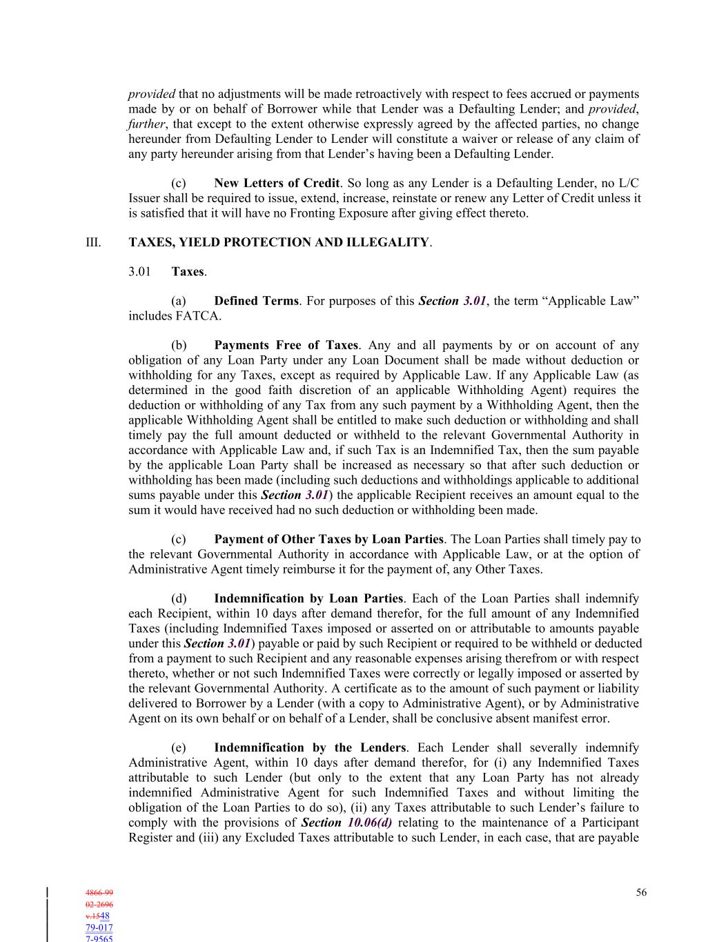 4866-99 02-2696 v.1548 79-017 7-9565 56 provided that no adjustments will be made retroactively with respect to fees accrued or payments made by or on behalf of Borrower while that Lender was a Defaulting Lender; and provided, further, that except to the extent otherwise expressly agreed by the affected parties, no change hereunder from Defaulting Lender to Lender will constitute a waiver or release of any claim of any party hereunder arising from that Lender’s having been a Defaulting Lender. (c) New Letters of Credit. So long as any Lender is a Defaulting Lender, no L/C Issuer shall be required to issue, extend, increase, reinstate or renew any Letter of Credit unless it is satisfied that it will have no Fronting Exposure after giving effect thereto. III. TAXES, YIELD PROTECTION AND ILLEGALITY. 3.01 Taxes. (a) Defined Terms. For purposes of this Section 3.01, the term “Applicable Law” includes FATCA. (b) Payments Free of Taxes. Any and all payments by or on account of any obligation of any Loan Party under any Loan Document shall be made without deduction or withholding for any Taxes, except as required by Applicable Law. If any Applicable Law (as determined in the good faith discretion of an applicable Withholding Agent) requires the deduction or withholding of any Tax from any such payment by a Withholding Agent, then the applicable Withholding Agent shall be entitled to make such deduction or withholding and shall timely pay the full amount deducted or withheld to the relevant Governmental Authority in accordance with Applicable Law and, if such Tax is an Indemnified Tax, then the sum payable by the applicable Loan Party shall be increased as necessary so that after such deduction or withholding has been made (including such deductions and withholdings applicable to additional sums payable under this Section 3.01) the applicable Recipient receives an amount equal to the sum it would have received had no such deduction or withholding been made. (c) Payment of Other Taxes by Loan Parties. The Loan Parties shall timely pay to the relevant Governmental Authority in accordance with Applicable Law, or at the option of Administrative Agent timely reimburse it for the payment of, any Other Taxes. (d) Indemnification by Loan Parties. Each of the Loan Parties shall indemnify each Recipient, within 10 days after demand therefor, for the full amount of any Indemnified Taxes (including Indemnified Taxes imposed or asserted on or attributable to amounts payable under this Section 3.01) payable or paid by such Recipient or required to be withheld or deducted from a payment to such Recipient and any reasonable expenses arising therefrom or with respect thereto, whether or not such Indemnified Taxes were correctly or legally imposed or asserted by the relevant Governmental Authority. A certificate as to the amount of such payment or liability delivered to Borrower by a Lender (with a copy to Administrative Agent), or by Administrative Agent on its own behalf or on behalf of a Lender, shall be conclusive absent manifest error. (e) Indemnification by the Lenders. Each Lender shall severally indemnify Administrative Agent, within 10 days after demand therefor, for (i) any Indemnified Taxes attributable to such Lender (but only to the extent that any Loan Party has not already indemnified Administrative Agent for such Indemnified Taxes and without limiting the obligation of the Loan Parties to do so), (ii) any Taxes attributable to such Lender’s failure to comply with the provisions of Section 10.06(d) relating to the maintenance of a Participant Register and (iii) any Excluded Taxes attributable to such Lender, in each case, that are payable