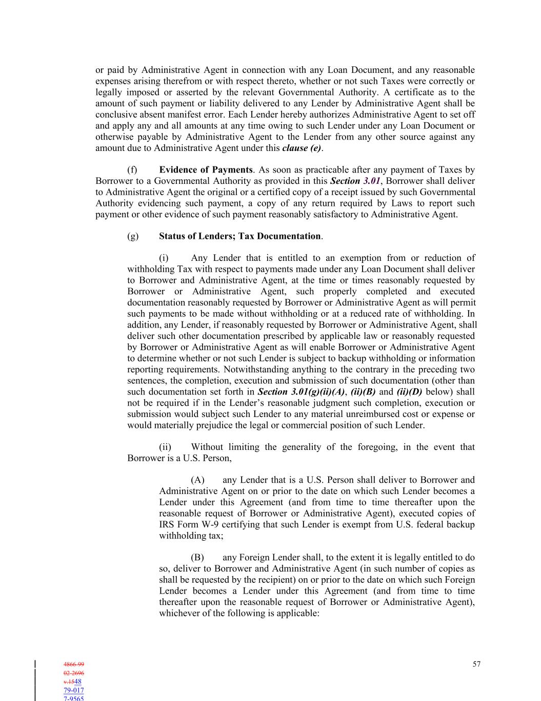 4866-99 02-2696 v.1548 79-017 7-9565 57 or paid by Administrative Agent in connection with any Loan Document, and any reasonable expenses arising therefrom or with respect thereto, whether or not such Taxes were correctly or legally imposed or asserted by the relevant Governmental Authority. A certificate as to the amount of such payment or liability delivered to any Lender by Administrative Agent shall be conclusive absent manifest error. Each Lender hereby authorizes Administrative Agent to set off and apply any and all amounts at any time owing to such Lender under any Loan Document or otherwise payable by Administrative Agent to the Lender from any other source against any amount due to Administrative Agent under this clause (e). (f) Evidence of Payments. As soon as practicable after any payment of Taxes by Borrower to a Governmental Authority as provided in this Section 3.01, Borrower shall deliver to Administrative Agent the original or a certified copy of a receipt issued by such Governmental Authority evidencing such payment, a copy of any return required by Laws to report such payment or other evidence of such payment reasonably satisfactory to Administrative Agent. (g) Status of Lenders; Tax Documentation. (i) Any Lender that is entitled to an exemption from or reduction of withholding Tax with respect to payments made under any Loan Document shall deliver to Borrower and Administrative Agent, at the time or times reasonably requested by Borrower or Administrative Agent, such properly completed and executed documentation reasonably requested by Borrower or Administrative Agent as will permit such payments to be made without withholding or at a reduced rate of withholding. In addition, any Lender, if reasonably requested by Borrower or Administrative Agent, shall deliver such other documentation prescribed by applicable law or reasonably requested by Borrower or Administrative Agent as will enable Borrower or Administrative Agent to determine whether or not such Lender is subject to backup withholding or information reporting requirements. Notwithstanding anything to the contrary in the preceding two sentences, the completion, execution and submission of such documentation (other than such documentation set forth in Section 3.01(g)(ii)(A), (ii)(B) and (ii)(D) below) shall not be required if in the Lender’s reasonable judgment such completion, execution or submission would subject such Lender to any material unreimbursed cost or expense or would materially prejudice the legal or commercial position of such Lender. (ii) Without limiting the generality of the foregoing, in the event that Borrower is a U.S. Person, (A) any Lender that is a U.S. Person shall deliver to Borrower and Administrative Agent on or prior to the date on which such Lender becomes a Lender under this Agreement (and from time to time thereafter upon the reasonable request of Borrower or Administrative Agent), executed copies of IRS Form W-9 certifying that such Lender is exempt from U.S. federal backup withholding tax; (B) any Foreign Lender shall, to the extent it is legally entitled to do so, deliver to Borrower and Administrative Agent (in such number of copies as shall be requested by the recipient) on or prior to the date on which such Foreign Lender becomes a Lender under this Agreement (and from time to time thereafter upon the reasonable request of Borrower or Administrative Agent), whichever of the following is applicable: