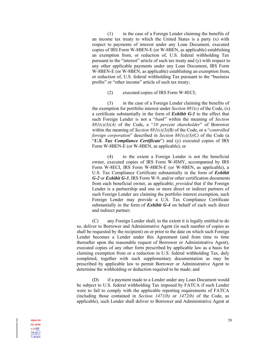4866-99 02-2696 v.1548 79-017 7-9565 58 (1) in the case of a Foreign Lender claiming the benefits of an income tax treaty to which the United States is a party (x) with respect to payments of interest under any Loan Document, executed copies of IRS Form W-8BEN-E (or W-8BEN, as applicable) establishing an exemption from, or reduction of, U.S. federal withholding Tax pursuant to the “interest” article of such tax treaty and (y) with respect to any other applicable payments under any Loan Document, IRS Form W-8BEN-E (or W-8BEN, as applicable) establishing an exemption from, or reduction of, U.S. federal withholding Tax pursuant to the “business profits” or “other income” article of such tax treaty; (2) executed copies of IRS Form W-8ECI; (3) in the case of a Foreign Lender claiming the benefits of the exemption for portfolio interest under Section 881(c) of the Code, (x) a certificate substantially in the form of Exhibit G-1 to the effect that such Foreign Lender is not a “bank” within the meaning of Section 881(c)(3)(A) of the Code, a “10 percent shareholder” of Borrower within the meaning of Section 881(c)(3)(B) of the Code, or a “controlled foreign corporation” described in Section 881(c)(3)(C) of the Code (a “U.S. Tax Compliance Certificate”) and (y) executed copies of IRS Form W-8BEN-E (or W-8BEN, as applicable); or (4) to the extent a Foreign Lender is not the beneficial owner, executed copies of IRS Form W-8IMY, accompanied by IRS Form W-8ECI, IRS Form W-8BEN-E (or W-8BEN, as applicable), a U.S. Tax Compliance Certificate substantially in the form of Exhibit G-2 or Exhibit G-3, IRS Form W-9, and/or other certification documents from each beneficial owner, as applicable; provided that if the Foreign Lender is a partnership and one or more direct or indirect partners of such Foreign Lender are claiming the portfolio interest exemption, such Foreign Lender may provide a U.S. Tax Compliance Certificate substantially in the form of Exhibit G-4 on behalf of each such direct and indirect partner; (C) any Foreign Lender shall, to the extent it is legally entitled to do so, deliver to Borrower and Administrative Agent (in such number of copies as shall be requested by the recipient) on or prior to the date on which such Foreign Lender becomes a Lender under this Agreement (and from time to time thereafter upon the reasonable request of Borrower or Administrative Agent), executed copies of any other form prescribed by applicable law as a basis for claiming exemption from or a reduction in U.S. federal withholding Tax, duly completed, together with such supplementary documentation as may be prescribed by applicable law to permit Borrower or Administrative Agent to determine the withholding or deduction required to be made; and (D) if a payment made to a Lender under any Loan Document would be subject to U.S. federal withholding Tax imposed by FATCA if such Lender were to fail to comply with the applicable reporting requirements of FATCA (including those contained in Section 1471(b) or 1472(b) of the Code, as applicable), such Lender shall deliver to Borrower and Administrative Agent at