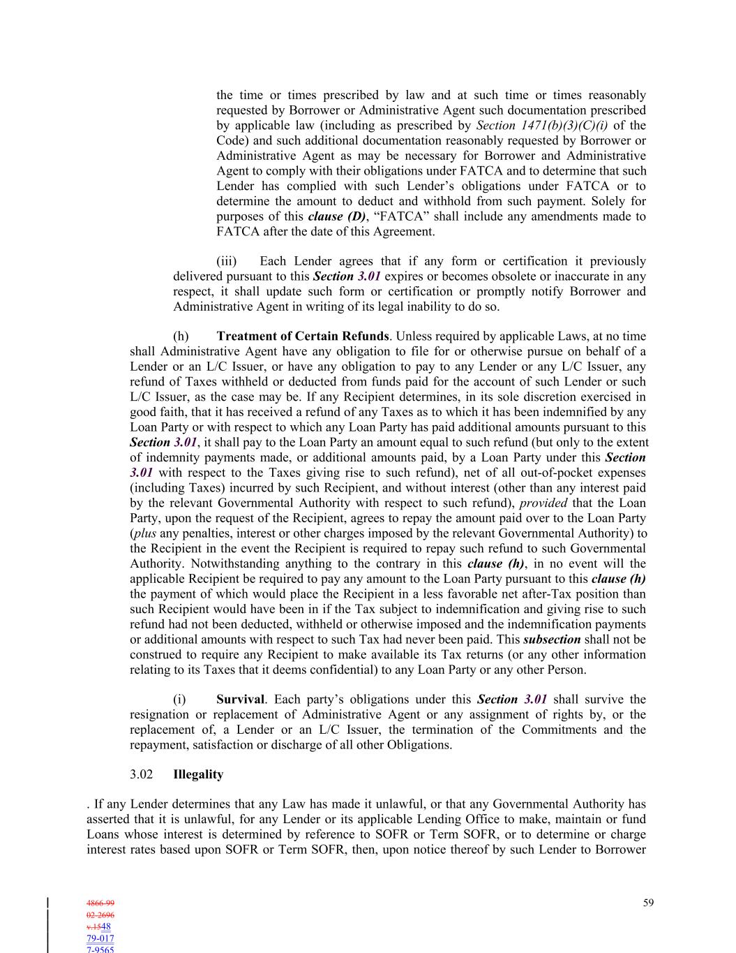 4866-99 02-2696 v.1548 79-017 7-9565 59 the time or times prescribed by law and at such time or times reasonably requested by Borrower or Administrative Agent such documentation prescribed by applicable law (including as prescribed by Section 1471(b)(3)(C)(i) of the Code) and such additional documentation reasonably requested by Borrower or Administrative Agent as may be necessary for Borrower and Administrative Agent to comply with their obligations under FATCA and to determine that such Lender has complied with such Lender’s obligations under FATCA or to determine the amount to deduct and withhold from such payment. Solely for purposes of this clause (D), “FATCA” shall include any amendments made to FATCA after the date of this Agreement. (iii) Each Lender agrees that if any form or certification it previously delivered pursuant to this Section 3.01 expires or becomes obsolete or inaccurate in any respect, it shall update such form or certification or promptly notify Borrower and Administrative Agent in writing of its legal inability to do so. (h) Treatment of Certain Refunds. Unless required by applicable Laws, at no time shall Administrative Agent have any obligation to file for or otherwise pursue on behalf of a Lender or an L/C Issuer, or have any obligation to pay to any Lender or any L/C Issuer, any refund of Taxes withheld or deducted from funds paid for the account of such Lender or such L/C Issuer, as the case may be. If any Recipient determines, in its sole discretion exercised in good faith, that it has received a refund of any Taxes as to which it has been indemnified by any Loan Party or with respect to which any Loan Party has paid additional amounts pursuant to this Section 3.01, it shall pay to the Loan Party an amount equal to such refund (but only to the extent of indemnity payments made, or additional amounts paid, by a Loan Party under this Section 3.01 with respect to the Taxes giving rise to such refund), net of all out-of-pocket expenses (including Taxes) incurred by such Recipient, and without interest (other than any interest paid by the relevant Governmental Authority with respect to such refund), provided that the Loan Party, upon the request of the Recipient, agrees to repay the amount paid over to the Loan Party (plus any penalties, interest or other charges imposed by the relevant Governmental Authority) to the Recipient in the event the Recipient is required to repay such refund to such Governmental Authority. Notwithstanding anything to the contrary in this clause (h), in no event will the applicable Recipient be required to pay any amount to the Loan Party pursuant to this clause (h) the payment of which would place the Recipient in a less favorable net after-Tax position than such Recipient would have been in if the Tax subject to indemnification and giving rise to such refund had not been deducted, withheld or otherwise imposed and the indemnification payments or additional amounts with respect to such Tax had never been paid. This subsection shall not be construed to require any Recipient to make available its Tax returns (or any other information relating to its Taxes that it deems confidential) to any Loan Party or any other Person. (i) Survival. Each party’s obligations under this Section 3.01 shall survive the resignation or replacement of Administrative Agent or any assignment of rights by, or the replacement of, a Lender or an L/C Issuer, the termination of the Commitments and the repayment, satisfaction or discharge of all other Obligations. 3.02 Illegality . If any Lender determines that any Law has made it unlawful, or that any Governmental Authority has asserted that it is unlawful, for any Lender or its applicable Lending Office to make, maintain or fund Loans whose interest is determined by reference to SOFR or Term SOFR, or to determine or charge interest rates based upon SOFR or Term SOFR, then, upon notice thereof by such Lender to Borrower