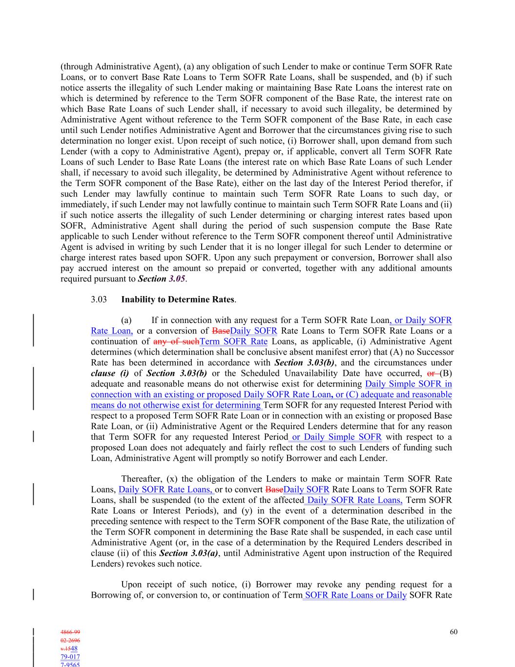 4866-99 02-2696 v.1548 79-017 7-9565 60 (through Administrative Agent), (a) any obligation of such Lender to make or continue Term SOFR Rate Loans, or to convert Base Rate Loans to Term SOFR Rate Loans, shall be suspended, and (b) if such notice asserts the illegality of such Lender making or maintaining Base Rate Loans the interest rate on which is determined by reference to the Term SOFR component of the Base Rate, the interest rate on which Base Rate Loans of such Lender shall, if necessary to avoid such illegality, be determined by Administrative Agent without reference to the Term SOFR component of the Base Rate, in each case until such Lender notifies Administrative Agent and Borrower that the circumstances giving rise to such determination no longer exist. Upon receipt of such notice, (i) Borrower shall, upon demand from such Lender (with a copy to Administrative Agent), prepay or, if applicable, convert all Term SOFR Rate Loans of such Lender to Base Rate Loans (the interest rate on which Base Rate Loans of such Lender shall, if necessary to avoid such illegality, be determined by Administrative Agent without reference to the Term SOFR component of the Base Rate), either on the last day of the Interest Period therefor, if such Lender may lawfully continue to maintain such Term SOFR Rate Loans to such day, or immediately, if such Lender may not lawfully continue to maintain such Term SOFR Rate Loans and (ii) if such notice asserts the illegality of such Lender determining or charging interest rates based upon SOFR, Administrative Agent shall during the period of such suspension compute the Base Rate applicable to such Lender without reference to the Term SOFR component thereof until Administrative Agent is advised in writing by such Lender that it is no longer illegal for such Lender to determine or charge interest rates based upon SOFR. Upon any such prepayment or conversion, Borrower shall also pay accrued interest on the amount so prepaid or converted, together with any additional amounts required pursuant to Section 3.05. 3.03 Inability to Determine Rates. (a) If in connection with any request for a Term SOFR Rate Loan, or Daily SOFR Rate Loan, or a conversion of BaseDaily SOFR Rate Loans to Term SOFR Rate Loans or a continuation of any of suchTerm SOFR Rate Loans, as applicable, (i) Administrative Agent determines (which determination shall be conclusive absent manifest error) that (A) no Successor Rate has been determined in accordance with Section 3.03(b), and the circumstances under clause (i) of Section 3.03(b) or the Scheduled Unavailability Date have occurred, or (B) adequate and reasonable means do not otherwise exist for determining Daily Simple SOFR in connection with an existing or proposed Daily SOFR Rate Loan, or (C) adequate and reasonable means do not otherwise exist for determining Term SOFR for any requested Interest Period with respect to a proposed Term SOFR Rate Loan or in connection with an existing or proposed Base Rate Loan, or (ii) Administrative Agent or the Required Lenders determine that for any reason that Term SOFR for any requested Interest Period or Daily Simple SOFR with respect to a proposed Loan does not adequately and fairly reflect the cost to such Lenders of funding such Loan, Administrative Agent will promptly so notify Borrower and each Lender. Thereafter, (x) the obligation of the Lenders to make or maintain Term SOFR Rate Loans, Daily SOFR Rate Loans, or to convert BaseDaily SOFR Rate Loans to Term SOFR Rate Loans, shall be suspended (to the extent of the affected Daily SOFR Rate Loans, Term SOFR Rate Loans or Interest Periods), and (y) in the event of a determination described in the preceding sentence with respect to the Term SOFR component of the Base Rate, the utilization of the Term SOFR component in determining the Base Rate shall be suspended, in each case until Administrative Agent (or, in the case of a determination by the Required Lenders described in clause (ii) of this Section 3.03(a), until Administrative Agent upon instruction of the Required Lenders) revokes such notice. Upon receipt of such notice, (i) Borrower may revoke any pending request for a Borrowing of, or conversion to, or continuation of Term SOFR Rate Loans or Daily SOFR Rate