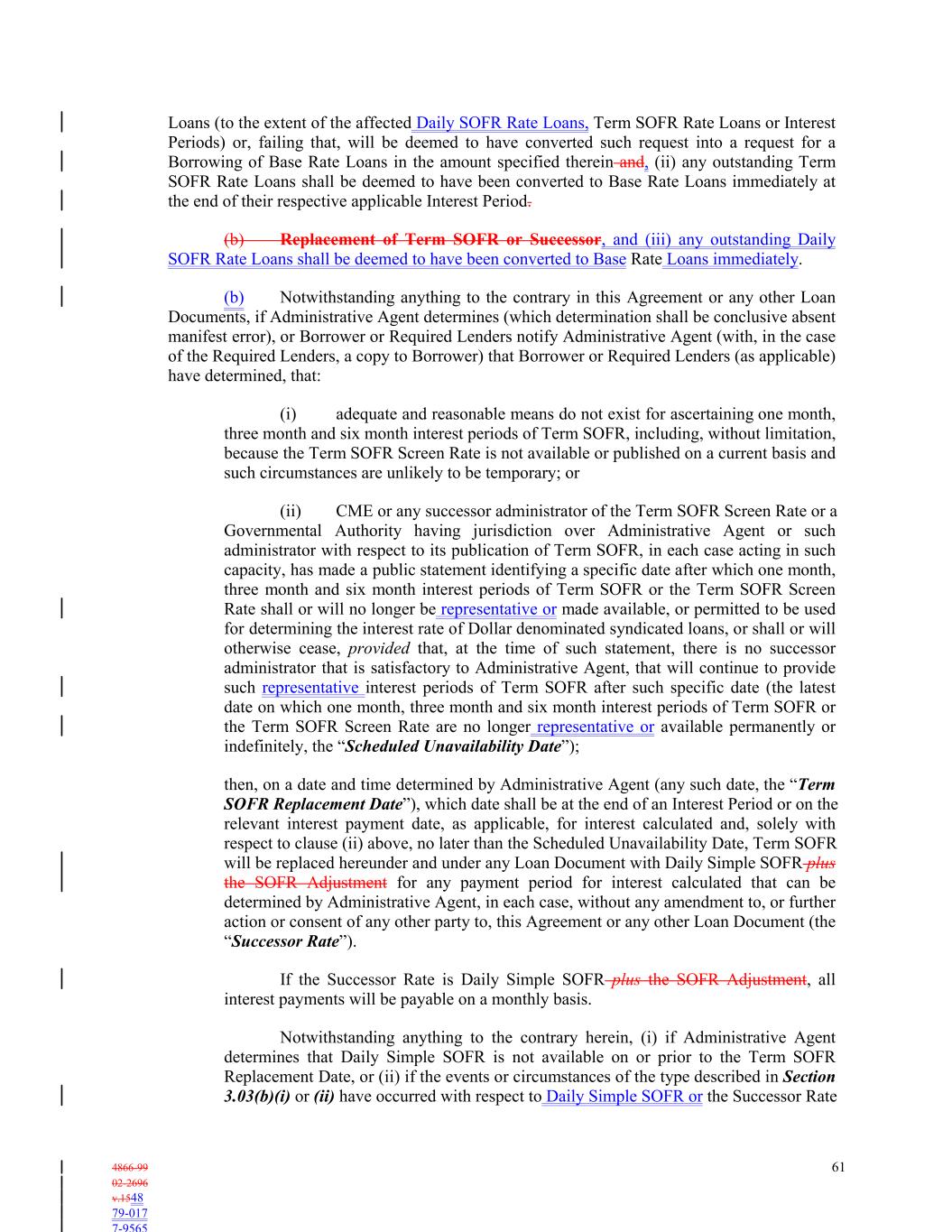 4866-99 02-2696 v.1548 79-017 7-9565 61 Loans (to the extent of the affected Daily SOFR Rate Loans, Term SOFR Rate Loans or Interest Periods) or, failing that, will be deemed to have converted such request into a request for a Borrowing of Base Rate Loans in the amount specified therein and, (ii) any outstanding Term SOFR Rate Loans shall be deemed to have been converted to Base Rate Loans immediately at the end of their respective applicable Interest Period. (b) Replacement of Term SOFR or Successor, and (iii) any outstanding Daily SOFR Rate Loans shall be deemed to have been converted to Base Rate Loans immediately. (b) Notwithstanding anything to the contrary in this Agreement or any other Loan Documents, if Administrative Agent determines (which determination shall be conclusive absent manifest error), or Borrower or Required Lenders notify Administrative Agent (with, in the case of the Required Lenders, a copy to Borrower) that Borrower or Required Lenders (as applicable) have determined, that: (i) adequate and reasonable means do not exist for ascertaining one month, three month and six month interest periods of Term SOFR, including, without limitation, because the Term SOFR Screen Rate is not available or published on a current basis and such circumstances are unlikely to be temporary; or (ii) CME or any successor administrator of the Term SOFR Screen Rate or a Governmental Authority having jurisdiction over Administrative Agent or such administrator with respect to its publication of Term SOFR, in each case acting in such capacity, has made a public statement identifying a specific date after which one month, three month and six month interest periods of Term SOFR or the Term SOFR Screen Rate shall or will no longer be representative or made available, or permitted to be used for determining the interest rate of Dollar denominated syndicated loans, or shall or will otherwise cease, provided that, at the time of such statement, there is no successor administrator that is satisfactory to Administrative Agent, that will continue to provide such representative interest periods of Term SOFR after such specific date (the latest date on which one month, three month and six month interest periods of Term SOFR or the Term SOFR Screen Rate are no longer representative or available permanently or indefinitely, the “Scheduled Unavailability Date”); then, on a date and time determined by Administrative Agent (any such date, the “Term SOFR Replacement Date”), which date shall be at the end of an Interest Period or on the relevant interest payment date, as applicable, for interest calculated and, solely with respect to clause (ii) above, no later than the Scheduled Unavailability Date, Term SOFR will be replaced hereunder and under any Loan Document with Daily Simple SOFR plus the SOFR Adjustment for any payment period for interest calculated that can be determined by Administrative Agent, in each case, without any amendment to, or further action or consent of any other party to, this Agreement or any other Loan Document (the “Successor Rate”). If the Successor Rate is Daily Simple SOFR plus the SOFR Adjustment, all interest payments will be payable on a monthly basis. Notwithstanding anything to the contrary herein, (i) if Administrative Agent determines that Daily Simple SOFR is not available on or prior to the Term SOFR Replacement Date, or (ii) if the events or circumstances of the type described in Section 3.03(b)(i) or (ii) have occurred with respect to Daily Simple SOFR or the Successor Rate