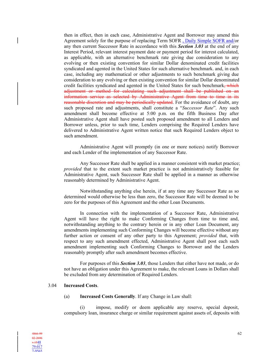 4866-99 02-2696 v.1548 79-017 7-9565 62 then in effect, then in each case, Administrative Agent and Borrower may amend this Agreement solely for the purpose of replacing Term SOFR , Daily Simple SOFR and/or any then current Successor Rate in accordance with this Section 3.03 at the end of any Interest Period, relevant interest payment date or payment period for interest calculated, as applicable, with an alternative benchmark rate giving due consideration to any evolving or then existing convention for similar Dollar denominated credit facilities syndicated and agented in the United States for such alternative benchmark. and, in each case, including any mathematical or other adjustments to such benchmark giving due consideration to any evolving or then existing convention for similar Dollar denominated credit facilities syndicated and agented in the United States for such benchmark, which adjustment or method for calculating such adjustment shall be published on an information service as selected by Administrative Agent from time to time in its reasonable discretion and may be periodically updated. For the avoidance of doubt, any such proposed rate and adjustments, shall constitute a “Successor Rate”. Any such amendment shall become effective at 5:00 p.m. on the fifth Business Day after Administrative Agent shall have posted such proposed amendment to all Lenders and Borrower unless, prior to such time, Lenders comprising the Required Lenders have delivered to Administrative Agent written notice that such Required Lenders object to such amendment. Administrative Agent will promptly (in one or more notices) notify Borrower and each Lender of the implementation of any Successor Rate. Any Successor Rate shall be applied in a manner consistent with market practice; provided that to the extent such market practice is not administratively feasible for Administrative Agent, such Successor Rate shall be applied in a manner as otherwise reasonably determined by Administrative Agent. Notwithstanding anything else herein, if at any time any Successor Rate as so determined would otherwise be less than zero, the Successor Rate will be deemed to be zero for the purposes of this Agreement and the other Loan Documents. In connection with the implementation of a Successor Rate, Administrative Agent will have the right to make Conforming Changes from time to time and, notwithstanding anything to the contrary herein or in any other Loan Document, any amendments implementing such Conforming Changes will become effective without any further action or consent of any other party to this Agreement; provided that, with respect to any such amendment effected, Administrative Agent shall post each such amendment implementing such Conforming Changes to Borrower and the Lenders reasonably promptly after such amendment becomes effective. For purposes of this Section 3.03, those Lenders that either have not made, or do not have an obligation under this Agreement to make, the relevant Loans in Dollars shall be excluded from any determination of Required Lenders. 3.04 Increased Costs. (a) Increased Costs Generally. If any Change in Law shall: (i) impose, modify or deem applicable any reserve, special deposit, compulsory loan, insurance charge or similar requirement against assets of, deposits with