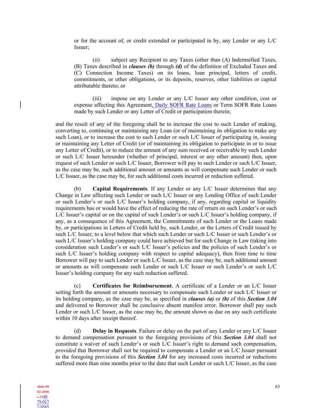 4866-99 02-2696 v.1548 79-017 7-9565 63 or for the account of, or credit extended or participated in by, any Lender or any L/C Issuer; (ii) subject any Recipient to any Taxes (other than (A) Indemnified Taxes, (B) Taxes described in clauses (b) through (d) of the definition of Excluded Taxes and (C) Connection Income Taxes) on its loans, loan principal, letters of credit, commitments, or other obligations, or its deposits, reserves, other liabilities or capital attributable thereto; or (iii) impose on any Lender or any L/C Issuer any other condition, cost or expense affecting this Agreement, Daily SOFR Rate Loans or Term SOFR Rate Loans made by such Lender or any Letter of Credit or participation therein; and the result of any of the foregoing shall be to increase the cost to such Lender of making, converting to, continuing or maintaining any Loan (or of maintaining its obligation to make any such Loan), or to increase the cost to such Lender or such L/C Issuer of participating in, issuing or maintaining any Letter of Credit (or of maintaining its obligation to participate in or to issue any Letter of Credit), or to reduce the amount of any sum received or receivable by such Lender or such L/C Issuer hereunder (whether of principal, interest or any other amount) then, upon request of such Lender or such L/C Issuer, Borrower will pay to such Lender or such L/C Issuer, as the case may be, such additional amount or amounts as will compensate such Lender or such L/C Issuer, as the case may be, for such additional costs incurred or reduction suffered. (b) Capital Requirements. If any Lender or any L/C Issuer determines that any Change in Law affecting such Lender or such L/C Issuer or any Lending Office of such Lender or such Lender’s or such L/C Issuer’s holding company, if any, regarding capital or liquidity requirements has or would have the effect of reducing the rate of return on such Lender’s or such L/C Issuer’s capital or on the capital of such Lender’s or such L/C Issuer’s holding company, if any, as a consequence of this Agreement, the Commitments of such Lender or the Loans made by, or participations in Letters of Credit held by, such Lender, or the Letters of Credit issued by such L/C Issuer, to a level below that which such Lender or such L/C Issuer or such Lender’s or such L/C Issuer’s holding company could have achieved but for such Change in Law (taking into consideration such Lender’s or such L/C Issuer’s policies and the policies of such Lender’s or such L/C Issuer’s holding company with respect to capital adequacy), then from time to time Borrower will pay to such Lender or such L/C Issuer, as the case may be, such additional amount or amounts as will compensate such Lender or such L/C Issuer or such Lender’s or such L/C Issuer’s holding company for any such reduction suffered. (c) Certificates for Reimbursement. A certificate of a Lender or an L/C Issuer setting forth the amount or amounts necessary to compensate such Lender or such L/C Issuer or its holding company, as the case may be, as specified in clauses (a) or (b) of this Section 3.04 and delivered to Borrower shall be conclusive absent manifest error. Borrower shall pay such Lender or such L/C Issuer, as the case may be, the amount shown as due on any such certificate within 10 days after receipt thereof. (d) Delay in Requests. Failure or delay on the part of any Lender or any L/C Issuer to demand compensation pursuant to the foregoing provisions of this Section 3.04 shall not constitute a waiver of such Lender’s or such L/C Issuer’s right to demand such compensation, provided that Borrower shall not be required to compensate a Lender or an L/C Issuer pursuant to the foregoing provisions of this Section 3.04 for any increased costs incurred or reductions suffered more than nine months prior to the date that such Lender or such L/C Issuer, as the case