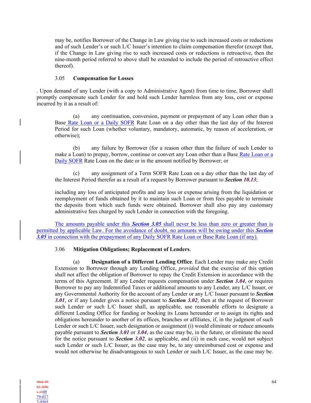 4866-99 02-2696 v.1548 79-017 7-9565 64 may be, notifies Borrower of the Change in Law giving rise to such increased costs or reductions and of such Lender’s or such L/C Issuer’s intention to claim compensation therefor (except that, if the Change in Law giving rise to such increased costs or reductions is retroactive, then the nine-month period referred to above shall be extended to include the period of retroactive effect thereof). 3.05 Compensation for Losses . Upon demand of any Lender (with a copy to Administrative Agent) from time to time, Borrower shall promptly compensate such Lender for and hold such Lender harmless from any loss, cost or expense incurred by it as a result of: (a) any continuation, conversion, payment or prepayment of any Loan other than a Base Rate Loan or a Daily SOFR Rate Loan on a day other than the last day of the Interest Period for such Loan (whether voluntary, mandatory, automatic, by reason of acceleration, or otherwise); (b) any failure by Borrower (for a reason other than the failure of such Lender to make a Loan) to prepay, borrow, continue or convert any Loan other than a Base Rate Loan or a Daily SOFR Rate Loan on the date or in the amount notified by Borrower; or (c) any assignment of a Term SOFR Rate Loan on a day other than the last day of the Interest Period therefor as a result of a request by Borrower pursuant to Section 10.13; including any loss of anticipated profits and any loss or expense arising from the liquidation or reemployment of funds obtained by it to maintain such Loan or from fees payable to terminate the deposits from which such funds were obtained. Borrower shall also pay any customary administrative fees charged by such Lender in connection with the foregoing. The amounts payable under this Section 3.05 shall never be less than zero or greater than is permitted by applicable Law. For the avoidance of doubt, no amounts will be owing under this Section 3.05 in connection with the prepayment of any Daily SOFR Rate Loan or Base Rate Loan (if any). 3.06 Mitigation Obligations; Replacement of Lenders. (a) Designation of a Different Lending Office. Each Lender may make any Credit Extension to Borrower through any Lending Office, provided that the exercise of this option shall not affect the obligation of Borrower to repay the Credit Extension in accordance with the terms of this Agreement. If any Lender requests compensation under Section 3.04, or requires Borrower to pay any Indemnified Taxes or additional amounts to any Lender, any L/C Issuer, or any Governmental Authority for the account of any Lender or any L/C Issuer pursuant to Section 3.01, or if any Lender gives a notice pursuant to Section 3.02, then at the request of Borrower such Lender or such L/C Issuer shall, as applicable, use reasonable efforts to designate a different Lending Office for funding or booking its Loans hereunder or to assign its rights and obligations hereunder to another of its offices, branches or affiliates, if, in the judgment of such Lender or such L/C Issuer, such designation or assignment (i) would eliminate or reduce amounts payable pursuant to Section 3.01 or 3.04, as the case may be, in the future, or eliminate the need for the notice pursuant to Section 3.02, as applicable, and (ii) in each case, would not subject such Lender or such L/C Issuer, as the case may be, to any unreimbursed cost or expense and would not otherwise be disadvantageous to such Lender or such L/C Issuer, as the case may be.