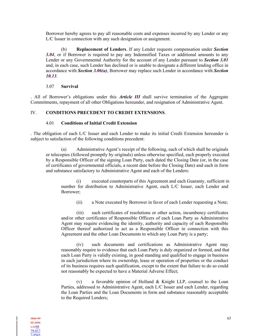 4866-99 02-2696 v.1548 79-017 7-9565 65 Borrower hereby agrees to pay all reasonable costs and expenses incurred by any Lender or any L/C Issuer in connection with any such designation or assignment. (b) Replacement of Lenders. If any Lender requests compensation under Section 3.04, or if Borrower is required to pay any Indemnified Taxes or additional amounts to any Lender or any Governmental Authority for the account of any Lender pursuant to Section 3.01 and, in each case, such Lender has declined or is unable to designate a different lending office in accordance with Section 3.06(a), Borrower may replace such Lender in accordance with Section 10.13. 3.07 Survival . All of Borrower’s obligations under this Article III shall survive termination of the Aggregate Commitments, repayment of all other Obligations hereunder, and resignation of Administrative Agent. IV. CONDITIONS PRECEDENT TO CREDIT EXTENSIONS. 4.01 Conditions of Initial Credit Extension . The obligation of each L/C Issuer and each Lender to make its initial Credit Extension hereunder is subject to satisfaction of the following conditions precedent: (a) Administrative Agent’s receipt of the following, each of which shall be originals or telecopies (followed promptly by originals) unless otherwise specified, each properly executed by a Responsible Officer of the signing Loan Party, each dated the Closing Date (or, in the case of certificates of governmental officials, a recent date before the Closing Date) and each in form and substance satisfactory to Administrative Agent and each of the Lenders: (i) executed counterparts of this Agreement and each Guaranty, sufficient in number for distribution to Administrative Agent, each L/C Issuer, each Lender and Borrower; (ii) a Note executed by Borrower in favor of each Lender requesting a Note; (iii) such certificates of resolutions or other action, incumbency certificates and/or other certificates of Responsible Officers of each Loan Party as Administrative Agent may require evidencing the identity, authority and capacity of each Responsible Officer thereof authorized to act as a Responsible Officer in connection with this Agreement and the other Loan Documents to which any Loan Party is a party; (iv) such documents and certifications as Administrative Agent may reasonably require to evidence that each Loan Party is duly organized or formed, and that each Loan Party is validly existing, in good standing and qualified to engage in business in each jurisdiction where its ownership, lease or operation of properties or the conduct of its business requires such qualification, except to the extent that failure to do so could not reasonably be expected to have a Material Adverse Effect; (v) a favorable opinion of Holland & Knight LLP, counsel to the Loan Parties, addressed to Administrative Agent, each L/C Issuer and each Lender, regarding the Loan Parties and the Loan Documents in form and substance reasonably acceptable to the Required Lenders;