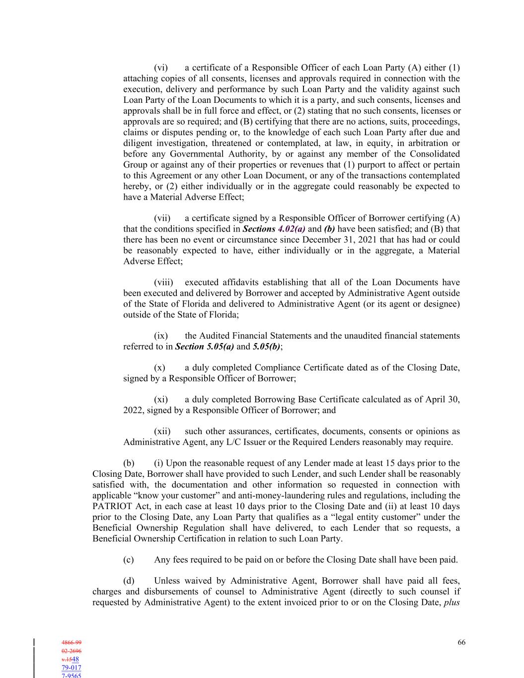 4866-99 02-2696 v.1548 79-017 7-9565 66 (vi) a certificate of a Responsible Officer of each Loan Party (A) either (1) attaching copies of all consents, licenses and approvals required in connection with the execution, delivery and performance by such Loan Party and the validity against such Loan Party of the Loan Documents to which it is a party, and such consents, licenses and approvals shall be in full force and effect, or (2) stating that no such consents, licenses or approvals are so required; and (B) certifying that there are no actions, suits, proceedings, claims or disputes pending or, to the knowledge of each such Loan Party after due and diligent investigation, threatened or contemplated, at law, in equity, in arbitration or before any Governmental Authority, by or against any member of the Consolidated Group or against any of their properties or revenues that (1) purport to affect or pertain to this Agreement or any other Loan Document, or any of the transactions contemplated hereby, or (2) either individually or in the aggregate could reasonably be expected to have a Material Adverse Effect; (vii) a certificate signed by a Responsible Officer of Borrower certifying (A) that the conditions specified in Sections 4.02(a) and (b) have been satisfied; and (B) that there has been no event or circumstance since December 31, 2021 that has had or could be reasonably expected to have, either individually or in the aggregate, a Material Adverse Effect; (viii) executed affidavits establishing that all of the Loan Documents have been executed and delivered by Borrower and accepted by Administrative Agent outside of the State of Florida and delivered to Administrative Agent (or its agent or designee) outside of the State of Florida; (ix) the Audited Financial Statements and the unaudited financial statements referred to in Section 5.05(a) and 5.05(b); (x) a duly completed Compliance Certificate dated as of the Closing Date, signed by a Responsible Officer of Borrower; (xi) a duly completed Borrowing Base Certificate calculated as of April 30, 2022, signed by a Responsible Officer of Borrower; and (xii) such other assurances, certificates, documents, consents or opinions as Administrative Agent, any L/C Issuer or the Required Lenders reasonably may require. (b) (i) Upon the reasonable request of any Lender made at least 15 days prior to the Closing Date, Borrower shall have provided to such Lender, and such Lender shall be reasonably satisfied with, the documentation and other information so requested in connection with applicable “know your customer” and anti-money-laundering rules and regulations, including the PATRIOT Act, in each case at least 10 days prior to the Closing Date and (ii) at least 10 days prior to the Closing Date, any Loan Party that qualifies as a “legal entity customer” under the Beneficial Ownership Regulation shall have delivered, to each Lender that so requests, a Beneficial Ownership Certification in relation to such Loan Party. (c) Any fees required to be paid on or before the Closing Date shall have been paid. (d) Unless waived by Administrative Agent, Borrower shall have paid all fees, charges and disbursements of counsel to Administrative Agent (directly to such counsel if requested by Administrative Agent) to the extent invoiced prior to or on the Closing Date, plus