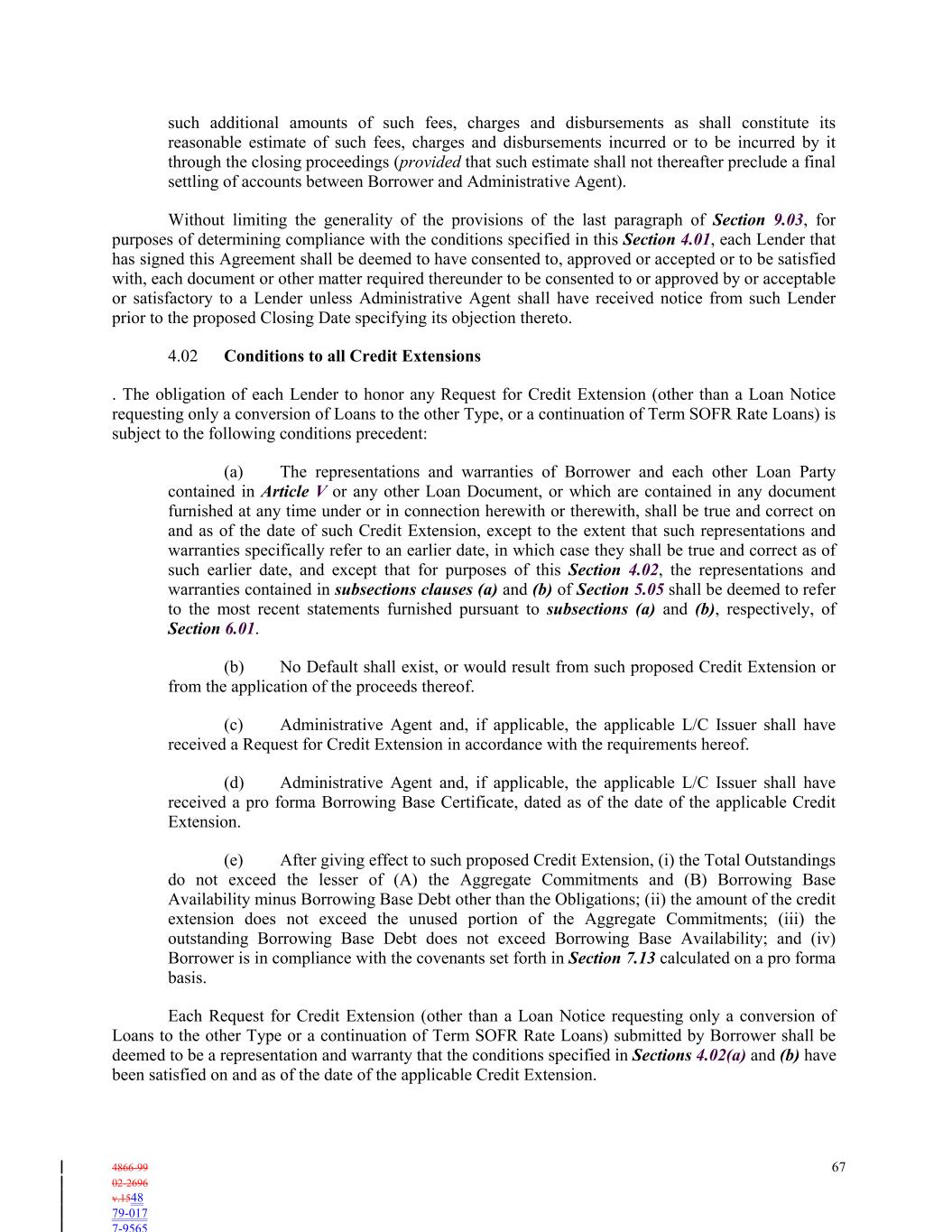 4866-99 02-2696 v.1548 79-017 7-9565 67 such additional amounts of such fees, charges and disbursements as shall constitute its reasonable estimate of such fees, charges and disbursements incurred or to be incurred by it through the closing proceedings (provided that such estimate shall not thereafter preclude a final settling of accounts between Borrower and Administrative Agent). Without limiting the generality of the provisions of the last paragraph of Section 9.03, for purposes of determining compliance with the conditions specified in this Section 4.01, each Lender that has signed this Agreement shall be deemed to have consented to, approved or accepted or to be satisfied with, each document or other matter required thereunder to be consented to or approved by or acceptable or satisfactory to a Lender unless Administrative Agent shall have received notice from such Lender prior to the proposed Closing Date specifying its objection thereto. 4.02 Conditions to all Credit Extensions . The obligation of each Lender to honor any Request for Credit Extension (other than a Loan Notice requesting only a conversion of Loans to the other Type, or a continuation of Term SOFR Rate Loans) is subject to the following conditions precedent: (a) The representations and warranties of Borrower and each other Loan Party contained in Article V or any other Loan Document, or which are contained in any document furnished at any time under or in connection herewith or therewith, shall be true and correct on and as of the date of such Credit Extension, except to the extent that such representations and warranties specifically refer to an earlier date, in which case they shall be true and correct as of such earlier date, and except that for purposes of this Section 4.02, the representations and warranties contained in subsections clauses (a) and (b) of Section 5.05 shall be deemed to refer to the most recent statements furnished pursuant to subsections (a) and (b), respectively, of Section 6.01. (b) No Default shall exist, or would result from such proposed Credit Extension or from the application of the proceeds thereof. (c) Administrative Agent and, if applicable, the applicable L/C Issuer shall have received a Request for Credit Extension in accordance with the requirements hereof. (d) Administrative Agent and, if applicable, the applicable L/C Issuer shall have received a pro forma Borrowing Base Certificate, dated as of the date of the applicable Credit Extension. (e) After giving effect to such proposed Credit Extension, (i) the Total Outstandings do not exceed the lesser of (A) the Aggregate Commitments and (B) Borrowing Base Availability minus Borrowing Base Debt other than the Obligations; (ii) the amount of the credit extension does not exceed the unused portion of the Aggregate Commitments; (iii) the outstanding Borrowing Base Debt does not exceed Borrowing Base Availability; and (iv) Borrower is in compliance with the covenants set forth in Section 7.13 calculated on a pro forma basis. Each Request for Credit Extension (other than a Loan Notice requesting only a conversion of Loans to the other Type or a continuation of Term SOFR Rate Loans) submitted by Borrower shall be deemed to be a representation and warranty that the conditions specified in Sections 4.02(a) and (b) have been satisfied on and as of the date of the applicable Credit Extension.