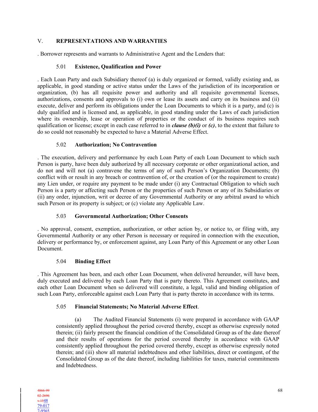 4866-99 02-2696 v.1548 79-017 7-9565 68 V. REPRESENTATIONS AND WARRANTIES . Borrower represents and warrants to Administrative Agent and the Lenders that: 5.01 Existence, Qualification and Power . Each Loan Party and each Subsidiary thereof (a) is duly organized or formed, validly existing and, as applicable, in good standing or active status under the Laws of the jurisdiction of its incorporation or organization, (b) has all requisite power and authority and all requisite governmental licenses, authorizations, consents and approvals to (i) own or lease its assets and carry on its business and (ii) execute, deliver and perform its obligations under the Loan Documents to which it is a party, and (c) is duly qualified and is licensed and, as applicable, in good standing under the Laws of each jurisdiction where its ownership, lease or operation of properties or the conduct of its business requires such qualification or license; except in each case referred to in clause (b)(i) or (c), to the extent that failure to do so could not reasonably be expected to have a Material Adverse Effect. 5.02 Authorization; No Contravention . The execution, delivery and performance by each Loan Party of each Loan Document to which such Person is party, have been duly authorized by all necessary corporate or other organizational action, and do not and will not (a) contravene the terms of any of such Person’s Organization Documents; (b) conflict with or result in any breach or contravention of, or the creation of (or the requirement to create) any Lien under, or require any payment to be made under (i) any Contractual Obligation to which such Person is a party or affecting such Person or the properties of such Person or any of its Subsidiaries or (ii) any order, injunction, writ or decree of any Governmental Authority or any arbitral award to which such Person or its property is subject; or (c) violate any Applicable Law. 5.03 Governmental Authorization; Other Consents . No approval, consent, exemption, authorization, or other action by, or notice to, or filing with, any Governmental Authority or any other Person is necessary or required in connection with the execution, delivery or performance by, or enforcement against, any Loan Party of this Agreement or any other Loan Document. 5.04 Binding Effect . This Agreement has been, and each other Loan Document, when delivered hereunder, will have been, duly executed and delivered by each Loan Party that is party thereto. This Agreement constitutes, and each other Loan Document when so delivered will constitute, a legal, valid and binding obligation of such Loan Party, enforceable against each Loan Party that is party thereto in accordance with its terms. 5.05 Financial Statements; No Material Adverse Effect. (a) The Audited Financial Statements (i) were prepared in accordance with GAAP consistently applied throughout the period covered thereby, except as otherwise expressly noted therein; (ii) fairly present the financial condition of the Consolidated Group as of the date thereof and their results of operations for the period covered thereby in accordance with GAAP consistently applied throughout the period covered thereby, except as otherwise expressly noted therein; and (iii) show all material indebtedness and other liabilities, direct or contingent, of the Consolidated Group as of the date thereof, including liabilities for taxes, material commitments and Indebtedness.