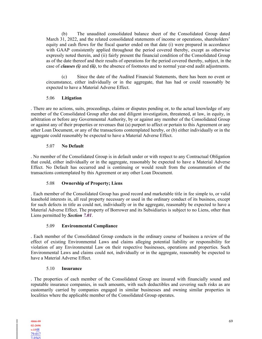 4866-99 02-2696 v.1548 79-017 7-9565 69 (b) The unaudited consolidated balance sheet of the Consolidated Group dated March 31, 2022, and the related consolidated statements of income or operations, shareholders’ equity and cash flows for the fiscal quarter ended on that date (i) were prepared in accordance with GAAP consistently applied throughout the period covered thereby, except as otherwise expressly noted therein, and (ii) fairly present the financial condition of the Consolidated Group as of the date thereof and their results of operations for the period covered thereby, subject, in the case of clauses (i) and (ii), to the absence of footnotes and to normal year-end audit adjustments. (c) Since the date of the Audited Financial Statements, there has been no event or circumstance, either individually or in the aggregate, that has had or could reasonably be expected to have a Material Adverse Effect. 5.06 Litigation . There are no actions, suits, proceedings, claims or disputes pending or, to the actual knowledge of any member of the Consolidated Group after due and diligent investigation, threatened, at law, in equity, in arbitration or before any Governmental Authority, by or against any member of the Consolidated Group or against any of their properties or revenues that (a) purport to affect or pertain to this Agreement or any other Loan Document, or any of the transactions contemplated hereby, or (b) either individually or in the aggregate could reasonably be expected to have a Material Adverse Effect. 5.07 No Default . No member of the Consolidated Group is in default under or with respect to any Contractual Obligation that could, either individually or in the aggregate, reasonably be expected to have a Material Adverse Effect. No Default has occurred and is continuing or would result from the consummation of the transactions contemplated by this Agreement or any other Loan Document. 5.08 Ownership of Property; Liens . Each member of the Consolidated Group has good record and marketable title in fee simple to, or valid leasehold interests in, all real property necessary or used in the ordinary conduct of its business, except for such defects in title as could not, individually or in the aggregate, reasonably be expected to have a Material Adverse Effect. The property of Borrower and its Subsidiaries is subject to no Liens, other than Liens permitted by Section 7.01. 5.09 Environmental Compliance . Each member of the Consolidated Group conducts in the ordinary course of business a review of the effect of existing Environmental Laws and claims alleging potential liability or responsibility for violation of any Environmental Law on their respective businesses, operations and properties. Such Environmental Laws and claims could not, individually or in the aggregate, reasonably be expected to have a Material Adverse Effect. 5.10 Insurance . The properties of each member of the Consolidated Group are insured with financially sound and reputable insurance companies, in such amounts, with such deductibles and covering such risks as are customarily carried by companies engaged in similar businesses and owning similar properties in localities where the applicable member of the Consolidated Group operates.