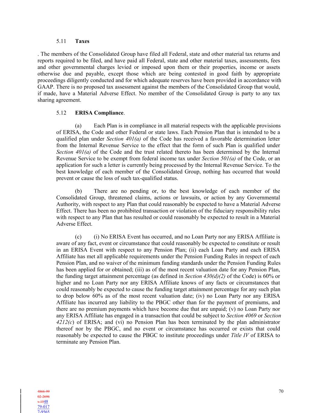 4866-99 02-2696 v.1548 79-017 7-9565 70 5.11 Taxes . The members of the Consolidated Group have filed all Federal, state and other material tax returns and reports required to be filed, and have paid all Federal, state and other material taxes, assessments, fees and other governmental charges levied or imposed upon them or their properties, income or assets otherwise due and payable, except those which are being contested in good faith by appropriate proceedings diligently conducted and for which adequate reserves have been provided in accordance with GAAP. There is no proposed tax assessment against the members of the Consolidated Group that would, if made, have a Material Adverse Effect. No member of the Consolidated Group is party to any tax sharing agreement. 5.12 ERISA Compliance. (a) Each Plan is in compliance in all material respects with the applicable provisions of ERISA, the Code and other Federal or state laws. Each Pension Plan that is intended to be a qualified plan under Section 401(a) of the Code has received a favorable determination letter from the Internal Revenue Service to the effect that the form of such Plan is qualified under Section 401(a) of the Code and the trust related thereto has been determined by the Internal Revenue Service to be exempt from federal income tax under Section 501(a) of the Code, or an application for such a letter is currently being processed by the Internal Revenue Service. To the best knowledge of each member of the Consolidated Group, nothing has occurred that would prevent or cause the loss of such tax-qualified status. (b) There are no pending or, to the best knowledge of each member of the Consolidated Group, threatened claims, actions or lawsuits, or action by any Governmental Authority, with respect to any Plan that could reasonably be expected to have a Material Adverse Effect. There has been no prohibited transaction or violation of the fiduciary responsibility rules with respect to any Plan that has resulted or could reasonably be expected to result in a Material Adverse Effect. (c) (i) No ERISA Event has occurred, and no Loan Party nor any ERISA Affiliate is aware of any fact, event or circumstance that could reasonably be expected to constitute or result in an ERISA Event with respect to any Pension Plan; (ii) each Loan Party and each ERISA Affiliate has met all applicable requirements under the Pension Funding Rules in respect of each Pension Plan, and no waiver of the minimum funding standards under the Pension Funding Rules has been applied for or obtained; (iii) as of the most recent valuation date for any Pension Plan, the funding target attainment percentage (as defined in Section 430(d)(2) of the Code) is 60% or higher and no Loan Party nor any ERISA Affiliate knows of any facts or circumstances that could reasonably be expected to cause the funding target attainment percentage for any such plan to drop below 60% as of the most recent valuation date; (iv) no Loan Party nor any ERISA Affiliate has incurred any liability to the PBGC other than for the payment of premiums, and there are no premium payments which have become due that are unpaid; (v) no Loan Party nor any ERISA Affiliate has engaged in a transaction that could be subject to Section 4069 or Section 4212(c) of ERISA; and (vi) no Pension Plan has been terminated by the plan administrator thereof nor by the PBGC, and no event or circumstance has occurred or exists that could reasonably be expected to cause the PBGC to institute proceedings under Title IV of ERISA to terminate any Pension Plan.