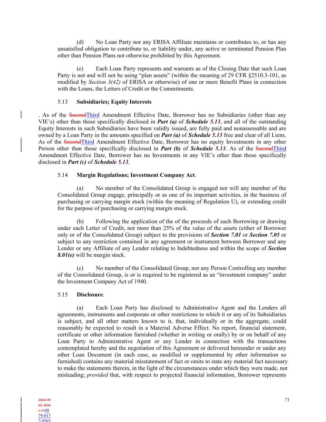 4866-99 02-2696 v.1548 79-017 7-9565 71 (d) No Loan Party nor any ERISA Affiliate maintains or contributes to, or has any unsatisfied obligation to contribute to, or liability under, any active or terminated Pension Plan other than Pension Plans not otherwise prohibited by this Agreement. (e) Each Loan Party represents and warrants as of the Closing Date that such Loan Party is not and will not be using “plan assets” (within the meaning of 29 CFR §2510.3-101, as modified by Section 3(42) of ERISA or otherwise) of one or more Benefit Plans in connection with the Loans, the Letters of Credit or the Commitments. 5.13 Subsidiaries; Equity Interests . As of the SecondThird Amendment Effective Date, Borrower has no Subsidiaries (other than any VIE’s) other than those specifically disclosed in Part (a) of Schedule 5.13, and all of the outstanding Equity Interests in such Subsidiaries have been validly issued, are fully paid and nonassessable and are owned by a Loan Party in the amounts specified on Part (a) of Schedule 5.13 free and clear of all Liens. As of the SecondThird Amendment Effective Date, Borrower has no equity Investments in any other Person other than those specifically disclosed in Part (b) of Schedule 5.13. As of the SecondThird Amendment Effective Date, Borrower has no Investments in any VIE’s other than those specifically disclosed in Part (c) of Schedule 5.13. 5.14 Margin Regulations; Investment Company Act. (a) No member of the Consolidated Group is engaged nor will any member of the Consolidated Group engage, principally or as one of its important activities, in the business of purchasing or carrying margin stock (within the meaning of Regulation U), or extending credit for the purpose of purchasing or carrying margin stock. (b) Following the application of the of the proceeds of each Borrowing or drawing under each Letter of Credit, not more than 25% of the value of the assets (either of Borrower only or of the Consolidated Group) subject to the provisions of Section 7.01 or Section 7.05 or subject to any restriction contained in any agreement or instrument between Borrower and any Lender or any Affiliate of any Lender relating to Indebtedness and within the scope of Section 8.01(e) will be margin stock. (c) No member of the Consolidated Group, nor any Person Controlling any member of the Consolidated Group, is or is required to be registered as an “investment company” under the Investment Company Act of 1940. 5.15 Disclosure. (a) Each Loan Party has disclosed to Administrative Agent and the Lenders all agreements, instruments and corporate or other restrictions to which it or any of its Subsidiaries is subject, and all other matters known to it, that, individually or in the aggregate, could reasonably be expected to result in a Material Adverse Effect. No report, financial statement, certificate or other information furnished (whether in writing or orally) by or on behalf of any Loan Party to Administrative Agent or any Lender in connection with the transactions contemplated hereby and the negotiation of this Agreement or delivered hereunder or under any other Loan Document (in each case, as modified or supplemented by other information so furnished) contains any material misstatement of fact or omits to state any material fact necessary to make the statements therein, in the light of the circumstances under which they were made, not misleading; provided that, with respect to projected financial information, Borrower represents
