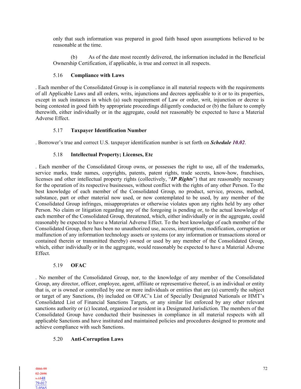 4866-99 02-2696 v.1548 79-017 7-9565 72 only that such information was prepared in good faith based upon assumptions believed to be reasonable at the time. (b) As of the date most recently delivered, the information included in the Beneficial Ownership Certification, if applicable, is true and correct in all respects. 5.16 Compliance with Laws . Each member of the Consolidated Group is in compliance in all material respects with the requirements of all Applicable Laws and all orders, writs, injunctions and decrees applicable to it or to its properties, except in such instances in which (a) such requirement of Law or order, writ, injunction or decree is being contested in good faith by appropriate proceedings diligently conducted or (b) the failure to comply therewith, either individually or in the aggregate, could not reasonably be expected to have a Material Adverse Effect. 5.17 Taxpayer Identification Number . Borrower’s true and correct U.S. taxpayer identification number is set forth on Schedule 10.02. 5.18 Intellectual Property; Licenses, Etc . Each member of the Consolidated Group owns, or possesses the right to use, all of the trademarks, service marks, trade names, copyrights, patents, patent rights, trade secrets, know-how, franchises, licenses and other intellectual property rights (collectively, “IP Rights”) that are reasonably necessary for the operation of its respective businesses, without conflict with the rights of any other Person. To the best knowledge of each member of the Consolidated Group, no product, service, process, method, substance, part or other material now used, or now contemplated to be used, by any member of the Consolidated Group infringes, misappropriates or otherwise violates upon any rights held by any other Person. No claim or litigation regarding any of the foregoing is pending or, to the actual knowledge of each member of the Consolidated Group, threatened, which, either individually or in the aggregate, could reasonably be expected to have a Material Adverse Effect. To the best knowledge of each member of the Consolidated Group, there has been no unauthorized use, access, interruption, modification, corruption or malfunction of any information technology assets or systems (or any information or transactions stored or contained therein or transmitted thereby) owned or used by any member of the Consolidated Group, which, either individually or in the aggregate, would reasonably be expected to have a Material Adverse Effect. 5.19 OFAC . No member of the Consolidated Group, nor, to the knowledge of any member of the Consolidated Group, any director, officer, employee, agent, affiliate or representative thereof, is an individual or entity that is, or is owned or controlled by one or more individuals or entities that are (a) currently the subject or target of any Sanctions, (b) included on OFAC’s List of Specially Designated Nationals or HMT’s Consolidated List of Financial Sanctions Targets, or any similar list enforced by any other relevant sanctions authority or (c) located, organized or resident in a Designated Jurisdiction. The members of the Consolidated Group have conducted their businesses in compliance in all material respects with all applicable Sanctions and have instituted and maintained policies and procedures designed to promote and achieve compliance with such Sanctions. 5.20 Anti-Corruption Laws