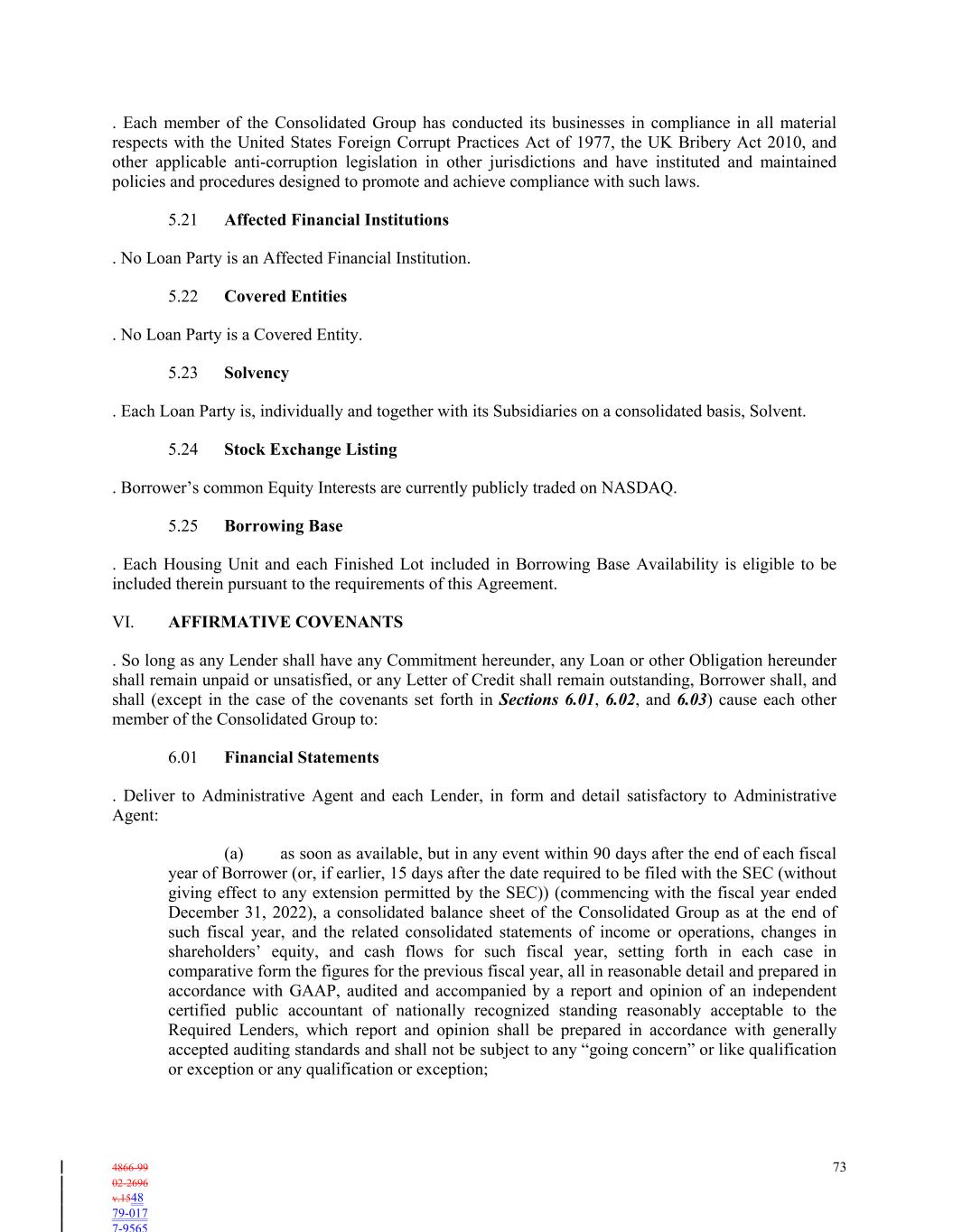 4866-99 02-2696 v.1548 79-017 7-9565 73 . Each member of the Consolidated Group has conducted its businesses in compliance in all material respects with the United States Foreign Corrupt Practices Act of 1977, the UK Bribery Act 2010, and other applicable anti-corruption legislation in other jurisdictions and have instituted and maintained policies and procedures designed to promote and achieve compliance with such laws. 5.21 Affected Financial Institutions . No Loan Party is an Affected Financial Institution. 5.22 Covered Entities . No Loan Party is a Covered Entity. 5.23 Solvency . Each Loan Party is, individually and together with its Subsidiaries on a consolidated basis, Solvent. 5.24 Stock Exchange Listing . Borrower’s common Equity Interests are currently publicly traded on NASDAQ. 5.25 Borrowing Base . Each Housing Unit and each Finished Lot included in Borrowing Base Availability is eligible to be included therein pursuant to the requirements of this Agreement. VI. AFFIRMATIVE COVENANTS . So long as any Lender shall have any Commitment hereunder, any Loan or other Obligation hereunder shall remain unpaid or unsatisfied, or any Letter of Credit shall remain outstanding, Borrower shall, and shall (except in the case of the covenants set forth in Sections 6.01, 6.02, and 6.03) cause each other member of the Consolidated Group to: 6.01 Financial Statements . Deliver to Administrative Agent and each Lender, in form and detail satisfactory to Administrative Agent: (a) as soon as available, but in any event within 90 days after the end of each fiscal year of Borrower (or, if earlier, 15 days after the date required to be filed with the SEC (without giving effect to any extension permitted by the SEC)) (commencing with the fiscal year ended December 31, 2022), a consolidated balance sheet of the Consolidated Group as at the end of such fiscal year, and the related consolidated statements of income or operations, changes in shareholders’ equity, and cash flows for such fiscal year, setting forth in each case in comparative form the figures for the previous fiscal year, all in reasonable detail and prepared in accordance with GAAP, audited and accompanied by a report and opinion of an independent certified public accountant of nationally recognized standing reasonably acceptable to the Required Lenders, which report and opinion shall be prepared in accordance with generally accepted auditing standards and shall not be subject to any “going concern” or like qualification or exception or any qualification or exception;