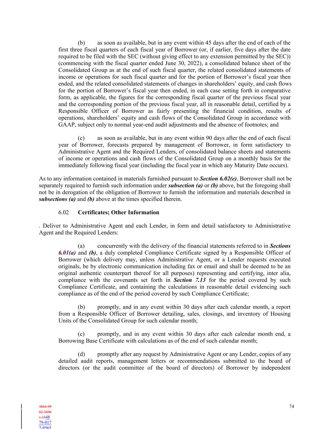4866-99 02-2696 v.1548 79-017 7-9565 74 (b) as soon as available, but in any event within 45 days after the end of each of the first three fiscal quarters of each fiscal year of Borrower (or, if earlier, five days after the date required to be filed with the SEC (without giving effect to any extension permitted by the SEC)) (commencing with the fiscal quarter ended June 30, 2022), a consolidated balance sheet of the Consolidated Group as at the end of such fiscal quarter, the related consolidated statements of income or operations for such fiscal quarter and for the portion of Borrower’s fiscal year then ended, and the related consolidated statements of changes in shareholders’ equity, and cash flows for the portion of Borrower’s fiscal year then ended, in each case setting forth in comparative form, as applicable, the figures for the corresponding fiscal quarter of the previous fiscal year and the corresponding portion of the previous fiscal year, all in reasonable detail, certified by a Responsible Officer of Borrower as fairly presenting the financial condition, results of operations, shareholders’ equity and cash flows of the Consolidated Group in accordance with GAAP, subject only to normal year-end audit adjustments and the absence of footnotes; and (c) as soon as available, but in any event within 90 days after the end of each fiscal year of Borrower, forecasts prepared by management of Borrower, in form satisfactory to Administrative Agent and the Required Lenders, of consolidated balance sheets and statements of income or operations and cash flows of the Consolidated Group on a monthly basis for the immediately following fiscal year (including the fiscal year in which any Maturity Date occurs). As to any information contained in materials furnished pursuant to Section 6.02(e), Borrower shall not be separately required to furnish such information under subsection (a) or (b) above, but the foregoing shall not be in derogation of the obligation of Borrower to furnish the information and materials described in subsections (a) and (b) above at the times specified therein. 6.02 Certificates; Other Information . Deliver to Administrative Agent and each Lender, in form and detail satisfactory to Administrative Agent and the Required Lenders: (a) concurrently with the delivery of the financial statements referred to in Sections 6.01(a) and (b), a duly completed Compliance Certificate signed by a Responsible Officer of Borrower (which delivery may, unless Administrative Agent, or a Lender requests executed originals, be by electronic communication including fax or email and shall be deemed to be an original authentic counterpart thereof for all purposes) representing and certifying, inter alia, compliance with the covenants set forth in Section 7.13 for the period covered by such Compliance Certificate, and containing the calculations in reasonable detail evidencing such compliance as of the end of the period covered by such Compliance Certificate; (b) promptly, and in any event within 30 days after each calendar month, a report from a Responsible Officer of Borrower detailing, sales, closings, and inventory of Housing Units of the Consolidated Group for such calendar month; (c) promptly, and in any event within 30 days after each calendar month end, a Borrowing Base Certificate with calculations as of the end of such calendar month; (d) promptly after any request by Administrative Agent or any Lender, copies of any detailed audit reports, management letters or recommendations submitted to the board of directors (or the audit committee of the board of directors) of Borrower by independent