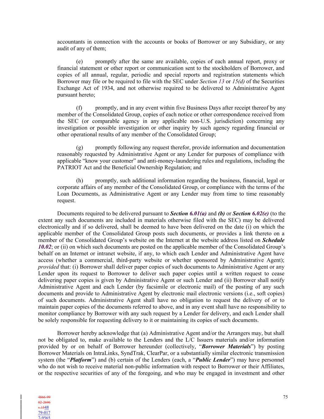 4866-99 02-2696 v.1548 79-017 7-9565 75 accountants in connection with the accounts or books of Borrower or any Subsidiary, or any audit of any of them; (e) promptly after the same are available, copies of each annual report, proxy or financial statement or other report or communication sent to the stockholders of Borrower, and copies of all annual, regular, periodic and special reports and registration statements which Borrower may file or be required to file with the SEC under Section 13 or 15(d) of the Securities Exchange Act of 1934, and not otherwise required to be delivered to Administrative Agent pursuant hereto; (f) promptly, and in any event within five Business Days after receipt thereof by any member of the Consolidated Group, copies of each notice or other correspondence received from the SEC (or comparable agency in any applicable non-U.S. jurisdiction) concerning any investigation or possible investigation or other inquiry by such agency regarding financial or other operational results of any member of the Consolidated Group; (g) promptly following any request therefor, provide information and documentation reasonably requested by Administrative Agent or any Lender for purposes of compliance with applicable “know your customer” and anti-money-laundering rules and regulations, including the PATRIOT Act and the Beneficial Ownership Regulation; and (h) promptly, such additional information regarding the business, financial, legal or corporate affairs of any member of the Consolidated Group, or compliance with the terms of the Loan Documents, as Administrative Agent or any Lender may from time to time reasonably request. Documents required to be delivered pursuant to Section 6.01(a) and (b) or Section 6.02(e) (to the extent any such documents are included in materials otherwise filed with the SEC) may be delivered electronically and if so delivered, shall be deemed to have been delivered on the date (i) on which the applicable member of the Consolidated Group posts such documents, or provides a link thereto on a member of the Consolidated Group’s website on the Internet at the website address listed on Schedule 10.02; or (ii) on which such documents are posted on the applicable member of the Consolidated Group’s behalf on an Internet or intranet website, if any, to which each Lender and Administrative Agent have access (whether a commercial, third-party website or whether sponsored by Administrative Agent); provided that: (i) Borrower shall deliver paper copies of such documents to Administrative Agent or any Lender upon its request to Borrower to deliver such paper copies until a written request to cease delivering paper copies is given by Administrative Agent or such Lender and (ii) Borrower shall notify Administrative Agent and each Lender (by facsimile or electronic mail) of the posting of any such documents and provide to Administrative Agent by electronic mail electronic versions (i.e., soft copies) of such documents. Administrative Agent shall have no obligation to request the delivery of or to maintain paper copies of the documents referred to above, and in any event shall have no responsibility to monitor compliance by Borrower with any such request by a Lender for delivery, and each Lender shall be solely responsible for requesting delivery to it or maintaining its copies of such documents. Borrower hereby acknowledge that (a) Administrative Agent and/or the Arrangers may, but shall not be obligated to, make available to the Lenders and the L/C Issuers materials and/or information provided by or on behalf of Borrower hereunder (collectively, “Borrower Materials”) by posting Borrower Materials on IntraLinks, SyndTrak, ClearPar, or a substantially similar electronic transmission system (the “Platform”) and (b) certain of the Lenders (each, a “Public Lender”) may have personnel who do not wish to receive material non-public information with respect to Borrower or their Affiliates, or the respective securities of any of the foregoing, and who may be engaged in investment and other