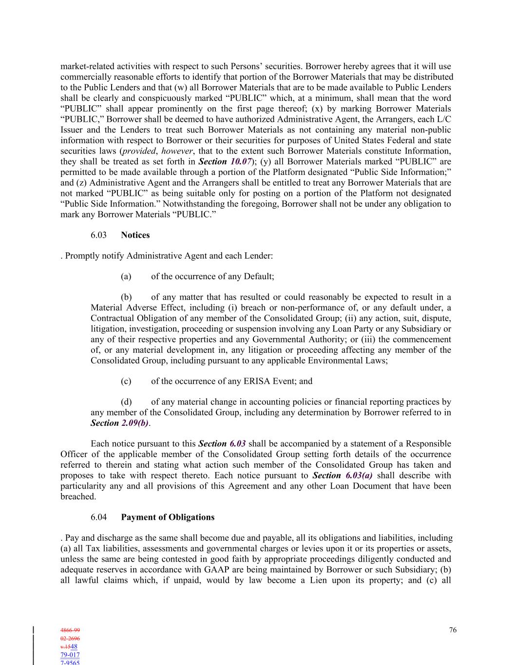 4866-99 02-2696 v.1548 79-017 7-9565 76 market-related activities with respect to such Persons’ securities. Borrower hereby agrees that it will use commercially reasonable efforts to identify that portion of the Borrower Materials that may be distributed to the Public Lenders and that (w) all Borrower Materials that are to be made available to Public Lenders shall be clearly and conspicuously marked “PUBLIC” which, at a minimum, shall mean that the word “PUBLIC” shall appear prominently on the first page thereof; (x) by marking Borrower Materials “PUBLIC,” Borrower shall be deemed to have authorized Administrative Agent, the Arrangers, each L/C Issuer and the Lenders to treat such Borrower Materials as not containing any material non-public information with respect to Borrower or their securities for purposes of United States Federal and state securities laws (provided, however, that to the extent such Borrower Materials constitute Information, they shall be treated as set forth in Section 10.07); (y) all Borrower Materials marked “PUBLIC” are permitted to be made available through a portion of the Platform designated “Public Side Information;” and (z) Administrative Agent and the Arrangers shall be entitled to treat any Borrower Materials that are not marked “PUBLIC” as being suitable only for posting on a portion of the Platform not designated “Public Side Information.” Notwithstanding the foregoing, Borrower shall not be under any obligation to mark any Borrower Materials “PUBLIC.” 6.03 Notices . Promptly notify Administrative Agent and each Lender: (a) of the occurrence of any Default; (b) of any matter that has resulted or could reasonably be expected to result in a Material Adverse Effect, including (i) breach or non-performance of, or any default under, a Contractual Obligation of any member of the Consolidated Group; (ii) any action, suit, dispute, litigation, investigation, proceeding or suspension involving any Loan Party or any Subsidiary or any of their respective properties and any Governmental Authority; or (iii) the commencement of, or any material development in, any litigation or proceeding affecting any member of the Consolidated Group, including pursuant to any applicable Environmental Laws; (c) of the occurrence of any ERISA Event; and (d) of any material change in accounting policies or financial reporting practices by any member of the Consolidated Group, including any determination by Borrower referred to in Section 2.09(b). Each notice pursuant to this Section 6.03 shall be accompanied by a statement of a Responsible Officer of the applicable member of the Consolidated Group setting forth details of the occurrence referred to therein and stating what action such member of the Consolidated Group has taken and proposes to take with respect thereto. Each notice pursuant to Section 6.03(a) shall describe with particularity any and all provisions of this Agreement and any other Loan Document that have been breached. 6.04 Payment of Obligations . Pay and discharge as the same shall become due and payable, all its obligations and liabilities, including (a) all Tax liabilities, assessments and governmental charges or levies upon it or its properties or assets, unless the same are being contested in good faith by appropriate proceedings diligently conducted and adequate reserves in accordance with GAAP are being maintained by Borrower or such Subsidiary; (b) all lawful claims which, if unpaid, would by law become a Lien upon its property; and (c) all