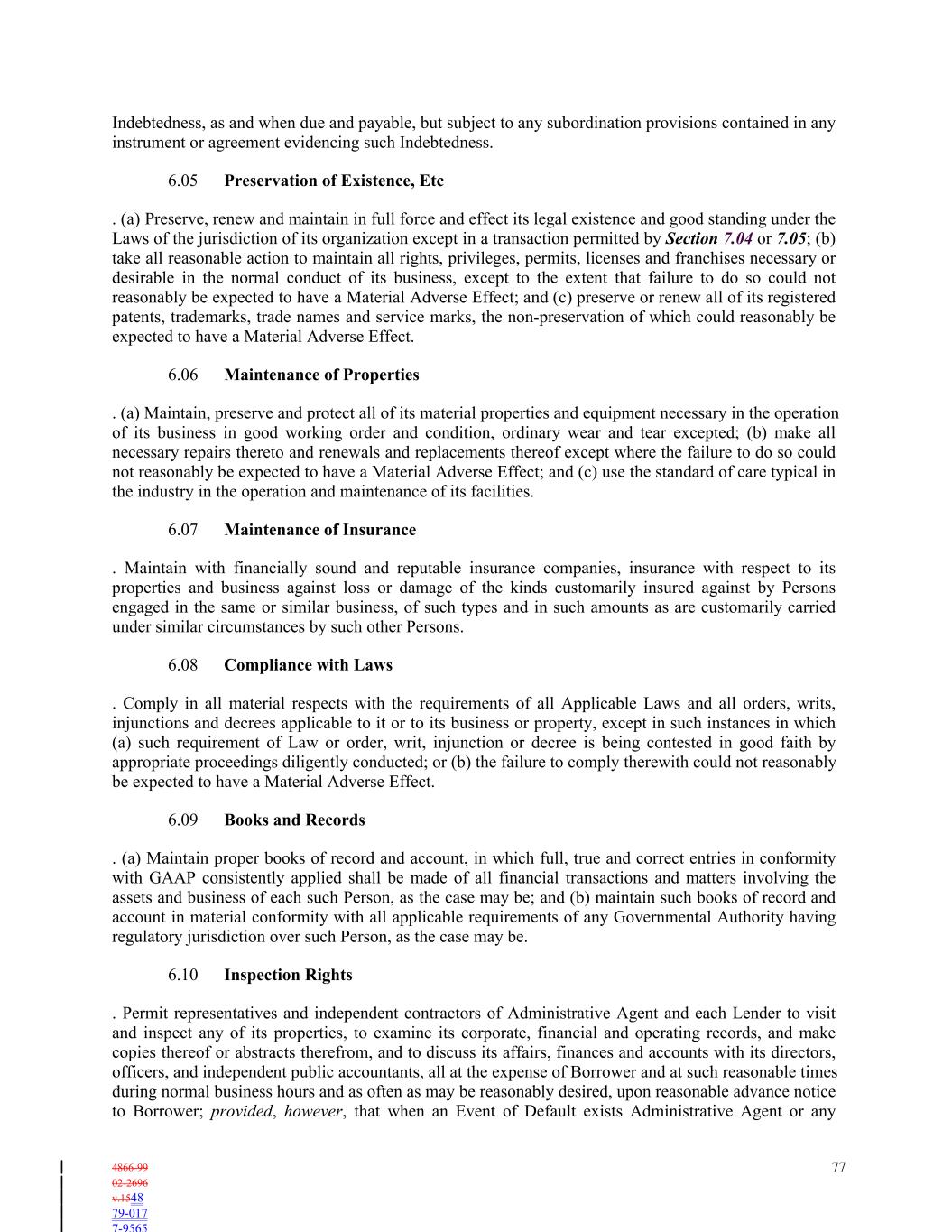 4866-99 02-2696 v.1548 79-017 7-9565 77 Indebtedness, as and when due and payable, but subject to any subordination provisions contained in any instrument or agreement evidencing such Indebtedness. 6.05 Preservation of Existence, Etc . (a) Preserve, renew and maintain in full force and effect its legal existence and good standing under the Laws of the jurisdiction of its organization except in a transaction permitted by Section 7.04 or 7.05; (b) take all reasonable action to maintain all rights, privileges, permits, licenses and franchises necessary or desirable in the normal conduct of its business, except to the extent that failure to do so could not reasonably be expected to have a Material Adverse Effect; and (c) preserve or renew all of its registered patents, trademarks, trade names and service marks, the non-preservation of which could reasonably be expected to have a Material Adverse Effect. 6.06 Maintenance of Properties . (a) Maintain, preserve and protect all of its material properties and equipment necessary in the operation of its business in good working order and condition, ordinary wear and tear excepted; (b) make all necessary repairs thereto and renewals and replacements thereof except where the failure to do so could not reasonably be expected to have a Material Adverse Effect; and (c) use the standard of care typical in the industry in the operation and maintenance of its facilities. 6.07 Maintenance of Insurance . Maintain with financially sound and reputable insurance companies, insurance with respect to its properties and business against loss or damage of the kinds customarily insured against by Persons engaged in the same or similar business, of such types and in such amounts as are customarily carried under similar circumstances by such other Persons. 6.08 Compliance with Laws . Comply in all material respects with the requirements of all Applicable Laws and all orders, writs, injunctions and decrees applicable to it or to its business or property, except in such instances in which (a) such requirement of Law or order, writ, injunction or decree is being contested in good faith by appropriate proceedings diligently conducted; or (b) the failure to comply therewith could not reasonably be expected to have a Material Adverse Effect. 6.09 Books and Records . (a) Maintain proper books of record and account, in which full, true and correct entries in conformity with GAAP consistently applied shall be made of all financial transactions and matters involving the assets and business of each such Person, as the case may be; and (b) maintain such books of record and account in material conformity with all applicable requirements of any Governmental Authority having regulatory jurisdiction over such Person, as the case may be. 6.10 Inspection Rights . Permit representatives and independent contractors of Administrative Agent and each Lender to visit and inspect any of its properties, to examine its corporate, financial and operating records, and make copies thereof or abstracts therefrom, and to discuss its affairs, finances and accounts with its directors, officers, and independent public accountants, all at the expense of Borrower and at such reasonable times during normal business hours and as often as may be reasonably desired, upon reasonable advance notice to Borrower; provided, however, that when an Event of Default exists Administrative Agent or any
