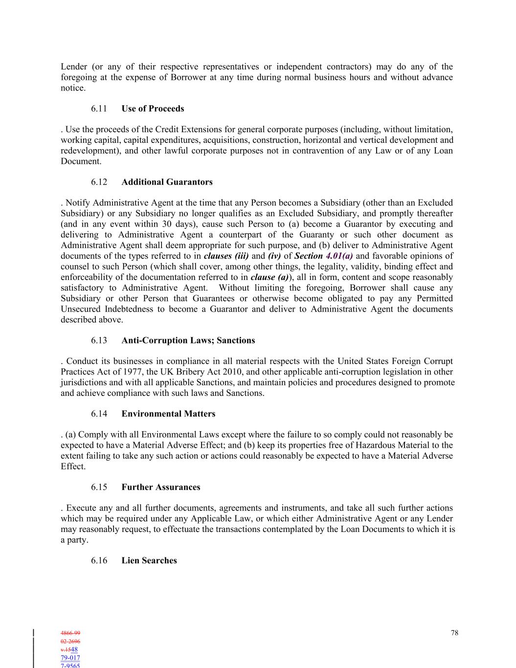 4866-99 02-2696 v.1548 79-017 7-9565 78 Lender (or any of their respective representatives or independent contractors) may do any of the foregoing at the expense of Borrower at any time during normal business hours and without advance notice. 6.11 Use of Proceeds . Use the proceeds of the Credit Extensions for general corporate purposes (including, without limitation, working capital, capital expenditures, acquisitions, construction, horizontal and vertical development and redevelopment), and other lawful corporate purposes not in contravention of any Law or of any Loan Document. 6.12 Additional Guarantors . Notify Administrative Agent at the time that any Person becomes a Subsidiary (other than an Excluded Subsidiary) or any Subsidiary no longer qualifies as an Excluded Subsidiary, and promptly thereafter (and in any event within 30 days), cause such Person to (a) become a Guarantor by executing and delivering to Administrative Agent a counterpart of the Guaranty or such other document as Administrative Agent shall deem appropriate for such purpose, and (b) deliver to Administrative Agent documents of the types referred to in clauses (iii) and (iv) of Section 4.01(a) and favorable opinions of counsel to such Person (which shall cover, among other things, the legality, validity, binding effect and enforceability of the documentation referred to in clause (a)), all in form, content and scope reasonably satisfactory to Administrative Agent. Without limiting the foregoing, Borrower shall cause any Subsidiary or other Person that Guarantees or otherwise become obligated to pay any Permitted Unsecured Indebtedness to become a Guarantor and deliver to Administrative Agent the documents described above. 6.13 Anti-Corruption Laws; Sanctions . Conduct its businesses in compliance in all material respects with the United States Foreign Corrupt Practices Act of 1977, the UK Bribery Act 2010, and other applicable anti-corruption legislation in other jurisdictions and with all applicable Sanctions, and maintain policies and procedures designed to promote and achieve compliance with such laws and Sanctions. 6.14 Environmental Matters . (a) Comply with all Environmental Laws except where the failure to so comply could not reasonably be expected to have a Material Adverse Effect; and (b) keep its properties free of Hazardous Material to the extent failing to take any such action or actions could reasonably be expected to have a Material Adverse Effect. 6.15 Further Assurances . Execute any and all further documents, agreements and instruments, and take all such further actions which may be required under any Applicable Law, or which either Administrative Agent or any Lender may reasonably request, to effectuate the transactions contemplated by the Loan Documents to which it is a party. 6.16 Lien Searches