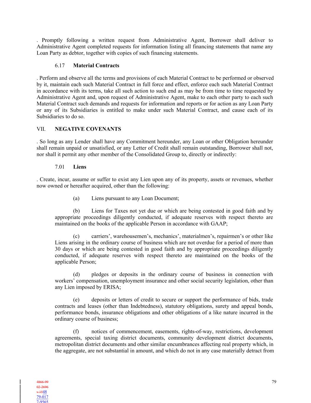 4866-99 02-2696 v.1548 79-017 7-9565 79 . Promptly following a written request from Administrative Agent, Borrower shall deliver to Administrative Agent completed requests for information listing all financing statements that name any Loan Party as debtor, together with copies of such financing statements. 6.17 Material Contracts . Perform and observe all the terms and provisions of each Material Contract to be performed or observed by it, maintain each such Material Contract in full force and effect, enforce each such Material Contract in accordance with its terms, take all such action to such end as may be from time to time requested by Administrative Agent and, upon request of Administrative Agent, make to each other party to each such Material Contract such demands and requests for information and reports or for action as any Loan Party or any of its Subsidiaries is entitled to make under such Material Contract, and cause each of its Subsidiaries to do so. VII. NEGATIVE COVENANTS . So long as any Lender shall have any Commitment hereunder, any Loan or other Obligation hereunder shall remain unpaid or unsatisfied, or any Letter of Credit shall remain outstanding, Borrower shall not, nor shall it permit any other member of the Consolidated Group to, directly or indirectly: 7.01 Liens . Create, incur, assume or suffer to exist any Lien upon any of its property, assets or revenues, whether now owned or hereafter acquired, other than the following: (a) Liens pursuant to any Loan Document; (b) Liens for Taxes not yet due or which are being contested in good faith and by appropriate proceedings diligently conducted, if adequate reserves with respect thereto are maintained on the books of the applicable Person in accordance with GAAP; (c) carriers’, warehousemen’s, mechanics’, materialmen’s, repairmen’s or other like Liens arising in the ordinary course of business which are not overdue for a period of more than 30 days or which are being contested in good faith and by appropriate proceedings diligently conducted, if adequate reserves with respect thereto are maintained on the books of the applicable Person; (d) pledges or deposits in the ordinary course of business in connection with workers’ compensation, unemployment insurance and other social security legislation, other than any Lien imposed by ERISA; (e) deposits or letters of credit to secure or support the performance of bids, trade contracts and leases (other than Indebtedness), statutory obligations, surety and appeal bonds, performance bonds, insurance obligations and other obligations of a like nature incurred in the ordinary course of business; (f) notices of commencement, easements, rights-of-way, restrictions, development agreements, special taxing district documents, community development district documents, metropolitan district documents and other similar encumbrances affecting real property which, in the aggregate, are not substantial in amount, and which do not in any case materially detract from