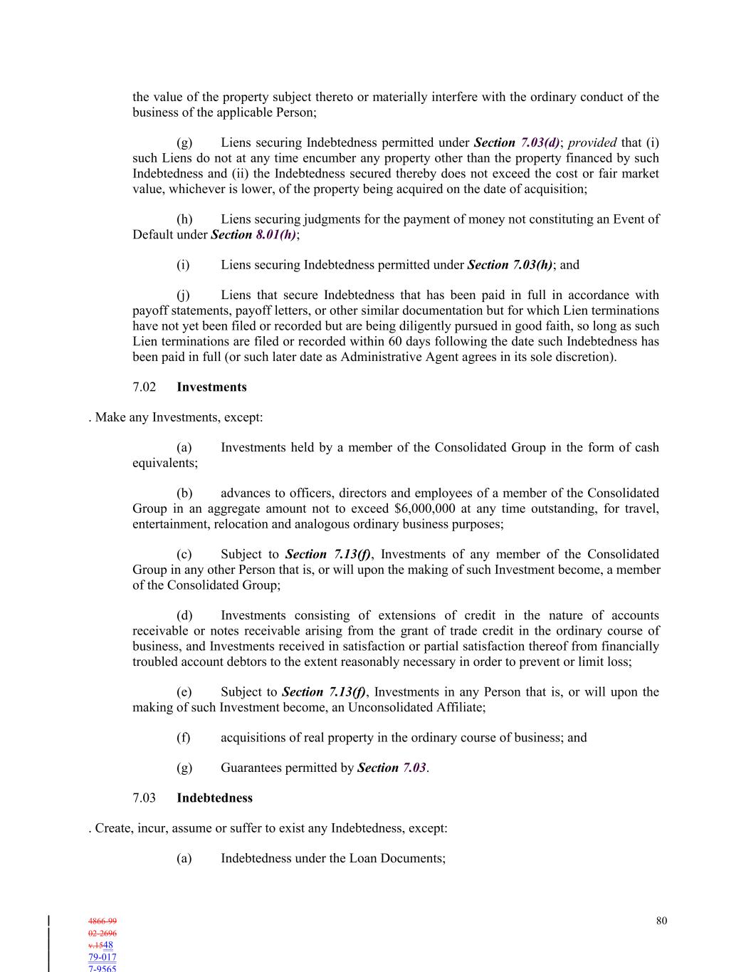 4866-99 02-2696 v.1548 79-017 7-9565 80 the value of the property subject thereto or materially interfere with the ordinary conduct of the business of the applicable Person; (g) Liens securing Indebtedness permitted under Section 7.03(d); provided that (i) such Liens do not at any time encumber any property other than the property financed by such Indebtedness and (ii) the Indebtedness secured thereby does not exceed the cost or fair market value, whichever is lower, of the property being acquired on the date of acquisition; (h) Liens securing judgments for the payment of money not constituting an Event of Default under Section 8.01(h); (i) Liens securing Indebtedness permitted under Section 7.03(h); and (j) Liens that secure Indebtedness that has been paid in full in accordance with payoff statements, payoff letters, or other similar documentation but for which Lien terminations have not yet been filed or recorded but are being diligently pursued in good faith, so long as such Lien terminations are filed or recorded within 60 days following the date such Indebtedness has been paid in full (or such later date as Administrative Agent agrees in its sole discretion). 7.02 Investments . Make any Investments, except: (a) Investments held by a member of the Consolidated Group in the form of cash equivalents; (b) advances to officers, directors and employees of a member of the Consolidated Group in an aggregate amount not to exceed $6,000,000 at any time outstanding, for travel, entertainment, relocation and analogous ordinary business purposes; (c) Subject to Section 7.13(f), Investments of any member of the Consolidated Group in any other Person that is, or will upon the making of such Investment become, a member of the Consolidated Group; (d) Investments consisting of extensions of credit in the nature of accounts receivable or notes receivable arising from the grant of trade credit in the ordinary course of business, and Investments received in satisfaction or partial satisfaction thereof from financially troubled account debtors to the extent reasonably necessary in order to prevent or limit loss; (e) Subject to Section 7.13(f), Investments in any Person that is, or will upon the making of such Investment become, an Unconsolidated Affiliate; (f) acquisitions of real property in the ordinary course of business; and (g) Guarantees permitted by Section 7.03. 7.03 Indebtedness . Create, incur, assume or suffer to exist any Indebtedness, except: (a) Indebtedness under the Loan Documents;