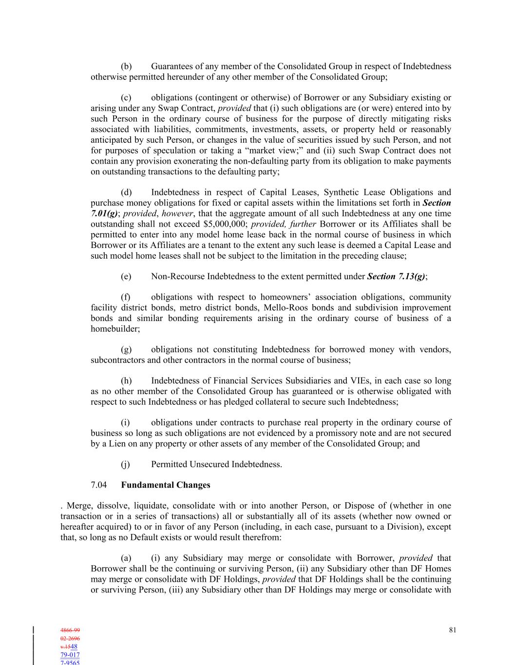 4866-99 02-2696 v.1548 79-017 7-9565 81 (b) Guarantees of any member of the Consolidated Group in respect of Indebtedness otherwise permitted hereunder of any other member of the Consolidated Group; (c) obligations (contingent or otherwise) of Borrower or any Subsidiary existing or arising under any Swap Contract, provided that (i) such obligations are (or were) entered into by such Person in the ordinary course of business for the purpose of directly mitigating risks associated with liabilities, commitments, investments, assets, or property held or reasonably anticipated by such Person, or changes in the value of securities issued by such Person, and not for purposes of speculation or taking a “market view;” and (ii) such Swap Contract does not contain any provision exonerating the non-defaulting party from its obligation to make payments on outstanding transactions to the defaulting party; (d) Indebtedness in respect of Capital Leases, Synthetic Lease Obligations and purchase money obligations for fixed or capital assets within the limitations set forth in Section 7.01(g); provided, however, that the aggregate amount of all such Indebtedness at any one time outstanding shall not exceed $5,000,000; provided, further Borrower or its Affiliates shall be permitted to enter into any model home lease back in the normal course of business in which Borrower or its Affiliates are a tenant to the extent any such lease is deemed a Capital Lease and such model home leases shall not be subject to the limitation in the preceding clause; (e) Non-Recourse Indebtedness to the extent permitted under Section 7.13(g); (f) obligations with respect to homeowners’ association obligations, community facility district bonds, metro district bonds, Mello-Roos bonds and subdivision improvement bonds and similar bonding requirements arising in the ordinary course of business of a homebuilder; (g) obligations not constituting Indebtedness for borrowed money with vendors, subcontractors and other contractors in the normal course of business; (h) Indebtedness of Financial Services Subsidiaries and VIEs, in each case so long as no other member of the Consolidated Group has guaranteed or is otherwise obligated with respect to such Indebtedness or has pledged collateral to secure such Indebtedness; (i) obligations under contracts to purchase real property in the ordinary course of business so long as such obligations are not evidenced by a promissory note and are not secured by a Lien on any property or other assets of any member of the Consolidated Group; and (j) Permitted Unsecured Indebtedness. 7.04 Fundamental Changes . Merge, dissolve, liquidate, consolidate with or into another Person, or Dispose of (whether in one transaction or in a series of transactions) all or substantially all of its assets (whether now owned or hereafter acquired) to or in favor of any Person (including, in each case, pursuant to a Division), except that, so long as no Default exists or would result therefrom: (a) (i) any Subsidiary may merge or consolidate with Borrower, provided that Borrower shall be the continuing or surviving Person, (ii) any Subsidiary other than DF Homes may merge or consolidate with DF Holdings, provided that DF Holdings shall be the continuing or surviving Person, (iii) any Subsidiary other than DF Holdings may merge or consolidate with