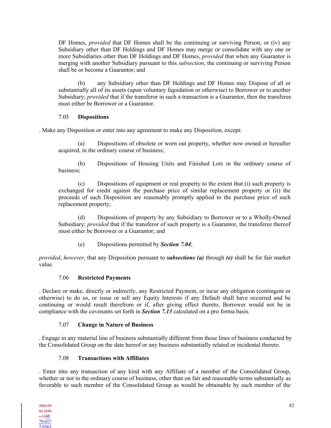 4866-99 02-2696 v.1548 79-017 7-9565 82 DF Homes, provided that DF Homes shall be the continuing or surviving Person, or (iv) any Subsidiary other than DF Holdings and DF Homes may merge or consolidate with any one or more Subsidiaries other than DF Holdings and DF Homes, provided that when any Guarantor is merging with another Subsidiary pursuant to this subsection, the continuing or surviving Person shall be or become a Guarantor; and (b) any Subsidiary other than DF Holdings and DF Homes may Dispose of all or substantially all of its assets (upon voluntary liquidation or otherwise) to Borrower or to another Subsidiary; provided that if the transferor in such a transaction is a Guarantor, then the transferee must either be Borrower or a Guarantor. 7.05 Dispositions . Make any Disposition or enter into any agreement to make any Disposition, except: (a) Dispositions of obsolete or worn out property, whether now owned or hereafter acquired, in the ordinary course of business; (b) Dispositions of Housing Units and Finished Lots in the ordinary course of business; (c) Dispositions of equipment or real property to the extent that (i) such property is exchanged for credit against the purchase price of similar replacement property or (ii) the proceeds of such Disposition are reasonably promptly applied to the purchase price of such replacement property; (d) Dispositions of property by any Subsidiary to Borrower or to a Wholly-Owned Subsidiary; provided that if the transferor of such property is a Guarantor, the transferee thereof must either be Borrower or a Guarantor; and (e) Dispositions permitted by Section 7.04; provided, however, that any Disposition pursuant to subsections (a) through (e) shall be for fair market value. 7.06 Restricted Payments . Declare or make, directly or indirectly, any Restricted Payment, or incur any obligation (contingent or otherwise) to do so, or issue or sell any Equity Interests if any Default shall have occurred and be continuing or would result therefrom or if, after giving effect thereto, Borrower would not be in compliance with the covenants set forth in Section 7.13 calculated on a pro forma basis. 7.07 Change in Nature of Business . Engage in any material line of business substantially different from those lines of business conducted by the Consolidated Group on the date hereof or any business substantially related or incidental thereto. 7.08 Transactions with Affiliates . Enter into any transaction of any kind with any Affiliate of a member of the Consolidated Group, whether or not in the ordinary course of business, other than on fair and reasonable terms substantially as favorable to such member of the Consolidated Group as would be obtainable by such member of the