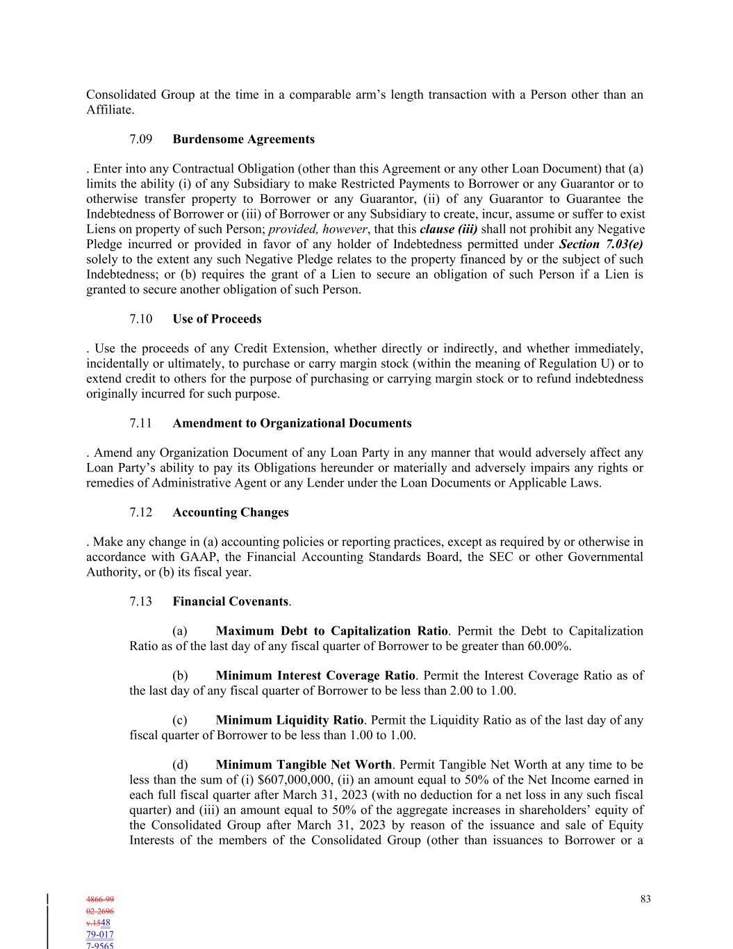 4866-99 02-2696 v.1548 79-017 7-9565 83 Consolidated Group at the time in a comparable arm’s length transaction with a Person other than an Affiliate. 7.09 Burdensome Agreements . Enter into any Contractual Obligation (other than this Agreement or any other Loan Document) that (a) limits the ability (i) of any Subsidiary to make Restricted Payments to Borrower or any Guarantor or to otherwise transfer property to Borrower or any Guarantor, (ii) of any Guarantor to Guarantee the Indebtedness of Borrower or (iii) of Borrower or any Subsidiary to create, incur, assume or suffer to exist Liens on property of such Person; provided, however, that this clause (iii) shall not prohibit any Negative Pledge incurred or provided in favor of any holder of Indebtedness permitted under Section 7.03(e) solely to the extent any such Negative Pledge relates to the property financed by or the subject of such Indebtedness; or (b) requires the grant of a Lien to secure an obligation of such Person if a Lien is granted to secure another obligation of such Person. 7.10 Use of Proceeds . Use the proceeds of any Credit Extension, whether directly or indirectly, and whether immediately, incidentally or ultimately, to purchase or carry margin stock (within the meaning of Regulation U) or to extend credit to others for the purpose of purchasing or carrying margin stock or to refund indebtedness originally incurred for such purpose. 7.11 Amendment to Organizational Documents . Amend any Organization Document of any Loan Party in any manner that would adversely affect any Loan Party’s ability to pay its Obligations hereunder or materially and adversely impairs any rights or remedies of Administrative Agent or any Lender under the Loan Documents or Applicable Laws. 7.12 Accounting Changes . Make any change in (a) accounting policies or reporting practices, except as required by or otherwise in accordance with GAAP, the Financial Accounting Standards Board, the SEC or other Governmental Authority, or (b) its fiscal year. 7.13 Financial Covenants. (a) Maximum Debt to Capitalization Ratio. Permit the Debt to Capitalization Ratio as of the last day of any fiscal quarter of Borrower to be greater than 60.00%. (b) Minimum Interest Coverage Ratio. Permit the Interest Coverage Ratio as of the last day of any fiscal quarter of Borrower to be less than 2.00 to 1.00. (c) Minimum Liquidity Ratio. Permit the Liquidity Ratio as of the last day of any fiscal quarter of Borrower to be less than 1.00 to 1.00. (d) Minimum Tangible Net Worth. Permit Tangible Net Worth at any time to be less than the sum of (i) $607,000,000, (ii) an amount equal to 50% of the Net Income earned in each full fiscal quarter after March 31, 2023 (with no deduction for a net loss in any such fiscal quarter) and (iii) an amount equal to 50% of the aggregate increases in shareholders’ equity of the Consolidated Group after March 31, 2023 by reason of the issuance and sale of Equity Interests of the members of the Consolidated Group (other than issuances to Borrower or a