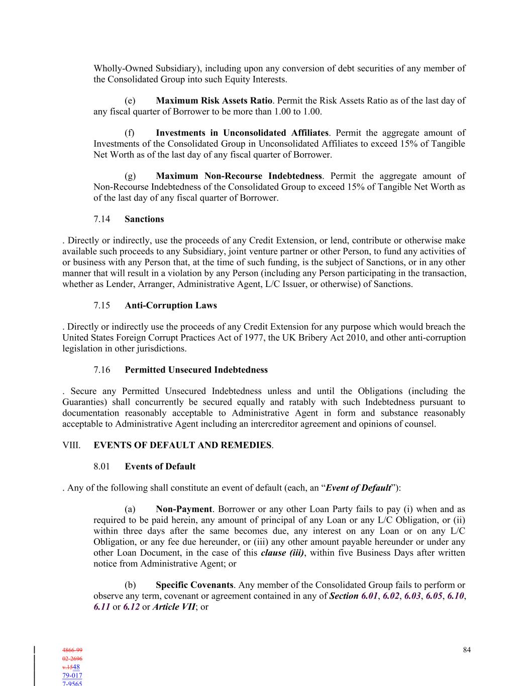 4866-99 02-2696 v.1548 79-017 7-9565 84 Wholly-Owned Subsidiary), including upon any conversion of debt securities of any member of the Consolidated Group into such Equity Interests. (e) Maximum Risk Assets Ratio. Permit the Risk Assets Ratio as of the last day of any fiscal quarter of Borrower to be more than 1.00 to 1.00. (f) Investments in Unconsolidated Affiliates. Permit the aggregate amount of Investments of the Consolidated Group in Unconsolidated Affiliates to exceed 15% of Tangible Net Worth as of the last day of any fiscal quarter of Borrower. (g) Maximum Non-Recourse Indebtedness. Permit the aggregate amount of Non-Recourse Indebtedness of the Consolidated Group to exceed 15% of Tangible Net Worth as of the last day of any fiscal quarter of Borrower. 7.14 Sanctions . Directly or indirectly, use the proceeds of any Credit Extension, or lend, contribute or otherwise make available such proceeds to any Subsidiary, joint venture partner or other Person, to fund any activities of or business with any Person that, at the time of such funding, is the subject of Sanctions, or in any other manner that will result in a violation by any Person (including any Person participating in the transaction, whether as Lender, Arranger, Administrative Agent, L/C Issuer, or otherwise) of Sanctions. 7.15 Anti-Corruption Laws . Directly or indirectly use the proceeds of any Credit Extension for any purpose which would breach the United States Foreign Corrupt Practices Act of 1977, the UK Bribery Act 2010, and other anti-corruption legislation in other jurisdictions. 7.16 Permitted Unsecured Indebtedness . Secure any Permitted Unsecured Indebtedness unless and until the Obligations (including the Guaranties) shall concurrently be secured equally and ratably with such Indebtedness pursuant to documentation reasonably acceptable to Administrative Agent in form and substance reasonably acceptable to Administrative Agent including an intercreditor agreement and opinions of counsel. VIII. EVENTS OF DEFAULT AND REMEDIES. 8.01 Events of Default . Any of the following shall constitute an event of default (each, an “Event of Default”): (a) Non-Payment. Borrower or any other Loan Party fails to pay (i) when and as required to be paid herein, any amount of principal of any Loan or any L/C Obligation, or (ii) within three days after the same becomes due, any interest on any Loan or on any L/C Obligation, or any fee due hereunder, or (iii) any other amount payable hereunder or under any other Loan Document, in the case of this clause (iii), within five Business Days after written notice from Administrative Agent; or (b) Specific Covenants. Any member of the Consolidated Group fails to perform or observe any term, covenant or agreement contained in any of Section 6.01, 6.02, 6.03, 6.05, 6.10, 6.11 or 6.12 or Article VII; or