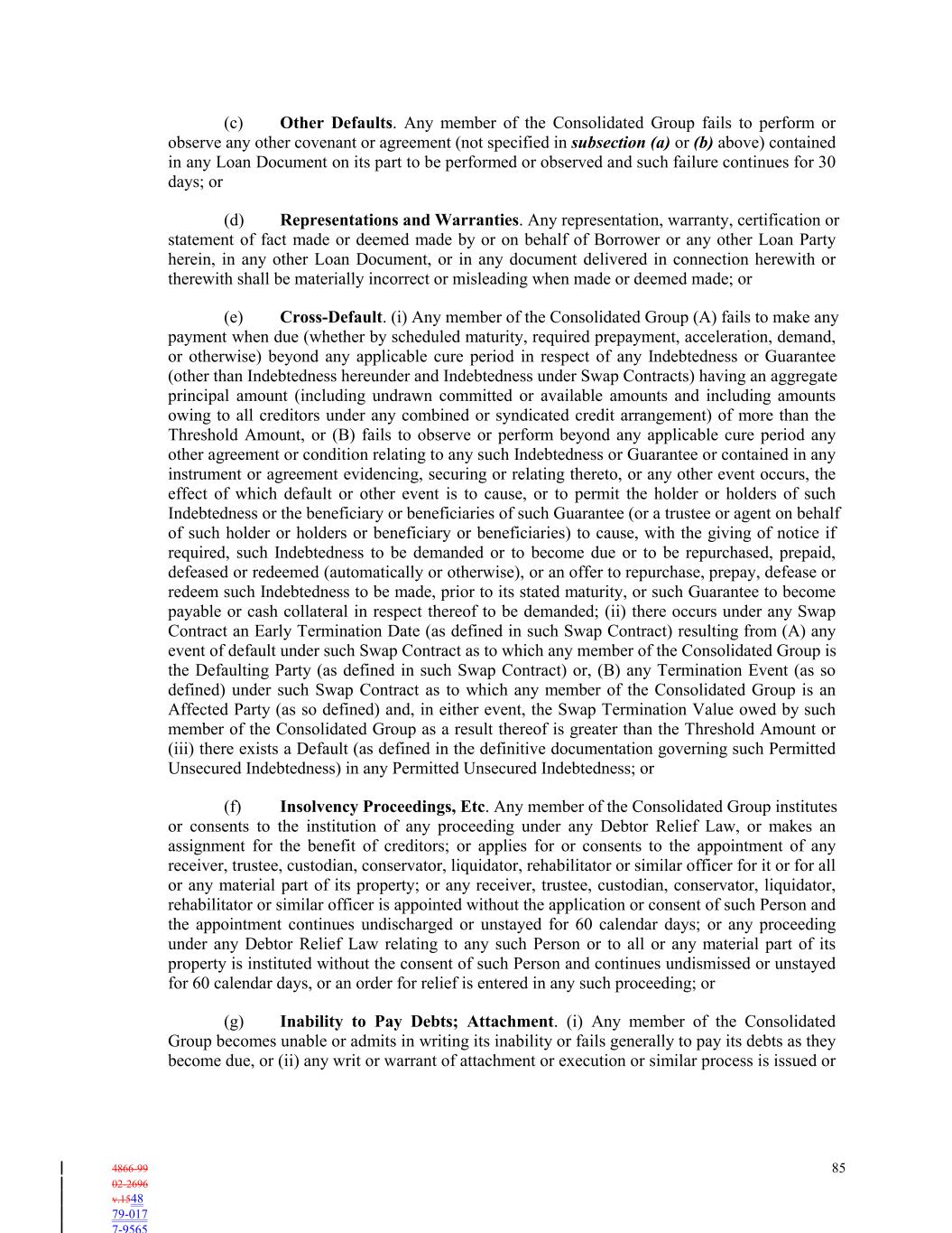 4866-99 02-2696 v.1548 79-017 7-9565 85 (c) Other Defaults. Any member of the Consolidated Group fails to perform or observe any other covenant or agreement (not specified in subsection (a) or (b) above) contained in any Loan Document on its part to be performed or observed and such failure continues for 30 days; or (d) Representations and Warranties. Any representation, warranty, certification or statement of fact made or deemed made by or on behalf of Borrower or any other Loan Party herein, in any other Loan Document, or in any document delivered in connection herewith or therewith shall be materially incorrect or misleading when made or deemed made; or (e) Cross-Default. (i) Any member of the Consolidated Group (A) fails to make any payment when due (whether by scheduled maturity, required prepayment, acceleration, demand, or otherwise) beyond any applicable cure period in respect of any Indebtedness or Guarantee (other than Indebtedness hereunder and Indebtedness under Swap Contracts) having an aggregate principal amount (including undrawn committed or available amounts and including amounts owing to all creditors under any combined or syndicated credit arrangement) of more than the Threshold Amount, or (B) fails to observe or perform beyond any applicable cure period any other agreement or condition relating to any such Indebtedness or Guarantee or contained in any instrument or agreement evidencing, securing or relating thereto, or any other event occurs, the effect of which default or other event is to cause, or to permit the holder or holders of such Indebtedness or the beneficiary or beneficiaries of such Guarantee (or a trustee or agent on behalf of such holder or holders or beneficiary or beneficiaries) to cause, with the giving of notice if required, such Indebtedness to be demanded or to become due or to be repurchased, prepaid, defeased or redeemed (automatically or otherwise), or an offer to repurchase, prepay, defease or redeem such Indebtedness to be made, prior to its stated maturity, or such Guarantee to become payable or cash collateral in respect thereof to be demanded; (ii) there occurs under any Swap Contract an Early Termination Date (as defined in such Swap Contract) resulting from (A) any event of default under such Swap Contract as to which any member of the Consolidated Group is the Defaulting Party (as defined in such Swap Contract) or, (B) any Termination Event (as so defined) under such Swap Contract as to which any member of the Consolidated Group is an Affected Party (as so defined) and, in either event, the Swap Termination Value owed by such member of the Consolidated Group as a result thereof is greater than the Threshold Amount or (iii) there exists a Default (as defined in the definitive documentation governing such Permitted Unsecured Indebtedness) in any Permitted Unsecured Indebtedness; or (f) Insolvency Proceedings, Etc. Any member of the Consolidated Group institutes or consents to the institution of any proceeding under any Debtor Relief Law, or makes an assignment for the benefit of creditors; or applies for or consents to the appointment of any receiver, trustee, custodian, conservator, liquidator, rehabilitator or similar officer for it or for all or any material part of its property; or any receiver, trustee, custodian, conservator, liquidator, rehabilitator or similar officer is appointed without the application or consent of such Person and the appointment continues undischarged or unstayed for 60 calendar days; or any proceeding under any Debtor Relief Law relating to any such Person or to all or any material part of its property is instituted without the consent of such Person and continues undismissed or unstayed for 60 calendar days, or an order for relief is entered in any such proceeding; or (g) Inability to Pay Debts; Attachment. (i) Any member of the Consolidated Group becomes unable or admits in writing its inability or fails generally to pay its debts as they become due, or (ii) any writ or warrant of attachment or execution or similar process is issued or