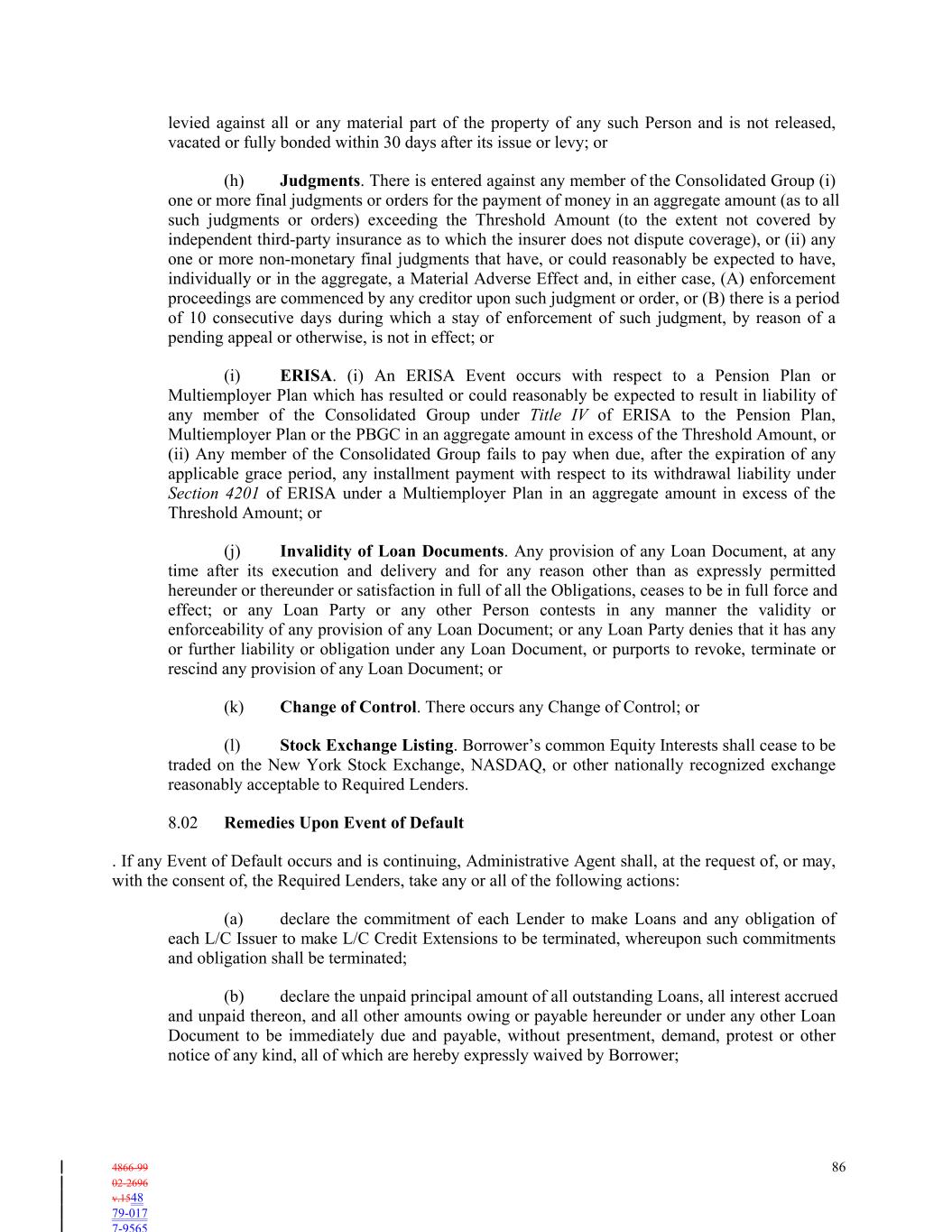 4866-99 02-2696 v.1548 79-017 7-9565 86 levied against all or any material part of the property of any such Person and is not released, vacated or fully bonded within 30 days after its issue or levy; or (h) Judgments. There is entered against any member of the Consolidated Group (i) one or more final judgments or orders for the payment of money in an aggregate amount (as to all such judgments or orders) exceeding the Threshold Amount (to the extent not covered by independent third-party insurance as to which the insurer does not dispute coverage), or (ii) any one or more non-monetary final judgments that have, or could reasonably be expected to have, individually or in the aggregate, a Material Adverse Effect and, in either case, (A) enforcement proceedings are commenced by any creditor upon such judgment or order, or (B) there is a period of 10 consecutive days during which a stay of enforcement of such judgment, by reason of a pending appeal or otherwise, is not in effect; or (i) ERISA. (i) An ERISA Event occurs with respect to a Pension Plan or Multiemployer Plan which has resulted or could reasonably be expected to result in liability of any member of the Consolidated Group under Title IV of ERISA to the Pension Plan, Multiemployer Plan or the PBGC in an aggregate amount in excess of the Threshold Amount, or (ii) Any member of the Consolidated Group fails to pay when due, after the expiration of any applicable grace period, any installment payment with respect to its withdrawal liability under Section 4201 of ERISA under a Multiemployer Plan in an aggregate amount in excess of the Threshold Amount; or (j) Invalidity of Loan Documents. Any provision of any Loan Document, at any time after its execution and delivery and for any reason other than as expressly permitted hereunder or thereunder or satisfaction in full of all the Obligations, ceases to be in full force and effect; or any Loan Party or any other Person contests in any manner the validity or enforceability of any provision of any Loan Document; or any Loan Party denies that it has any or further liability or obligation under any Loan Document, or purports to revoke, terminate or rescind any provision of any Loan Document; or (k) Change of Control. There occurs any Change of Control; or (l) Stock Exchange Listing. Borrower’s common Equity Interests shall cease to be traded on the New York Stock Exchange, NASDAQ, or other nationally recognized exchange reasonably acceptable to Required Lenders. 8.02 Remedies Upon Event of Default . If any Event of Default occurs and is continuing, Administrative Agent shall, at the request of, or may, with the consent of, the Required Lenders, take any or all of the following actions: (a) declare the commitment of each Lender to make Loans and any obligation of each L/C Issuer to make L/C Credit Extensions to be terminated, whereupon such commitments and obligation shall be terminated; (b) declare the unpaid principal amount of all outstanding Loans, all interest accrued and unpaid thereon, and all other amounts owing or payable hereunder or under any other Loan Document to be immediately due and payable, without presentment, demand, protest or other notice of any kind, all of which are hereby expressly waived by Borrower;