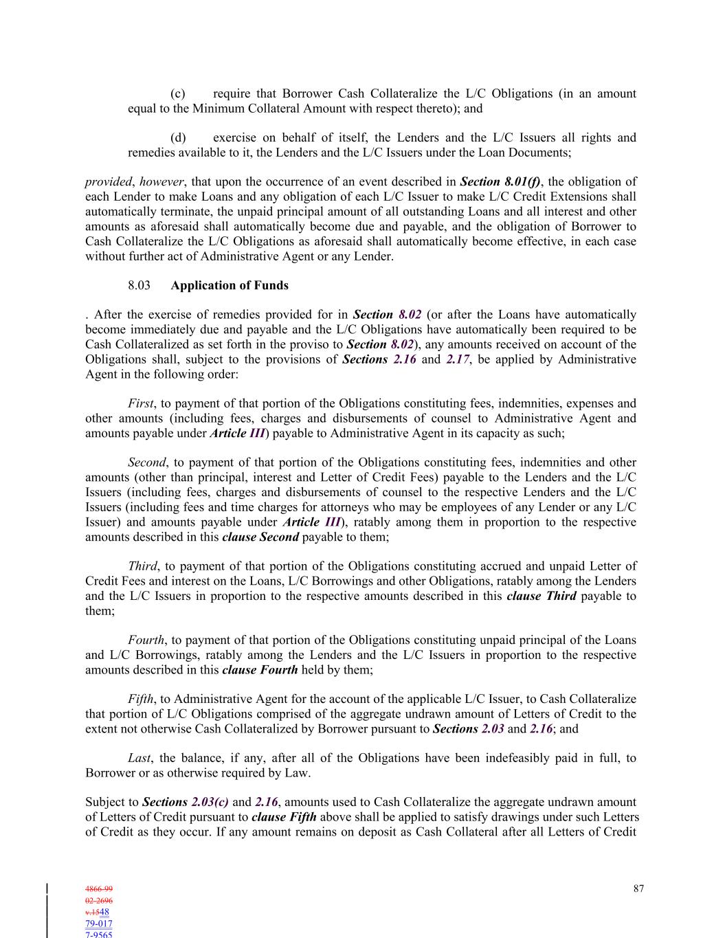 4866-99 02-2696 v.1548 79-017 7-9565 87 (c) require that Borrower Cash Collateralize the L/C Obligations (in an amount equal to the Minimum Collateral Amount with respect thereto); and (d) exercise on behalf of itself, the Lenders and the L/C Issuers all rights and remedies available to it, the Lenders and the L/C Issuers under the Loan Documents; provided, however, that upon the occurrence of an event described in Section 8.01(f), the obligation of each Lender to make Loans and any obligation of each L/C Issuer to make L/C Credit Extensions shall automatically terminate, the unpaid principal amount of all outstanding Loans and all interest and other amounts as aforesaid shall automatically become due and payable, and the obligation of Borrower to Cash Collateralize the L/C Obligations as aforesaid shall automatically become effective, in each case without further act of Administrative Agent or any Lender. 8.03 Application of Funds . After the exercise of remedies provided for in Section 8.02 (or after the Loans have automatically become immediately due and payable and the L/C Obligations have automatically been required to be Cash Collateralized as set forth in the proviso to Section 8.02), any amounts received on account of the Obligations shall, subject to the provisions of Sections 2.16 and 2.17, be applied by Administrative Agent in the following order: First, to payment of that portion of the Obligations constituting fees, indemnities, expenses and other amounts (including fees, charges and disbursements of counsel to Administrative Agent and amounts payable under Article III) payable to Administrative Agent in its capacity as such; Second, to payment of that portion of the Obligations constituting fees, indemnities and other amounts (other than principal, interest and Letter of Credit Fees) payable to the Lenders and the L/C Issuers (including fees, charges and disbursements of counsel to the respective Lenders and the L/C Issuers (including fees and time charges for attorneys who may be employees of any Lender or any L/C Issuer) and amounts payable under Article III), ratably among them in proportion to the respective amounts described in this clause Second payable to them; Third, to payment of that portion of the Obligations constituting accrued and unpaid Letter of Credit Fees and interest on the Loans, L/C Borrowings and other Obligations, ratably among the Lenders and the L/C Issuers in proportion to the respective amounts described in this clause Third payable to them; Fourth, to payment of that portion of the Obligations constituting unpaid principal of the Loans and L/C Borrowings, ratably among the Lenders and the L/C Issuers in proportion to the respective amounts described in this clause Fourth held by them; Fifth, to Administrative Agent for the account of the applicable L/C Issuer, to Cash Collateralize that portion of L/C Obligations comprised of the aggregate undrawn amount of Letters of Credit to the extent not otherwise Cash Collateralized by Borrower pursuant to Sections 2.03 and 2.16; and Last, the balance, if any, after all of the Obligations have been indefeasibly paid in full, to Borrower or as otherwise required by Law. Subject to Sections 2.03(c) and 2.16, amounts used to Cash Collateralize the aggregate undrawn amount of Letters of Credit pursuant to clause Fifth above shall be applied to satisfy drawings under such Letters of Credit as they occur. If any amount remains on deposit as Cash Collateral after all Letters of Credit