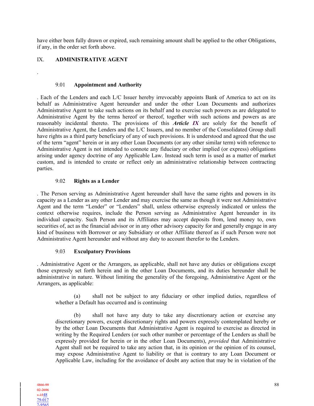 4866-99 02-2696 v.1548 79-017 7-9565 88 have either been fully drawn or expired, such remaining amount shall be applied to the other Obligations, if any, in the order set forth above. IX. ADMINISTRATIVE AGENT . 9.01 Appointment and Authority . Each of the Lenders and each L/C Issuer hereby irrevocably appoints Bank of America to act on its behalf as Administrative Agent hereunder and under the other Loan Documents and authorizes Administrative Agent to take such actions on its behalf and to exercise such powers as are delegated to Administrative Agent by the terms hereof or thereof, together with such actions and powers as are reasonably incidental thereto. The provisions of this Article IX are solely for the benefit of Administrative Agent, the Lenders and the L/C Issuers, and no member of the Consolidated Group shall have rights as a third party beneficiary of any of such provisions. It is understood and agreed that the use of the term “agent” herein or in any other Loan Documents (or any other similar term) with reference to Administrative Agent is not intended to connote any fiduciary or other implied (or express) obligations arising under agency doctrine of any Applicable Law. Instead such term is used as a matter of market custom, and is intended to create or reflect only an administrative relationship between contracting parties. 9.02 Rights as a Lender . The Person serving as Administrative Agent hereunder shall have the same rights and powers in its capacity as a Lender as any other Lender and may exercise the same as though it were not Administrative Agent and the term “Lender” or “Lenders” shall, unless otherwise expressly indicated or unless the context otherwise requires, include the Person serving as Administrative Agent hereunder in its individual capacity. Such Person and its Affiliates may accept deposits from, lend money to, own securities of, act as the financial advisor or in any other advisory capacity for and generally engage in any kind of business with Borrower or any Subsidiary or other Affiliate thereof as if such Person were not Administrative Agent hereunder and without any duty to account therefor to the Lenders. 9.03 Exculpatory Provisions . Administrative Agent or the Arrangers, as applicable, shall not have any duties or obligations except those expressly set forth herein and in the other Loan Documents, and its duties hereunder shall be administrative in nature. Without limiting the generality of the foregoing, Administrative Agent or the Arrangers, as applicable: (a) shall not be subject to any fiduciary or other implied duties, regardless of whether a Default has occurred and is continuing (b) shall not have any duty to take any discretionary action or exercise any discretionary powers, except discretionary rights and powers expressly contemplated hereby or by the other Loan Documents that Administrative Agent is required to exercise as directed in writing by the Required Lenders (or such other number or percentage of the Lenders as shall be expressly provided for herein or in the other Loan Documents), provided that Administrative Agent shall not be required to take any action that, in its opinion or the opinion of its counsel, may expose Administrative Agent to liability or that is contrary to any Loan Document or Applicable Law, including for the avoidance of doubt any action that may be in violation of the