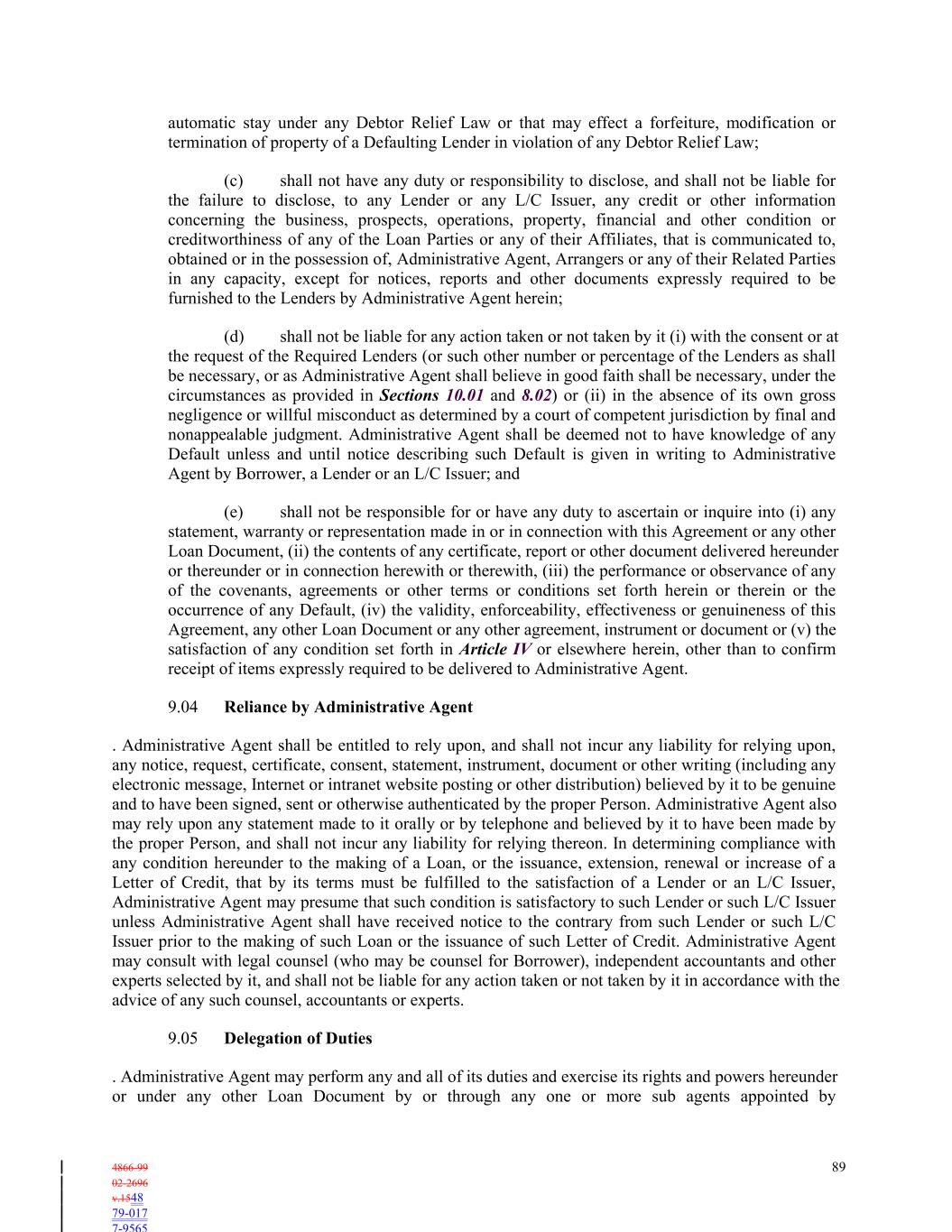 4866-99 02-2696 v.1548 79-017 7-9565 89 automatic stay under any Debtor Relief Law or that may effect a forfeiture, modification or termination of property of a Defaulting Lender in violation of any Debtor Relief Law; (c) shall not have any duty or responsibility to disclose, and shall not be liable for the failure to disclose, to any Lender or any L/C Issuer, any credit or other information concerning the business, prospects, operations, property, financial and other condition or creditworthiness of any of the Loan Parties or any of their Affiliates, that is communicated to, obtained or in the possession of, Administrative Agent, Arrangers or any of their Related Parties in any capacity, except for notices, reports and other documents expressly required to be furnished to the Lenders by Administrative Agent herein; (d) shall not be liable for any action taken or not taken by it (i) with the consent or at the request of the Required Lenders (or such other number or percentage of the Lenders as shall be necessary, or as Administrative Agent shall believe in good faith shall be necessary, under the circumstances as provided in Sections 10.01 and 8.02) or (ii) in the absence of its own gross negligence or willful misconduct as determined by a court of competent jurisdiction by final and nonappealable judgment. Administrative Agent shall be deemed not to have knowledge of any Default unless and until notice describing such Default is given in writing to Administrative Agent by Borrower, a Lender or an L/C Issuer; and (e) shall not be responsible for or have any duty to ascertain or inquire into (i) any statement, warranty or representation made in or in connection with this Agreement or any other Loan Document, (ii) the contents of any certificate, report or other document delivered hereunder or thereunder or in connection herewith or therewith, (iii) the performance or observance of any of the covenants, agreements or other terms or conditions set forth herein or therein or the occurrence of any Default, (iv) the validity, enforceability, effectiveness or genuineness of this Agreement, any other Loan Document or any other agreement, instrument or document or (v) the satisfaction of any condition set forth in Article IV or elsewhere herein, other than to confirm receipt of items expressly required to be delivered to Administrative Agent. 9.04 Reliance by Administrative Agent . Administrative Agent shall be entitled to rely upon, and shall not incur any liability for relying upon, any notice, request, certificate, consent, statement, instrument, document or other writing (including any electronic message, Internet or intranet website posting or other distribution) believed by it to be genuine and to have been signed, sent or otherwise authenticated by the proper Person. Administrative Agent also may rely upon any statement made to it orally or by telephone and believed by it to have been made by the proper Person, and shall not incur any liability for relying thereon. In determining compliance with any condition hereunder to the making of a Loan, or the issuance, extension, renewal or increase of a Letter of Credit, that by its terms must be fulfilled to the satisfaction of a Lender or an L/C Issuer, Administrative Agent may presume that such condition is satisfactory to such Lender or such L/C Issuer unless Administrative Agent shall have received notice to the contrary from such Lender or such L/C Issuer prior to the making of such Loan or the issuance of such Letter of Credit. Administrative Agent may consult with legal counsel (who may be counsel for Borrower), independent accountants and other experts selected by it, and shall not be liable for any action taken or not taken by it in accordance with the advice of any such counsel, accountants or experts. 9.05 Delegation of Duties . Administrative Agent may perform any and all of its duties and exercise its rights and powers hereunder or under any other Loan Document by or through any one or more sub agents appointed by