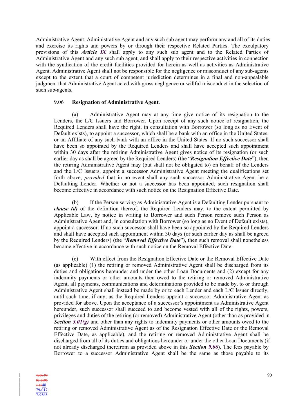 4866-99 02-2696 v.1548 79-017 7-9565 90 Administrative Agent. Administrative Agent and any such sub agent may perform any and all of its duties and exercise its rights and powers by or through their respective Related Parties. The exculpatory provisions of this Article IX shall apply to any such sub agent and to the Related Parties of Administrative Agent and any such sub agent, and shall apply to their respective activities in connection with the syndication of the credit facilities provided for herein as well as activities as Administrative Agent. Administrative Agent shall not be responsible for the negligence or misconduct of any sub-agents except to the extent that a court of competent jurisdiction determines in a final and non-appealable judgment that Administrative Agent acted with gross negligence or willful misconduct in the selection of such sub-agents. 9.06 Resignation of Administrative Agent. (a) Administrative Agent may at any time give notice of its resignation to the Lenders, the L/C Issuers and Borrower. Upon receipt of any such notice of resignation, the Required Lenders shall have the right, in consultation with Borrower (so long as no Event of Default exists), to appoint a successor, which shall be a bank with an office in the United States, or an Affiliate of any such bank with an office in the United States. If no such successor shall have been so appointed by the Required Lenders and shall have accepted such appointment within 30 days after the retiring Administrative Agent gives notice of its resignation (or such earlier day as shall be agreed by the Required Lenders) (the “Resignation Effective Date”), then the retiring Administrative Agent may (but shall not be obligated to) on behalf of the Lenders and the L/C Issuers, appoint a successor Administrative Agent meeting the qualifications set forth above, provided that in no event shall any such successor Administrative Agent be a Defaulting Lender. Whether or not a successor has been appointed, such resignation shall become effective in accordance with such notice on the Resignation Effective Date. (b) If the Person serving as Administrative Agent is a Defaulting Lender pursuant to clause (d) of the definition thereof, the Required Lenders may, to the extent permitted by Applicable Law, by notice in writing to Borrower and such Person remove such Person as Administrative Agent and, in consultation with Borrower (so long as no Event of Default exists), appoint a successor. If no such successor shall have been so appointed by the Required Lenders and shall have accepted such appointment within 30 days (or such earlier day as shall be agreed by the Required Lenders) (the “Removal Effective Date”), then such removal shall nonetheless become effective in accordance with such notice on the Removal Effective Date. (c) With effect from the Resignation Effective Date or the Removal Effective Date (as applicable) (1) the retiring or removed Administrative Agent shall be discharged from its duties and obligations hereunder and under the other Loan Documents and (2) except for any indemnity payments or other amounts then owed to the retiring or removed Administrative Agent, all payments, communications and determinations provided to be made by, to or through Administrative Agent shall instead be made by or to each Lender and each L/C Issuer directly, until such time, if any, as the Required Lenders appoint a successor Administrative Agent as provided for above. Upon the acceptance of a successor’s appointment as Administrative Agent hereunder, such successor shall succeed to and become vested with all of the rights, powers, privileges and duties of the retiring (or removed) Administrative Agent (other than as provided in Section 3.01(g) and other than any rights to indemnity payments or other amounts owed to the retiring or removed Administrative Agent as of the Resignation Effective Date or the Removal Effective Date, as applicable), and the retiring or removed Administrative Agent shall be discharged from all of its duties and obligations hereunder or under the other Loan Documents (if not already discharged therefrom as provided above in this Section 9.06). The fees payable by Borrower to a successor Administrative Agent shall be the same as those payable to its