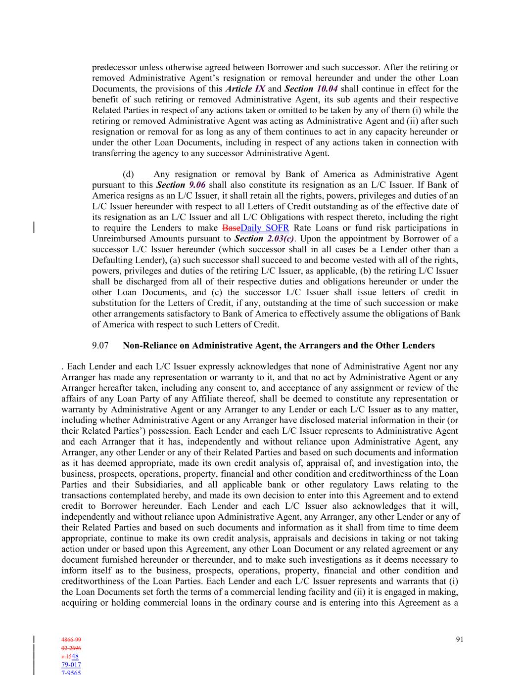 4866-99 02-2696 v.1548 79-017 7-9565 91 predecessor unless otherwise agreed between Borrower and such successor. After the retiring or removed Administrative Agent’s resignation or removal hereunder and under the other Loan Documents, the provisions of this Article IX and Section 10.04 shall continue in effect for the benefit of such retiring or removed Administrative Agent, its sub agents and their respective Related Parties in respect of any actions taken or omitted to be taken by any of them (i) while the retiring or removed Administrative Agent was acting as Administrative Agent and (ii) after such resignation or removal for as long as any of them continues to act in any capacity hereunder or under the other Loan Documents, including in respect of any actions taken in connection with transferring the agency to any successor Administrative Agent. (d) Any resignation or removal by Bank of America as Administrative Agent pursuant to this Section 9.06 shall also constitute its resignation as an L/C Issuer. If Bank of America resigns as an L/C Issuer, it shall retain all the rights, powers, privileges and duties of an L/C Issuer hereunder with respect to all Letters of Credit outstanding as of the effective date of its resignation as an L/C Issuer and all L/C Obligations with respect thereto, including the right to require the Lenders to make BaseDaily SOFR Rate Loans or fund risk participations in Unreimbursed Amounts pursuant to Section 2.03(c). Upon the appointment by Borrower of a successor L/C Issuer hereunder (which successor shall in all cases be a Lender other than a Defaulting Lender), (a) such successor shall succeed to and become vested with all of the rights, powers, privileges and duties of the retiring L/C Issuer, as applicable, (b) the retiring L/C Issuer shall be discharged from all of their respective duties and obligations hereunder or under the other Loan Documents, and (c) the successor L/C Issuer shall issue letters of credit in substitution for the Letters of Credit, if any, outstanding at the time of such succession or make other arrangements satisfactory to Bank of America to effectively assume the obligations of Bank of America with respect to such Letters of Credit. 9.07 Non-Reliance on Administrative Agent, the Arrangers and the Other Lenders . Each Lender and each L/C Issuer expressly acknowledges that none of Administrative Agent nor any Arranger has made any representation or warranty to it, and that no act by Administrative Agent or any Arranger hereafter taken, including any consent to, and acceptance of any assignment or review of the affairs of any Loan Party of any Affiliate thereof, shall be deemed to constitute any representation or warranty by Administrative Agent or any Arranger to any Lender or each L/C Issuer as to any matter, including whether Administrative Agent or any Arranger have disclosed material information in their (or their Related Parties’) possession. Each Lender and each L/C Issuer represents to Administrative Agent and each Arranger that it has, independently and without reliance upon Administrative Agent, any Arranger, any other Lender or any of their Related Parties and based on such documents and information as it has deemed appropriate, made its own credit analysis of, appraisal of, and investigation into, the business, prospects, operations, property, financial and other condition and creditworthiness of the Loan Parties and their Subsidiaries, and all applicable bank or other regulatory Laws relating to the transactions contemplated hereby, and made its own decision to enter into this Agreement and to extend credit to Borrower hereunder. Each Lender and each L/C Issuer also acknowledges that it will, independently and without reliance upon Administrative Agent, any Arranger, any other Lender or any of their Related Parties and based on such documents and information as it shall from time to time deem appropriate, continue to make its own credit analysis, appraisals and decisions in taking or not taking action under or based upon this Agreement, any other Loan Document or any related agreement or any document furnished hereunder or thereunder, and to make such investigations as it deems necessary to inform itself as to the business, prospects, operations, property, financial and other condition and creditworthiness of the Loan Parties. Each Lender and each L/C Issuer represents and warrants that (i) the Loan Documents set forth the terms of a commercial lending facility and (ii) it is engaged in making, acquiring or holding commercial loans in the ordinary course and is entering into this Agreement as a