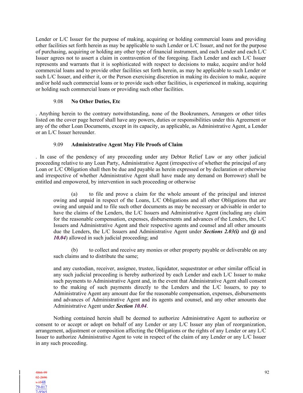 4866-99 02-2696 v.1548 79-017 7-9565 92 Lender or L/C Issuer for the purpose of making, acquiring or holding commercial loans and providing other facilities set forth herein as may be applicable to such Lender or L/C Issuer, and not for the purpose of purchasing, acquiring or holding any other type of financial instrument, and each Lender and each L/C Issuer agrees not to assert a claim in contravention of the foregoing. Each Lender and each L/C Issuer represents and warrants that it is sophisticated with respect to decisions to make, acquire and/or hold commercial loans and to provide other facilities set forth herein, as may be applicable to such Lender or such L/C Issuer, and either it, or the Person exercising discretion in making its decision to make, acquire and/or hold such commercial loans or to provide such other facilities, is experienced in making, acquiring or holding such commercial loans or providing such other facilities. 9.08 No Other Duties, Etc . Anything herein to the contrary notwithstanding, none of the Bookrunners, Arrangers or other titles listed on the cover page hereof shall have any powers, duties or responsibilities under this Agreement or any of the other Loan Documents, except in its capacity, as applicable, as Administrative Agent, a Lender or an L/C Issuer hereunder. 9.09 Administrative Agent May File Proofs of Claim . In case of the pendency of any proceeding under any Debtor Relief Law or any other judicial proceeding relative to any Loan Party, Administrative Agent (irrespective of whether the principal of any Loan or L/C Obligation shall then be due and payable as herein expressed or by declaration or otherwise and irrespective of whether Administrative Agent shall have made any demand on Borrower) shall be entitled and empowered, by intervention in such proceeding or otherwise (a) to file and prove a claim for the whole amount of the principal and interest owing and unpaid in respect of the Loans, L/C Obligations and all other Obligations that are owing and unpaid and to file such other documents as may be necessary or advisable in order to have the claims of the Lenders, the L/C Issuers and Administrative Agent (including any claim for the reasonable compensation, expenses, disbursements and advances of the Lenders, the L/C Issuers and Administrative Agent and their respective agents and counsel and all other amounts due the Lenders, the L/C Issuers and Administrative Agent under Sections 2.03(i) and (j) and 10.04) allowed in such judicial proceeding; and (b) to collect and receive any monies or other property payable or deliverable on any such claims and to distribute the same; and any custodian, receiver, assignee, trustee, liquidator, sequestrator or other similar official in any such judicial proceeding is hereby authorized by each Lender and each L/C Issuer to make such payments to Administrative Agent and, in the event that Administrative Agent shall consent to the making of such payments directly to the Lenders and the L/C Issuers, to pay to Administrative Agent any amount due for the reasonable compensation, expenses, disbursements and advances of Administrative Agent and its agents and counsel, and any other amounts due Administrative Agent under Section 10.04. Nothing contained herein shall be deemed to authorize Administrative Agent to authorize or consent to or accept or adopt on behalf of any Lender or any L/C Issuer any plan of reorganization, arrangement, adjustment or composition affecting the Obligations or the rights of any Lender or any L/C Issuer to authorize Administrative Agent to vote in respect of the claim of any Lender or any L/C Issuer in any such proceeding.
